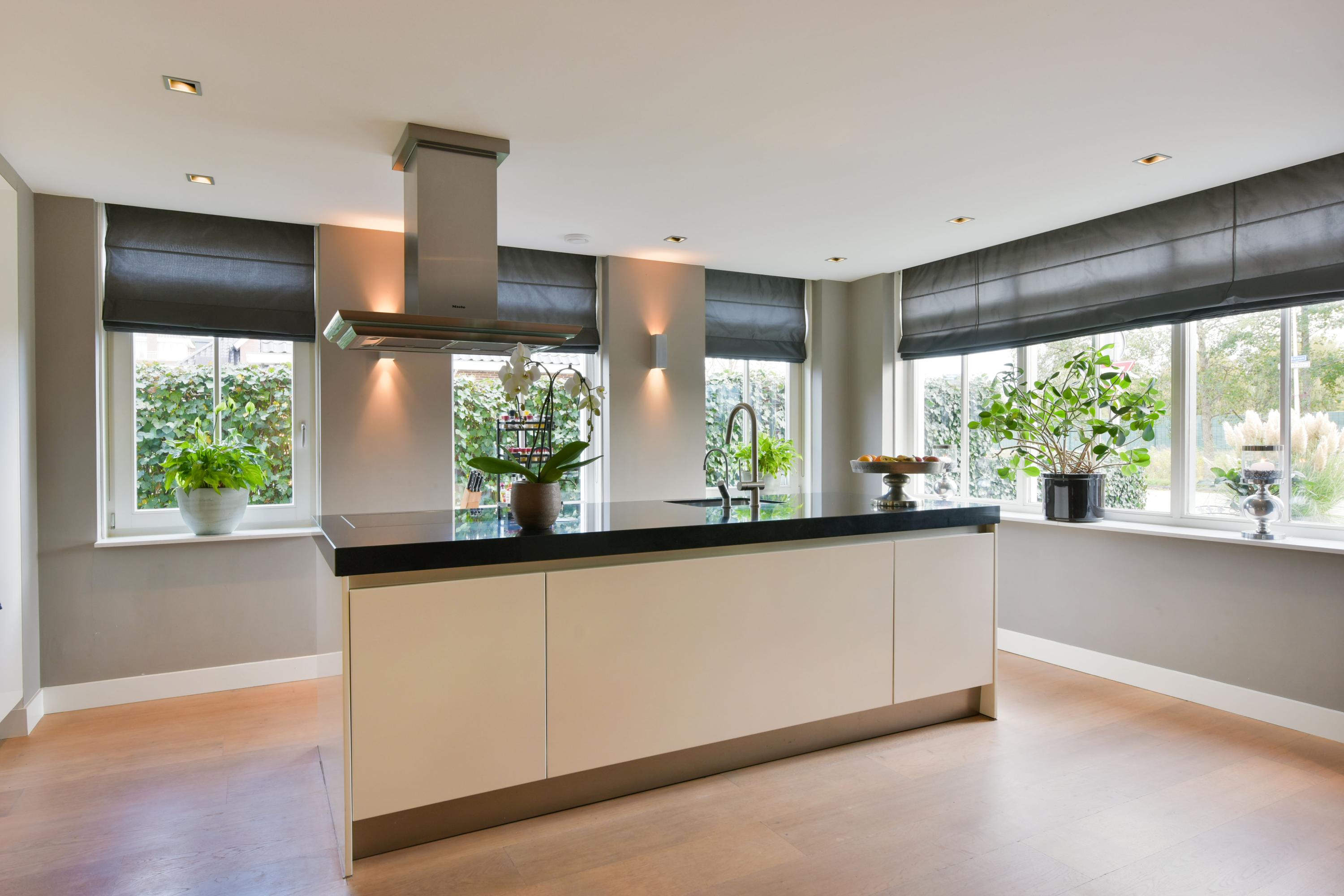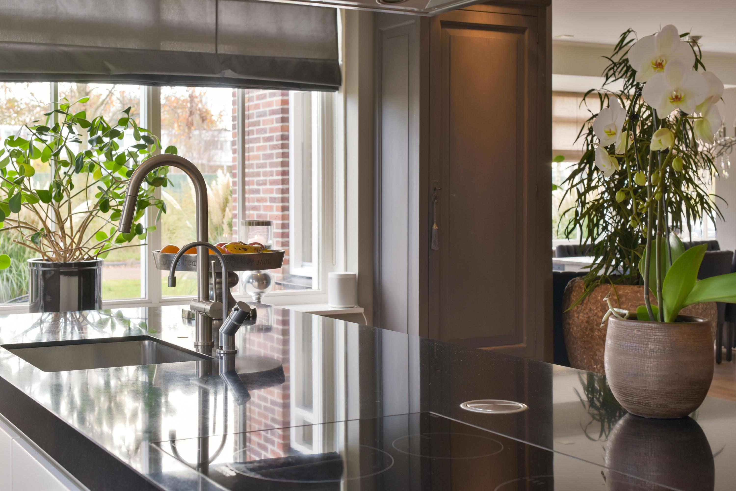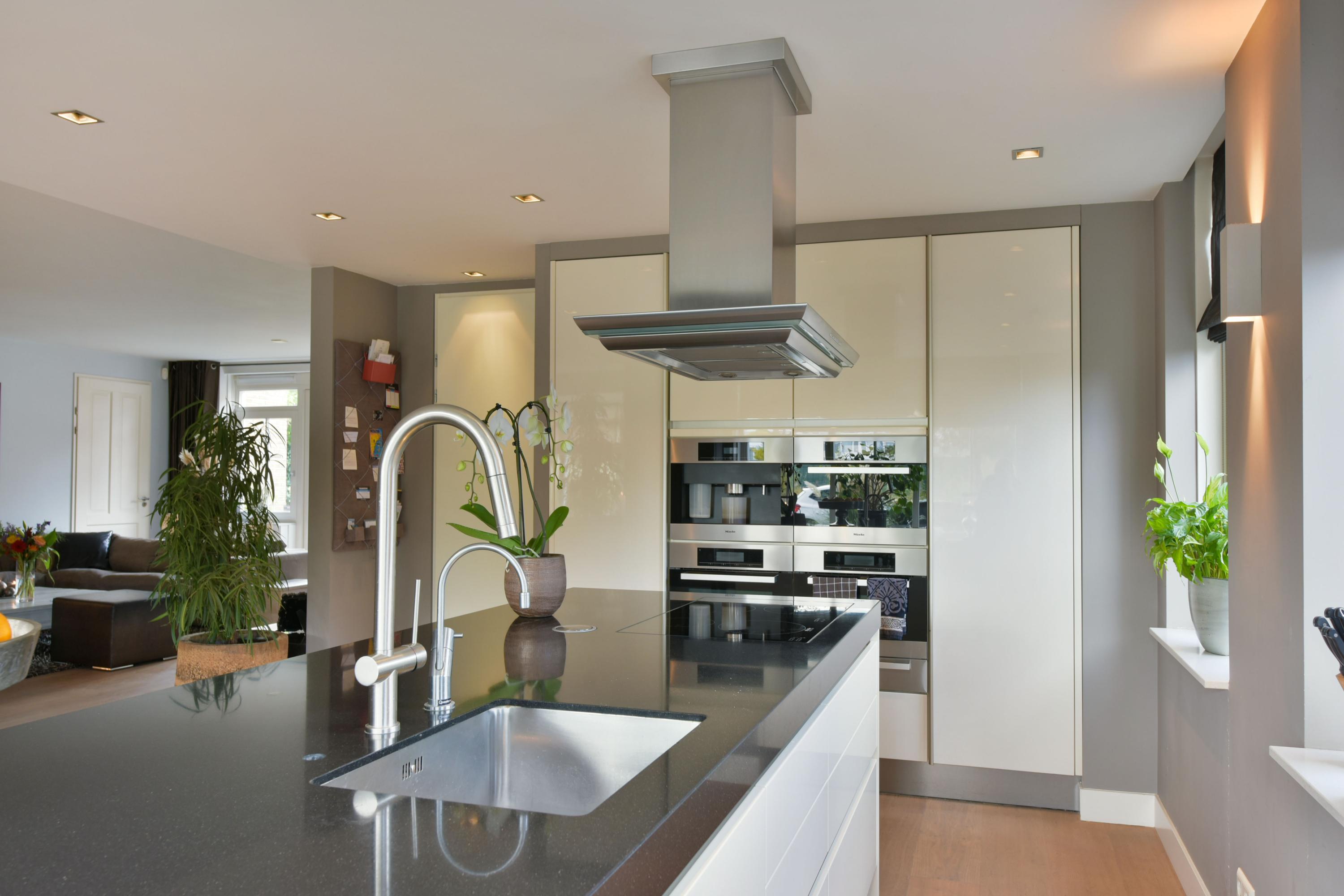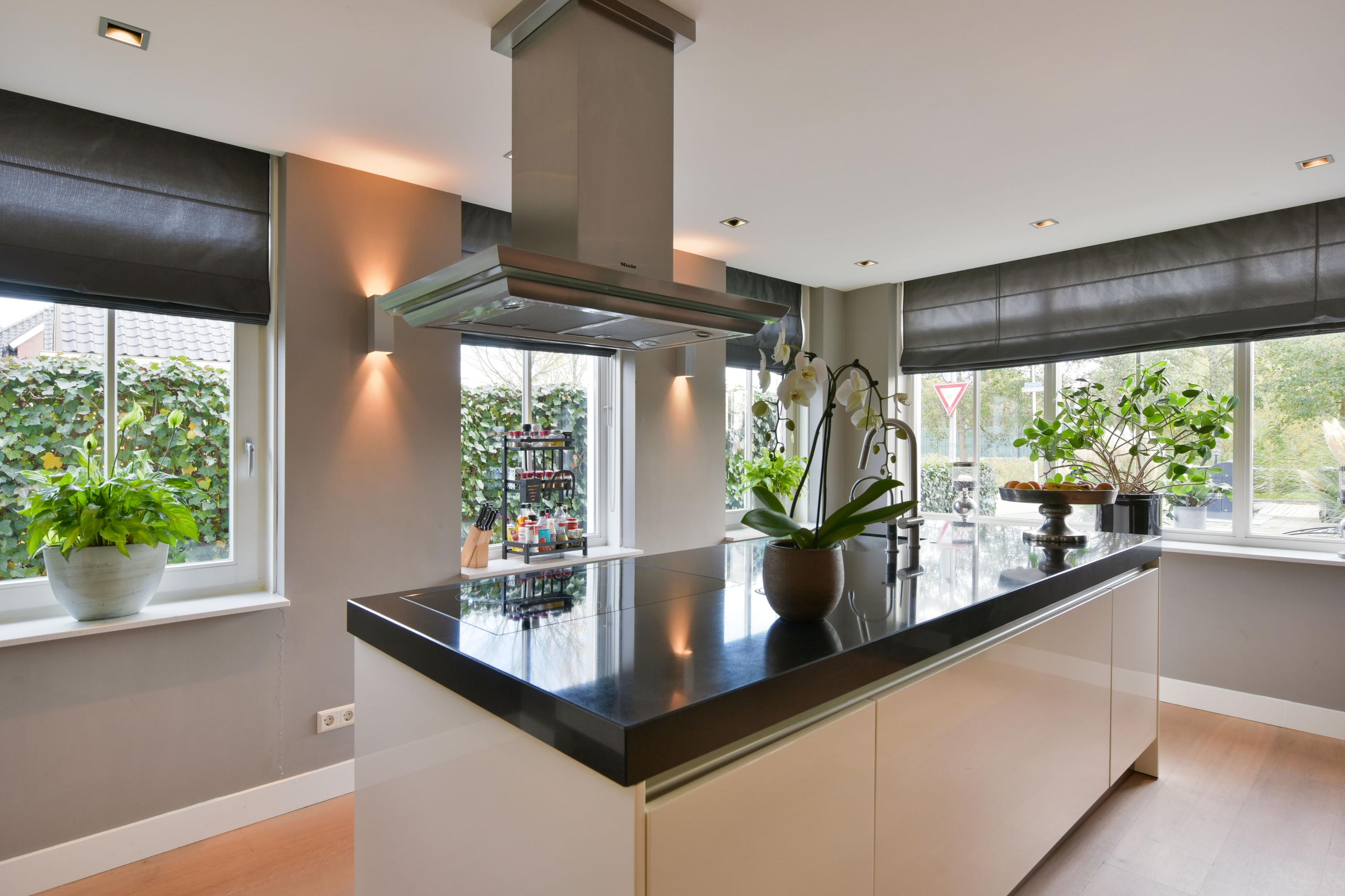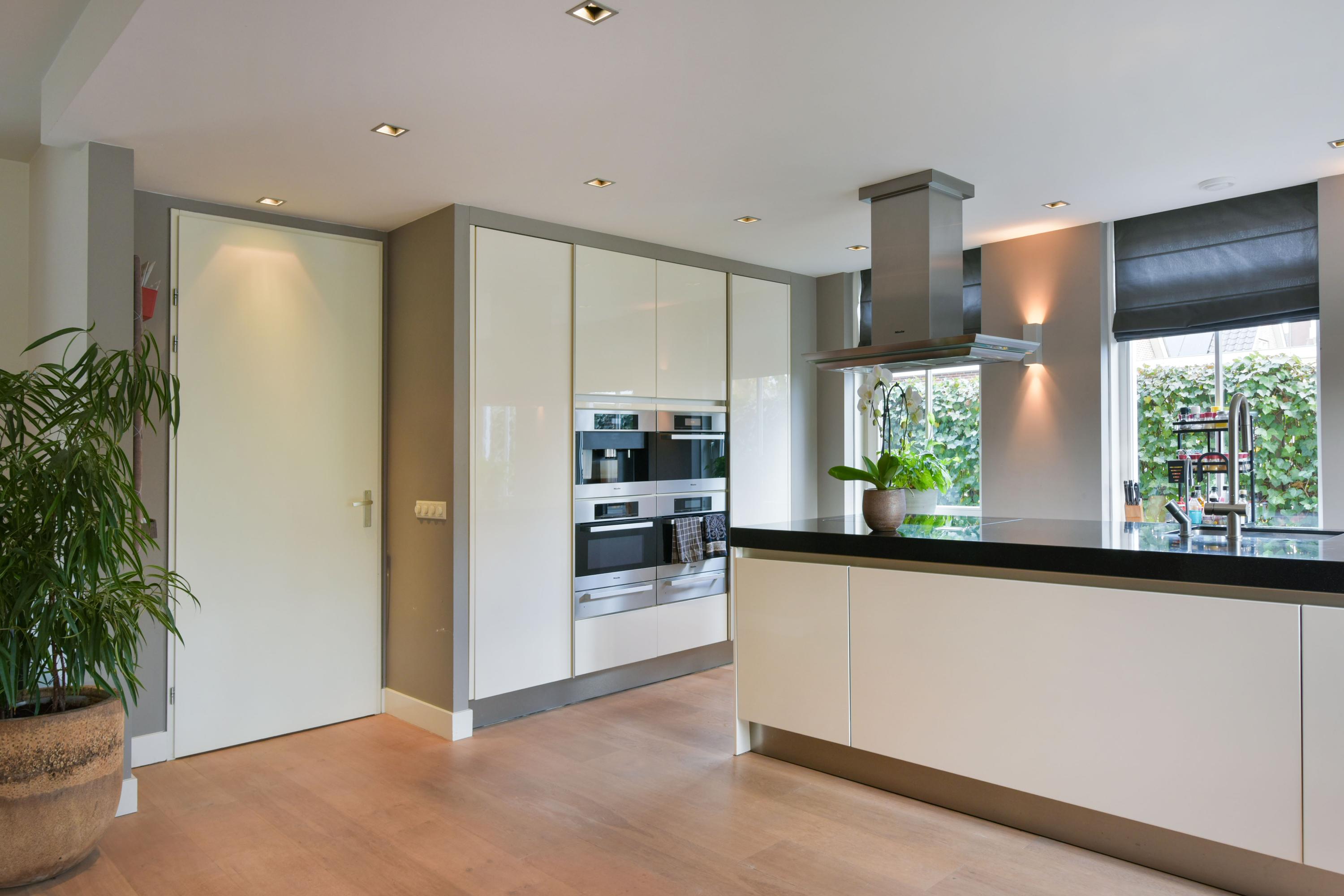 Step into the spacious living room, and you are struck by its light-filled character. The many windows allow natural light to flood in, creating a seamless connection between inside and outside. At the front of the house is the dining room with a charming bay window – a perfect spot to enjoy the morning sun at breakfast or host cozy dinners. The heart of the home features the open kitchen, with a large cooking island and cabinets on both sides offering everything a home chef could wish for. The kitchen is equipped with an induction hob, extractor hood, dishwasher, and Quooker. The tall cabinet wall houses a fridge-freezer, coffee machine, steam oven, and two combination ovens with warming drawers – everything within easy reach.