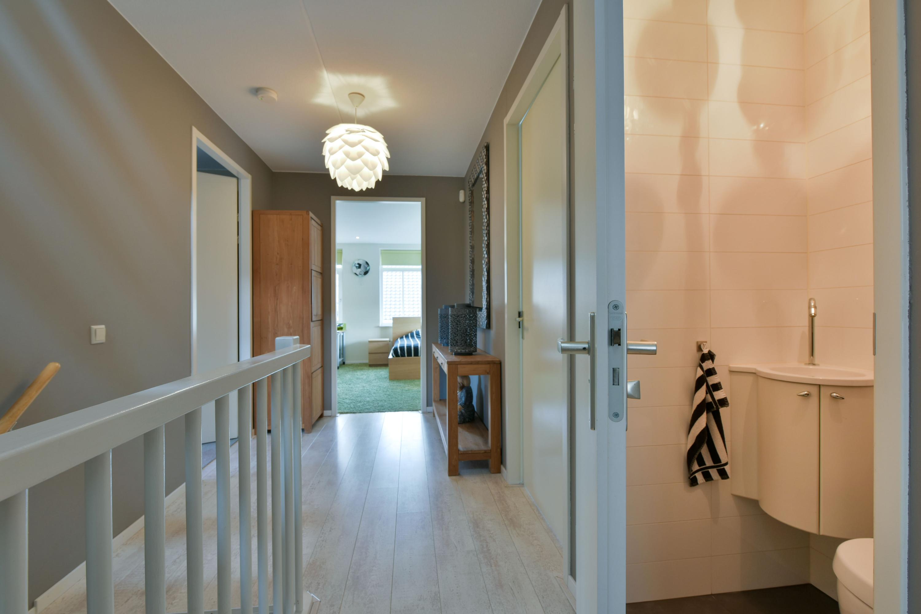 On the first floor, a spacious landing provides access to three bright and comfortable bedrooms. The master bedroom feels like a true retreat – generous and serene – while the side bedroom with a bay window and the third front-facing bedroom are flexible in use, ideal for children, guests, or a home office. The bathroom is a place of relaxation: a shower with both hand and rain shower, a bathtub, a double vanity, and subtle recessed lighting create a luxurious atmosphere. A separate toilet completes the floor.