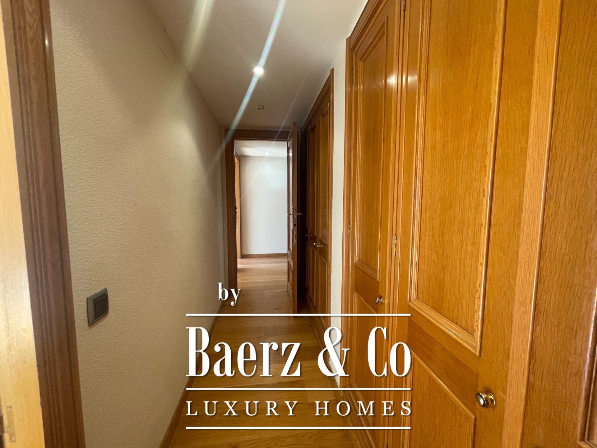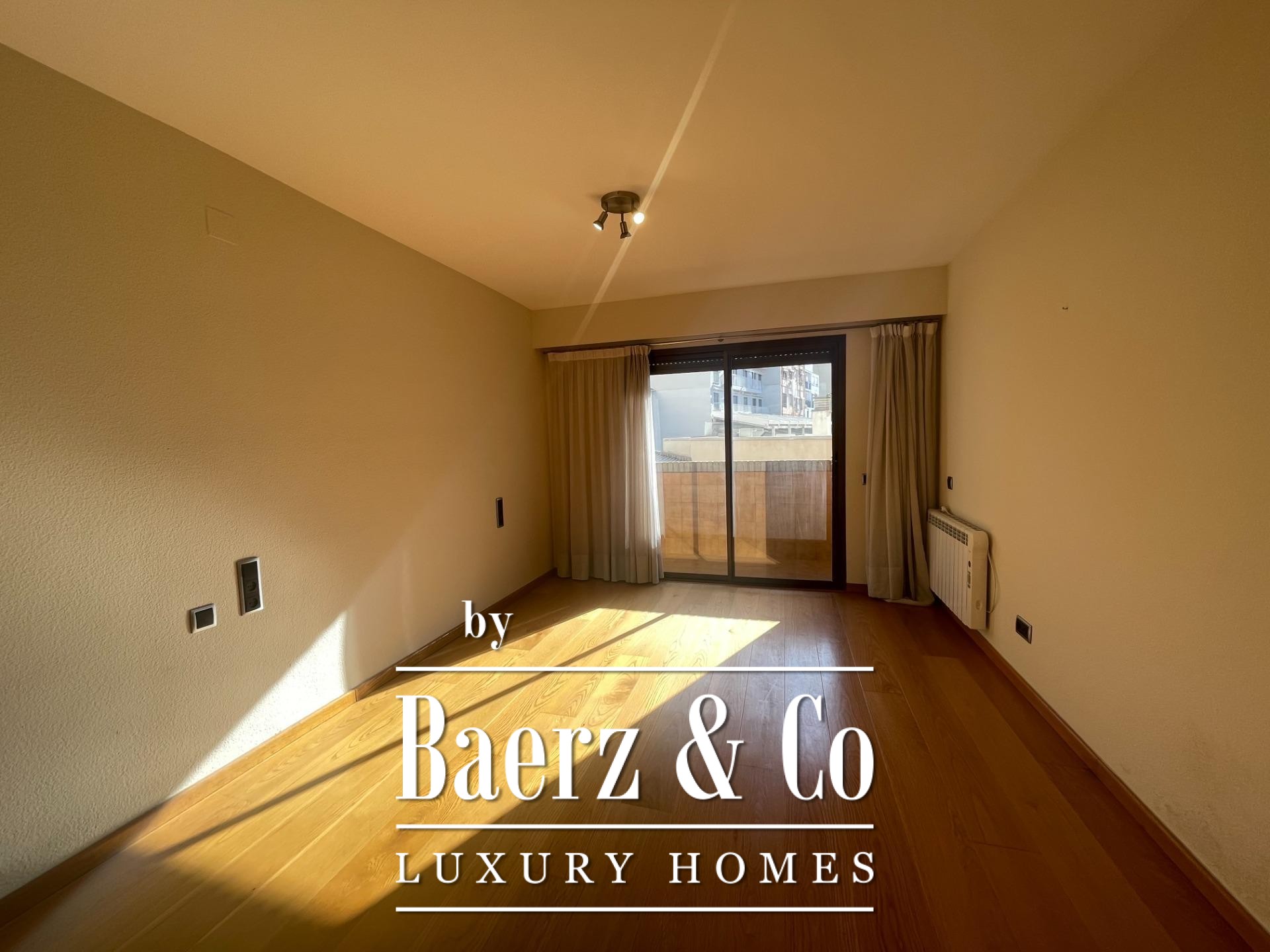 The kitchen is both spacious and functional, offering room for informal dining and access to an interior terrace. Marble floors accentuate the entrance and common areas, while oak and wooden floors in the living room and bedrooms bring warmth and subtlety. The apartment is fitted with ducted air conditioning for year-round comfort and features internal oak woodwork. A parking space in the building elevates convenience.