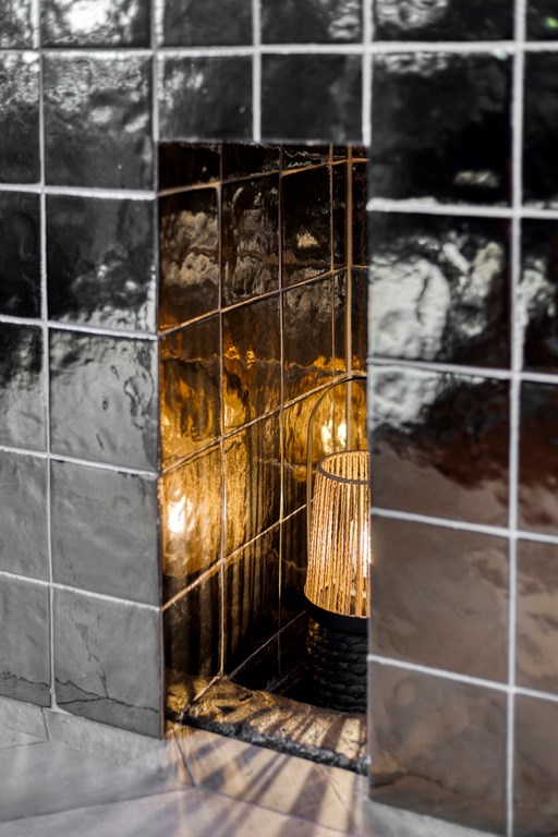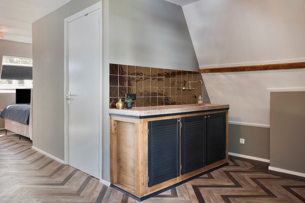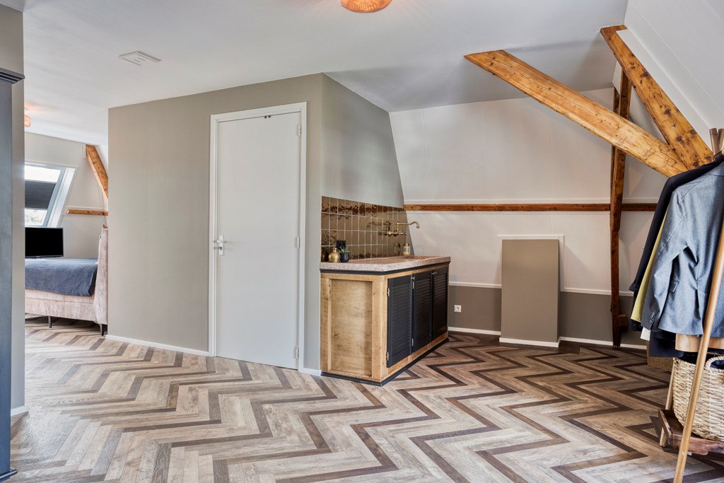 The second floor surprises with a generous, open space and a distinctive layout. The warm ambiance stands out immediately thanks to the fine flooring and the exposed wooden trusses that give this level its unique character and inviting feel. The floor is arranged so that the sleeping area, lounge corner, and work/study area flow into one another. This level also features its own pantry with original terrazzo countertop and a private bathroom, elegantly finished with wood-look floor tiles, white wall tiles, and black beam accents. The bathroom includes a walk-in rain shower, wall-hung toilet, and another vessel basin set on a robust oak top with integrated tap. A wonderfully luxurious addition, making this floor perfect as a home office, self-contained (guest) suite, a loft for one of your children, or your expansive master retreat!