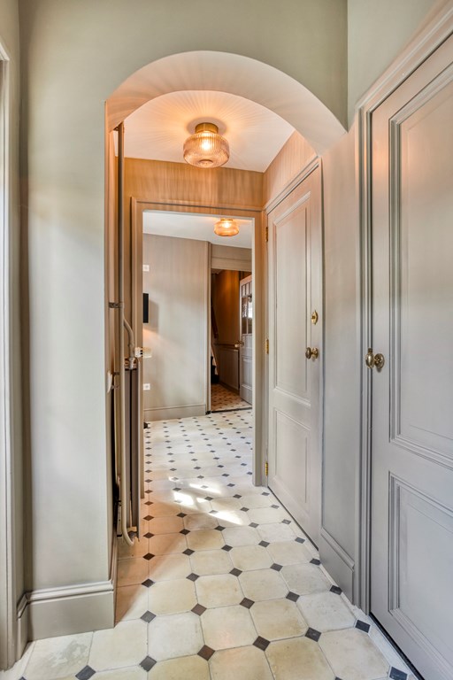 The spacious living room—where the beautiful solid oak herringbone (Hungarian point) floor, tall windows with original shutters, designer custom radiators, and high beamed ceiling immediately catch the eye—perfectly blends modern and classic. The front sitting room is cosy and bright, while the garden-facing dining room also features an original mantel, as does the sitting area. Through the light corridor—past the WC and a storage cupboard with laundry connections—you reach the kitchen. The kitchen itself marries classic and modern, fully equipped with built-in appliances including an induction hob, decorative canopy extractor, oven, and dishwasher. Behind the kitchen is a practical storage room with the fridge–freezer and central heating installation, concealed behind beautiful custom loft doors. A loft ladder provides access to the storage attic, offering plenty of additional space. The entire ground floor is impeccably maintained, finished down to the smallest details, and ready for many years of living and/or working pleasure.