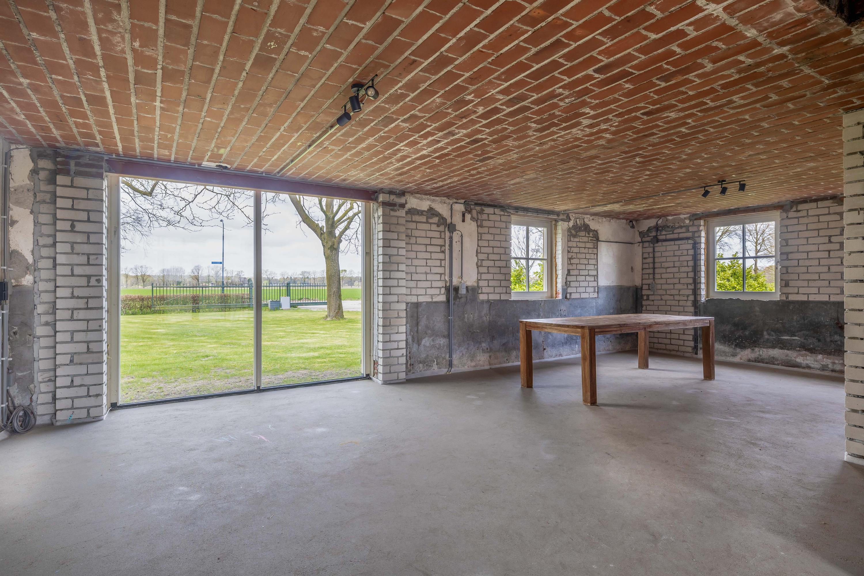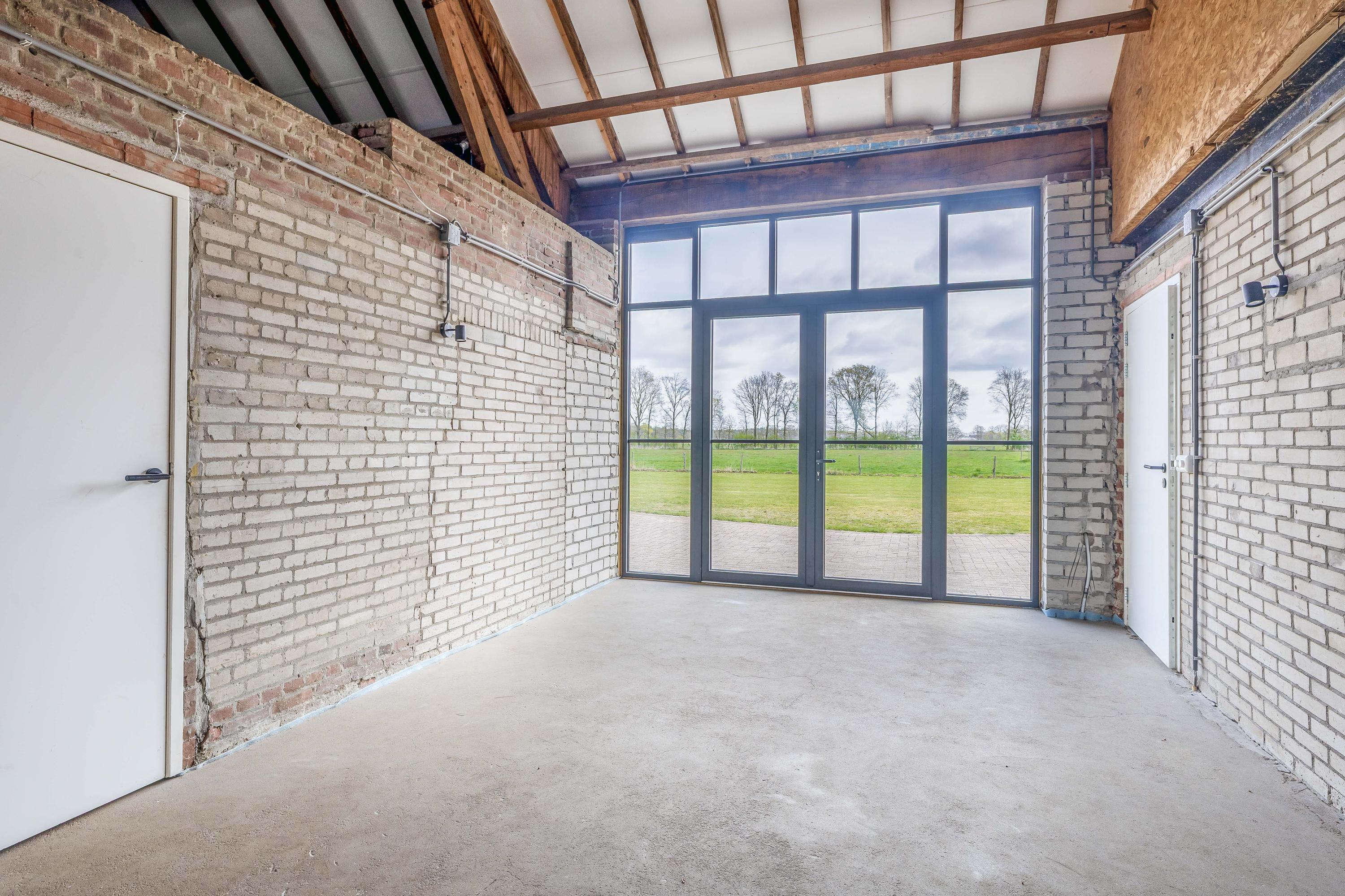 Adjacent to this is the indoor rear annex which, alongside the indoor garage, offers a considerable amount of additional usable space. This forms a solid foundation and was designed with versatility in mind. The rear annex is therefore ideally suited to a variety of uses, such as independent living accommodation (informal care), an office or practice space with meeting facilities, or a comfortable guest house. The space features a refurbished concrete floor with underfloor heating, brick walls and exposed wooden beams that enhance the rustic atmosphere. Part of the space has a mezzanine, and there is plenty of natural light. French doors in the rear façade provide a direct connection to the garden. There is also a separate toilet with a wall-hung toilet and washbasin. The rear annex also provides access to the built-in garage. The garage is accessible from the courtyard via a wide entrance door.
