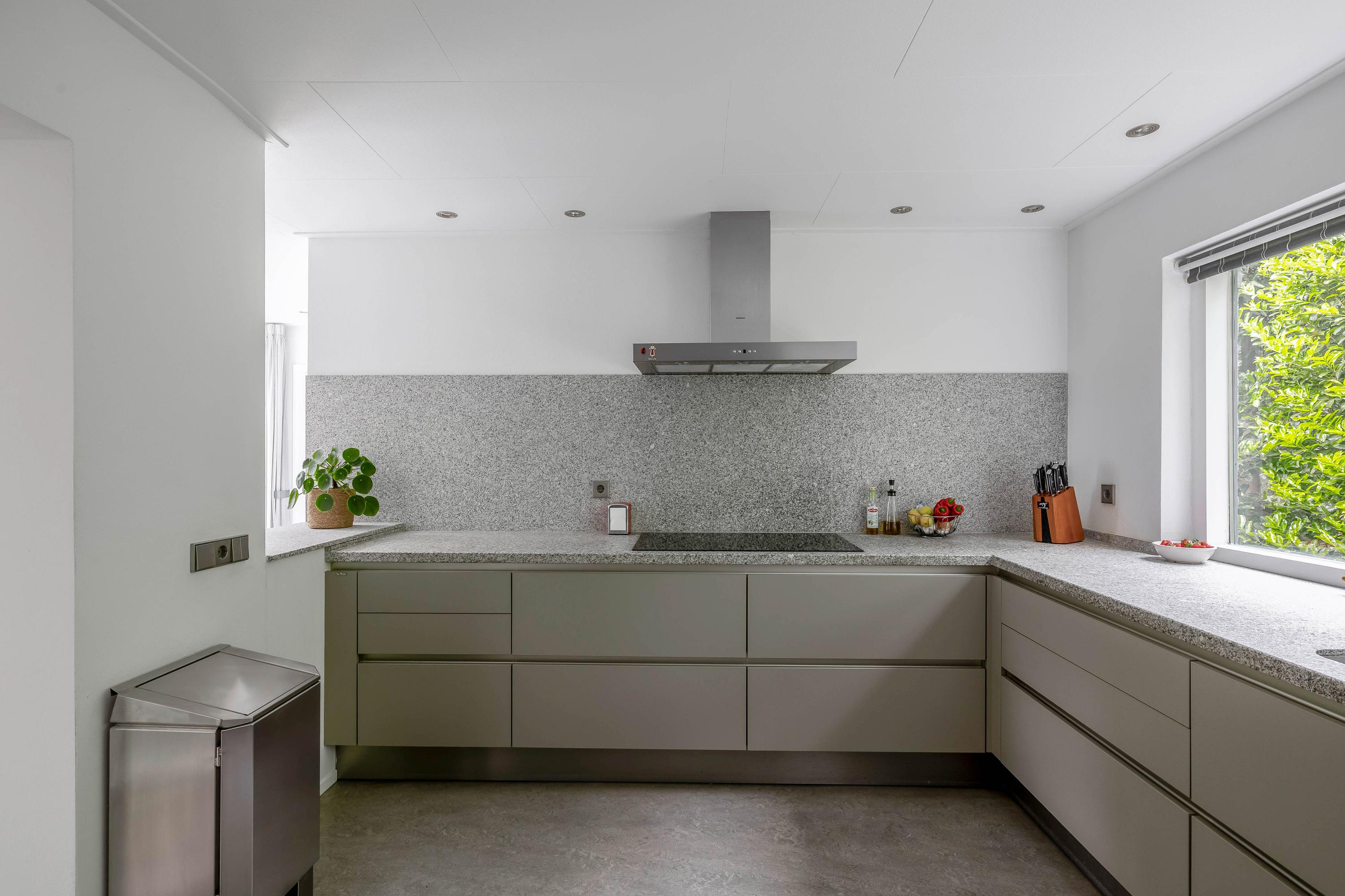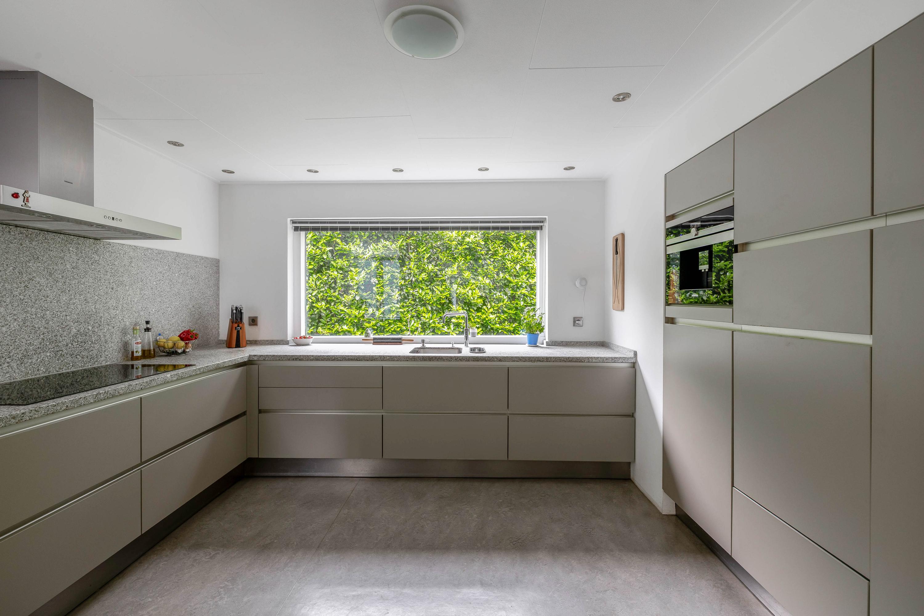 The semi-open, handle-free Siematic kitchen is a dream for any home cook. The kitchen is equipped with a burnt granite countertop, sink with a Fusion Quooker tap, extractor hood, a 5-burner induction hob (11kW), and a wall unit with Home Connect combi-oven, two refrigerators, a fully automatic coffee machine with many