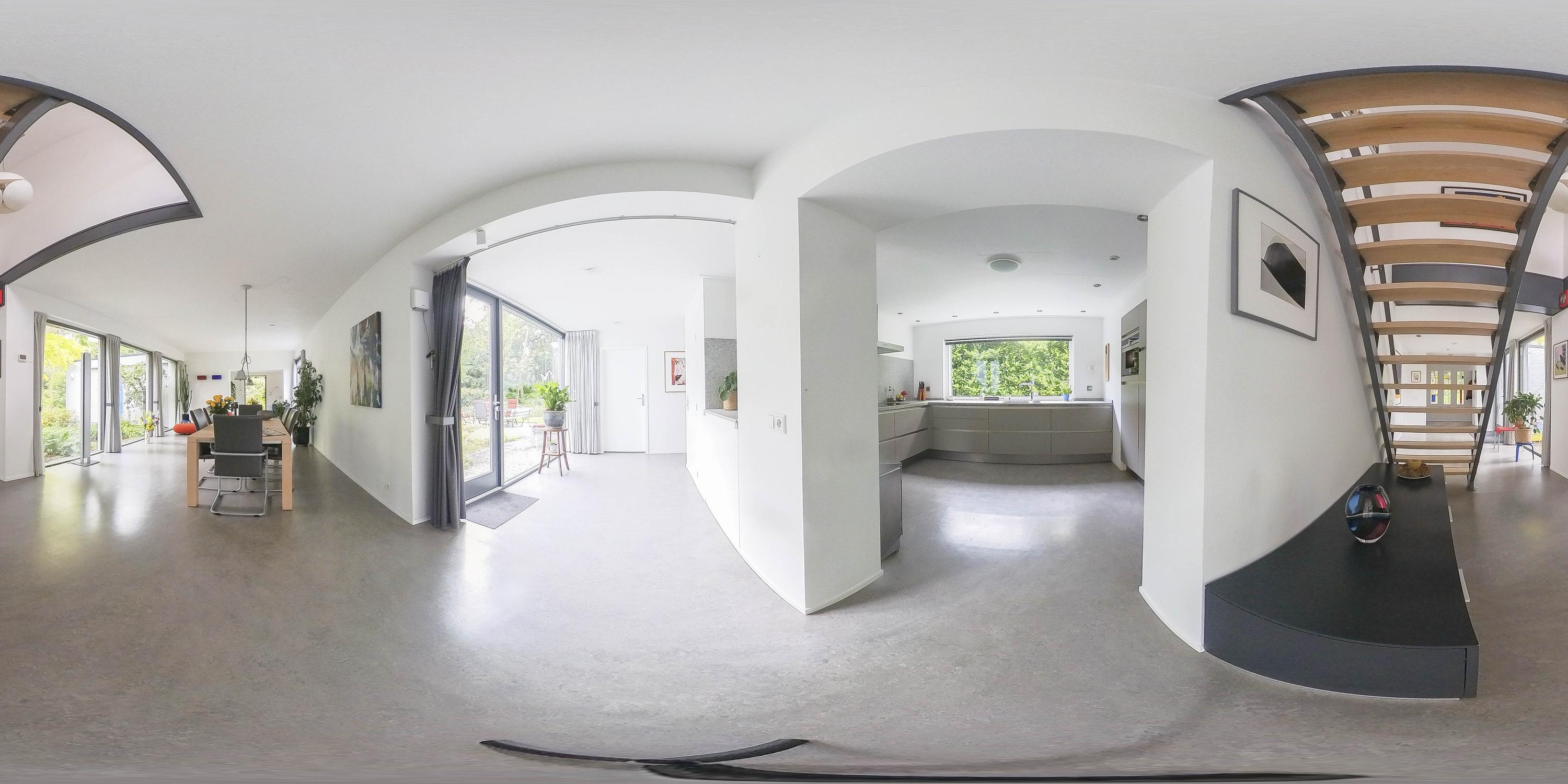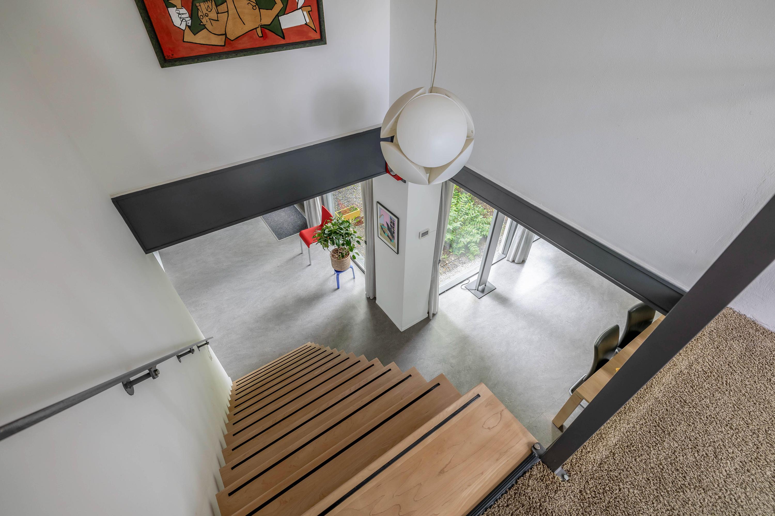The open passageway from the entrance hall leads you to the bright and spacious living room. This is finished with sleek stucco on the walls and the large windows to floor level offer a view of the patio garden. The floors are equipped with underfloor heating and cooling, ensuring a pleasant climate in every season. An eye-catcher in the living room is the open staircase made of maple wood and steel leading to the upper floor.