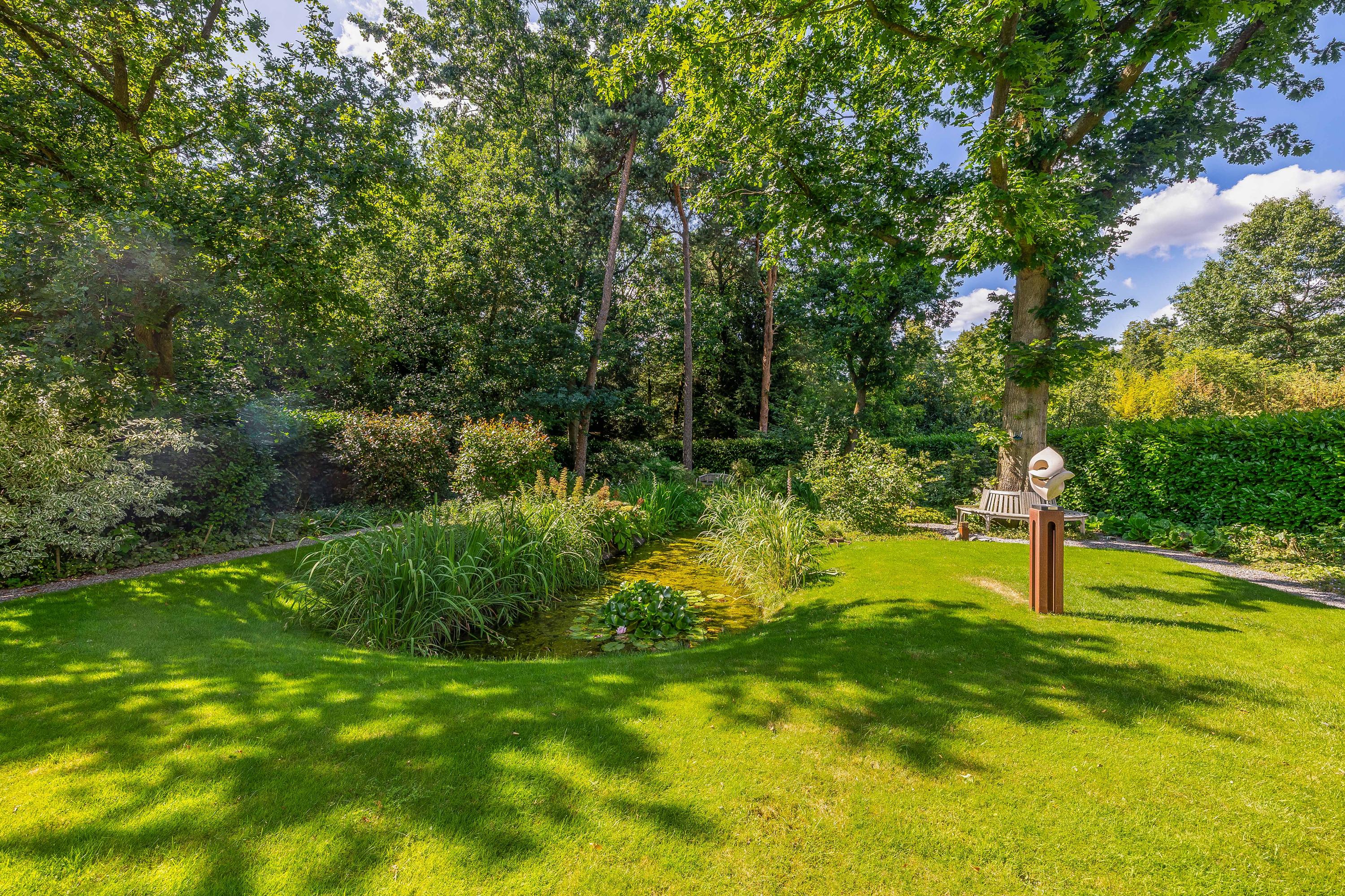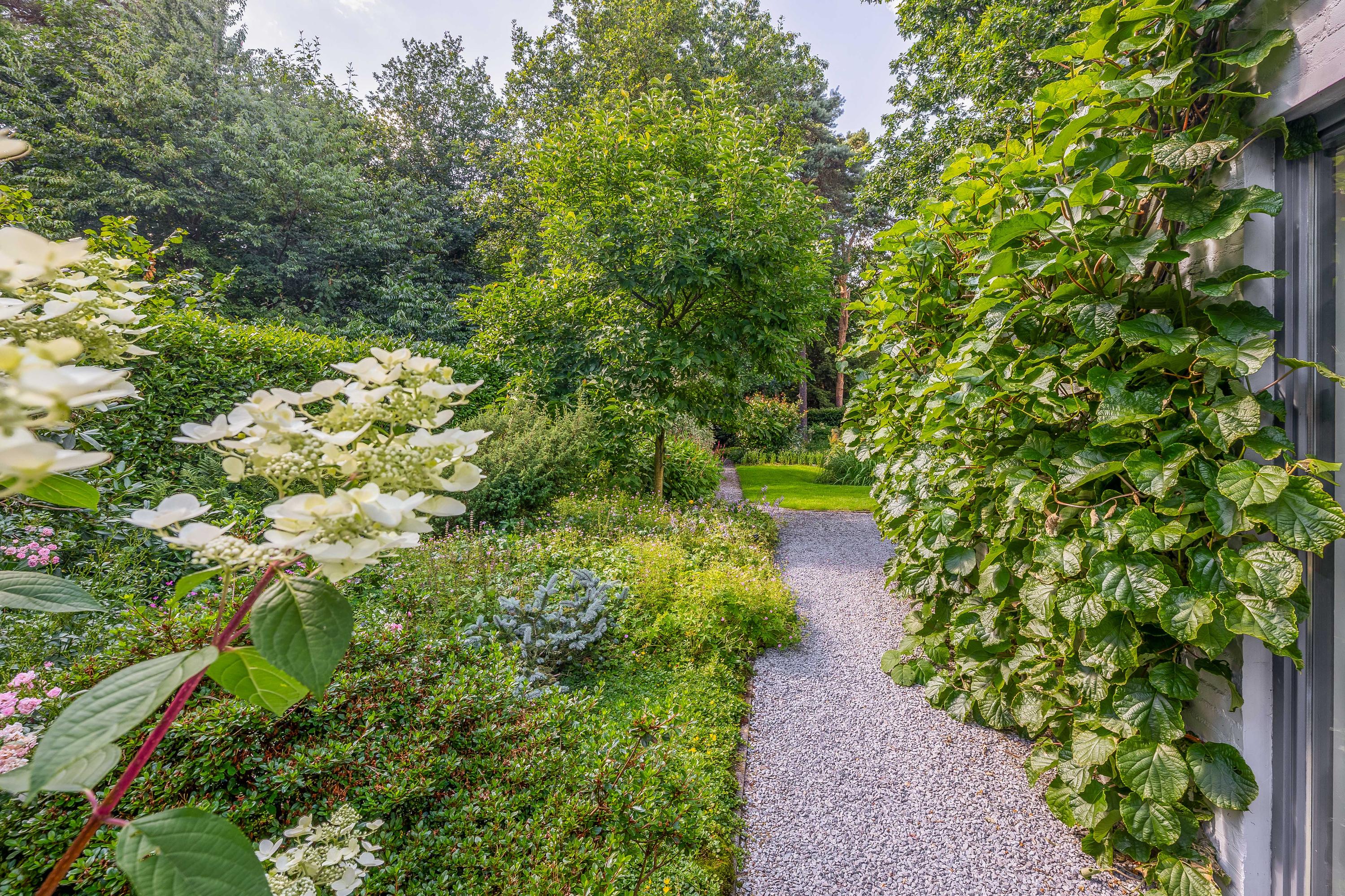 The detached stone garage is a welcome addition; it is equipped with three-phase power and accessible via a separate door and an electric sectional door. The fiber optic connection is also located here. A unique feature is that the irrigation of both the front and back gardens is controlled by computer.