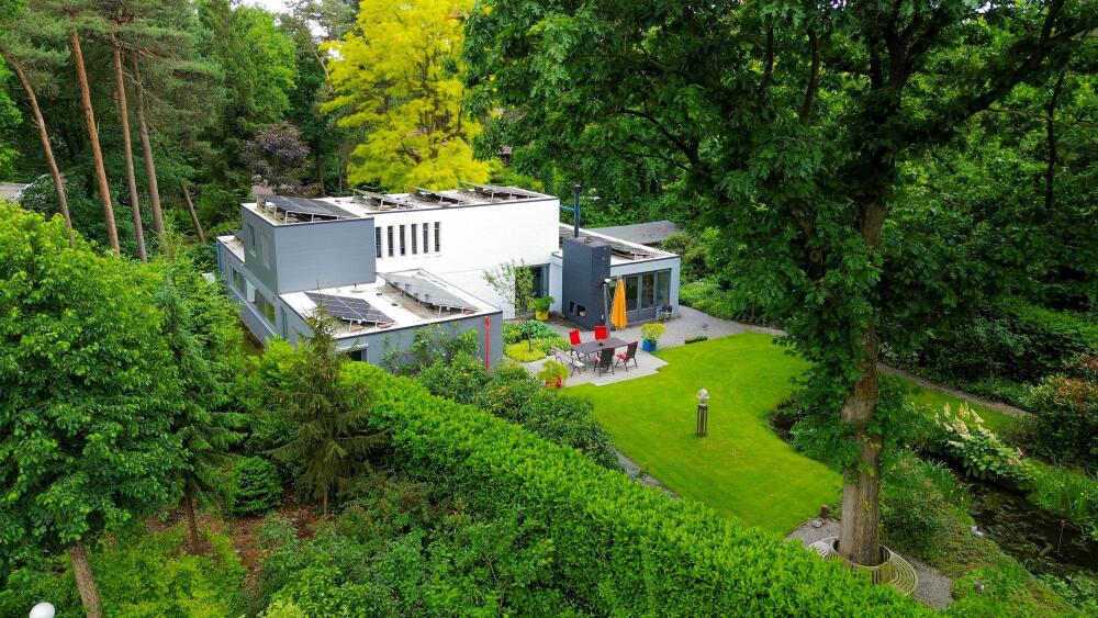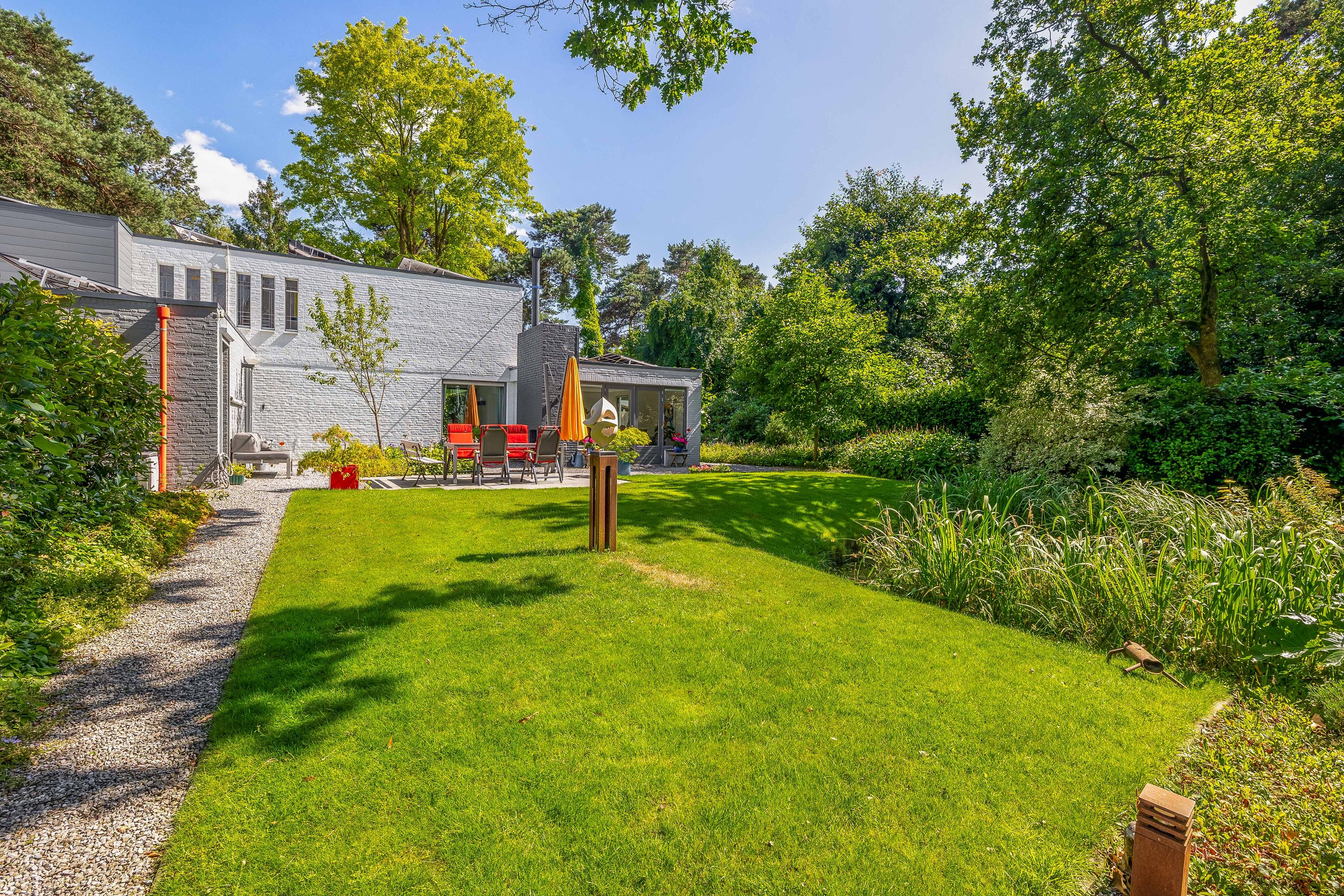 The backyard is a true oasis of privacy and tranquility. You literally feel like you are in a park surrounded by mature greenery and in the middle of nature. The garden is surrounded by a laurel hedge. There are several power points and outside taps, and for cozy evenings there is an outdoor fireplace! The whole area is beautifully landscaped with a large lawn, plants, and a lovely pond. Of course, a computer-controlled irrigation system is a must here. A beautifully landscaped garden with a walnut tree, magnolias, and lots of forest fruits: blueberries (25 kg per year), blackberries, and raspberries.