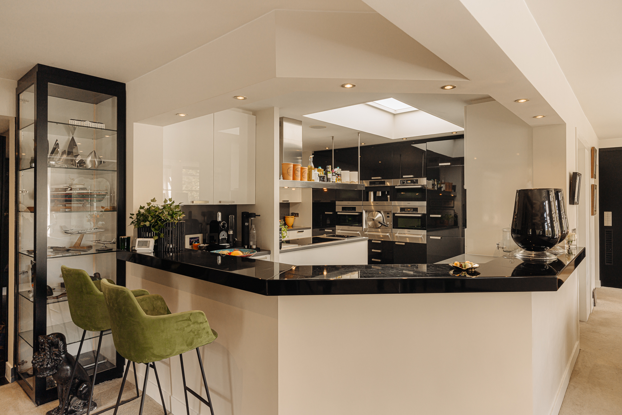 Spacious living room (three combined rooms) with a gas fireplace, large windows, and stunning views. Two balconies surrounded by greenery. The semi-open designer kitchen features high-quality Miele appliances, including two ovens, wine coolers, and a large bar.