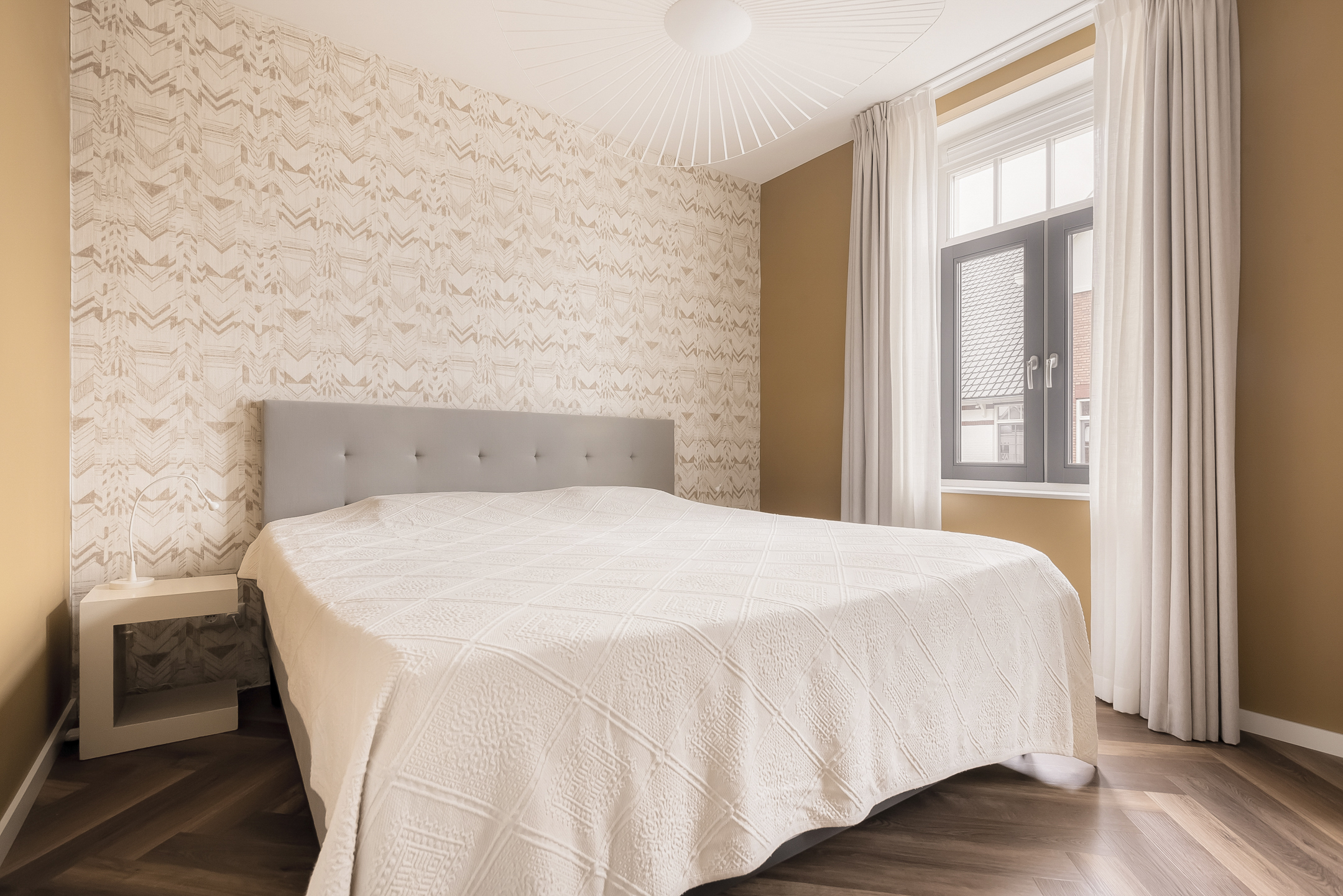 The front bedroom is particularly impressive due to its ceiling height of no less than 4.5 meters, giving the room a spacious and distinctive character. At the rear is the second bedroom, located next to the bathroom.