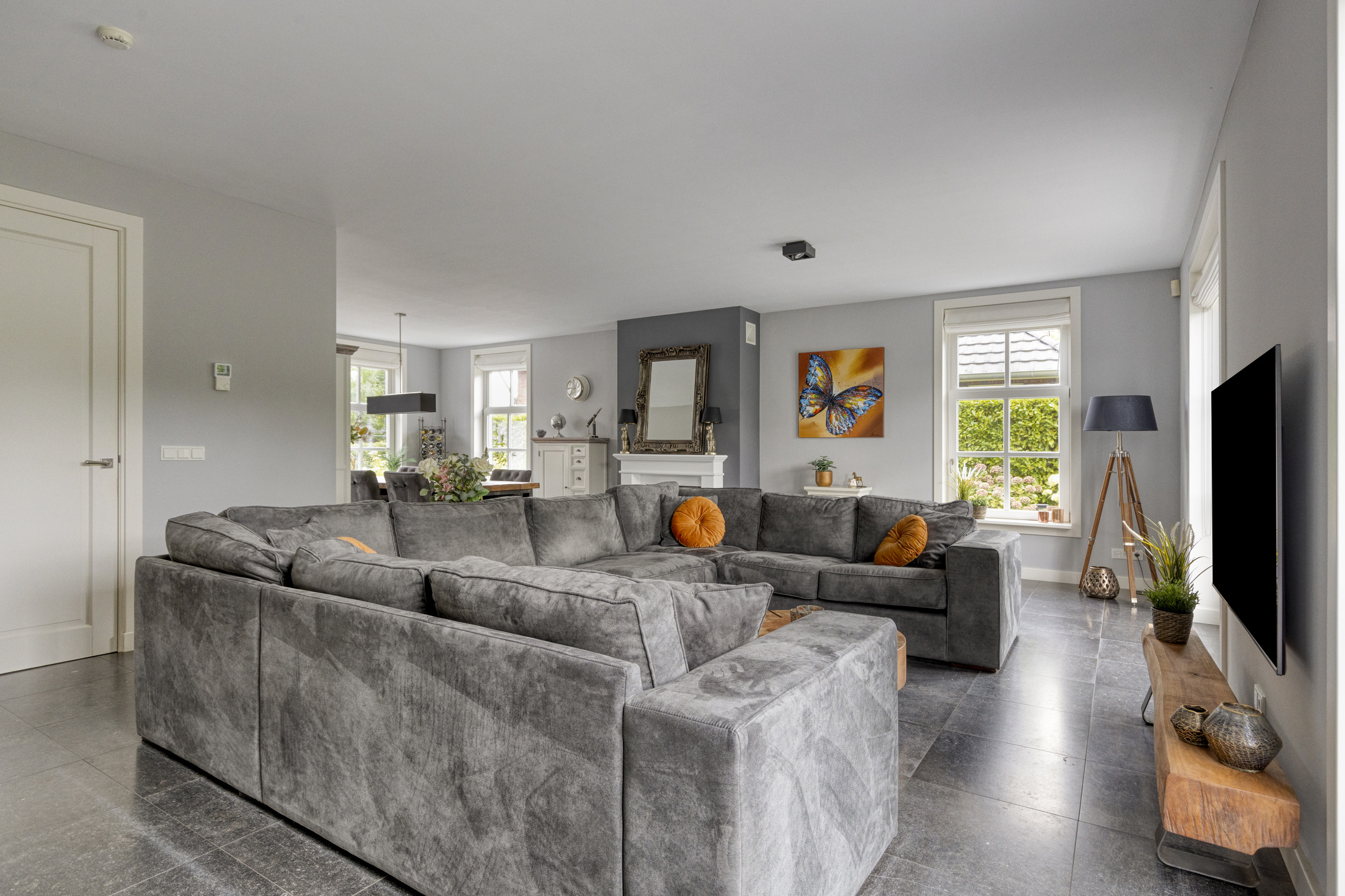 Living room (approx. 75.5 m² including kitchen) spacious L-shaped living area with French doors to the garden and terrace. The elegant stone fireplace with built-in gas fire forms a focal point of the interior. The walls (with integrated speakers) are plastered, the floor is natural stone and the ceiling features multiple light points and recessed spotlights.