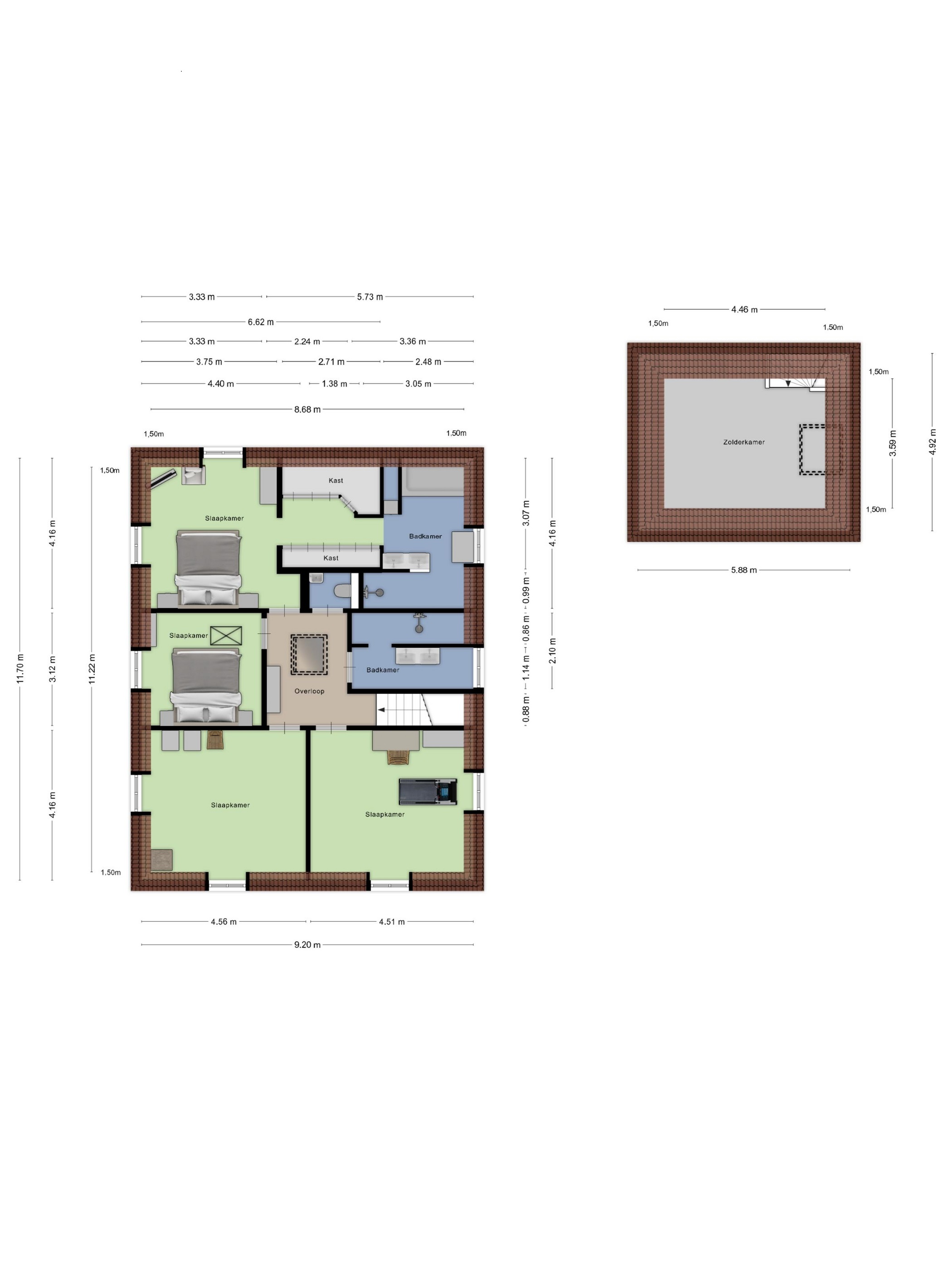 Three additional bedrooms: each with two dormer windows; plastered walls; PVC flooring; ceilings with recessed lighting; from the middle bedroom a loft ladder leads to the second floor.