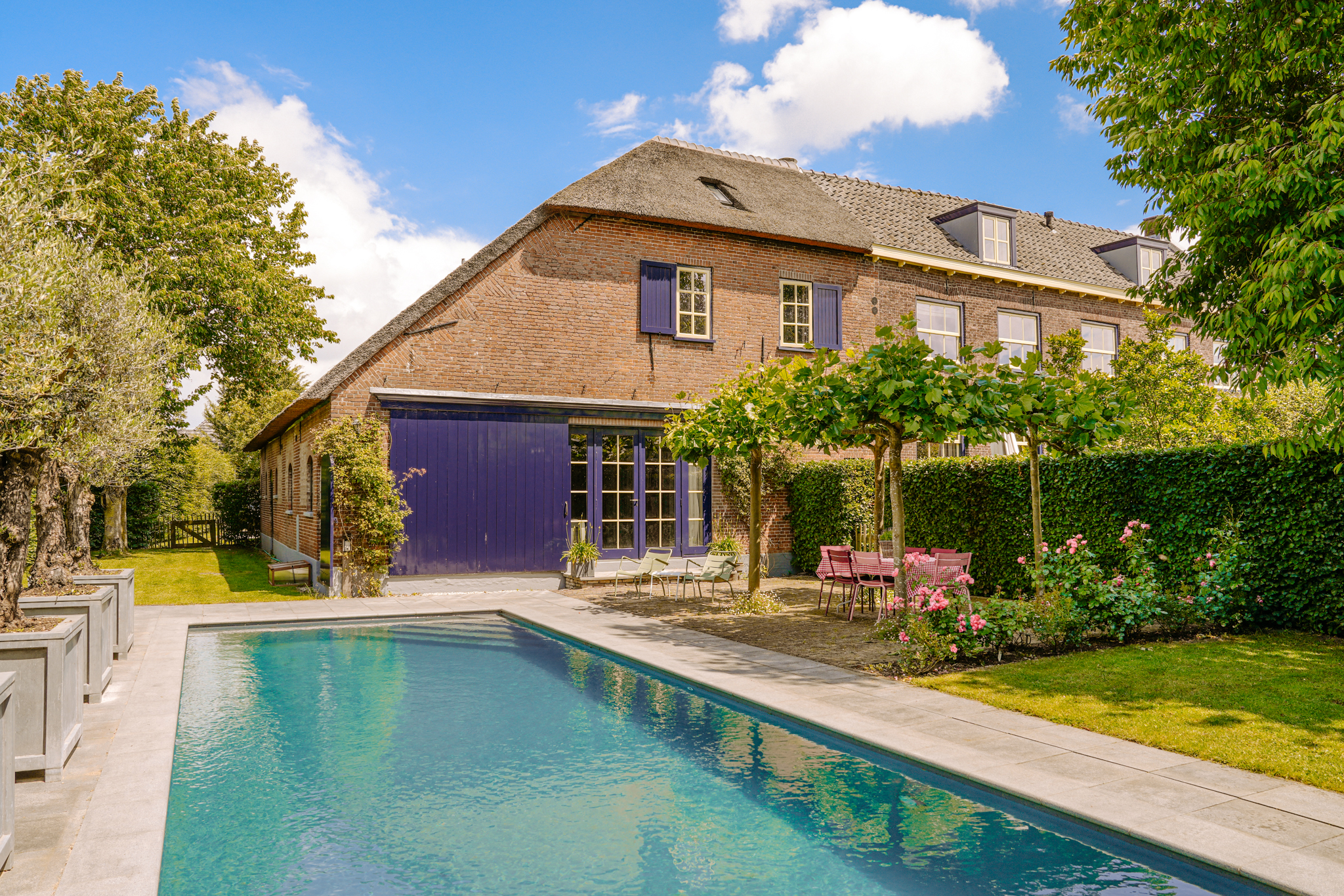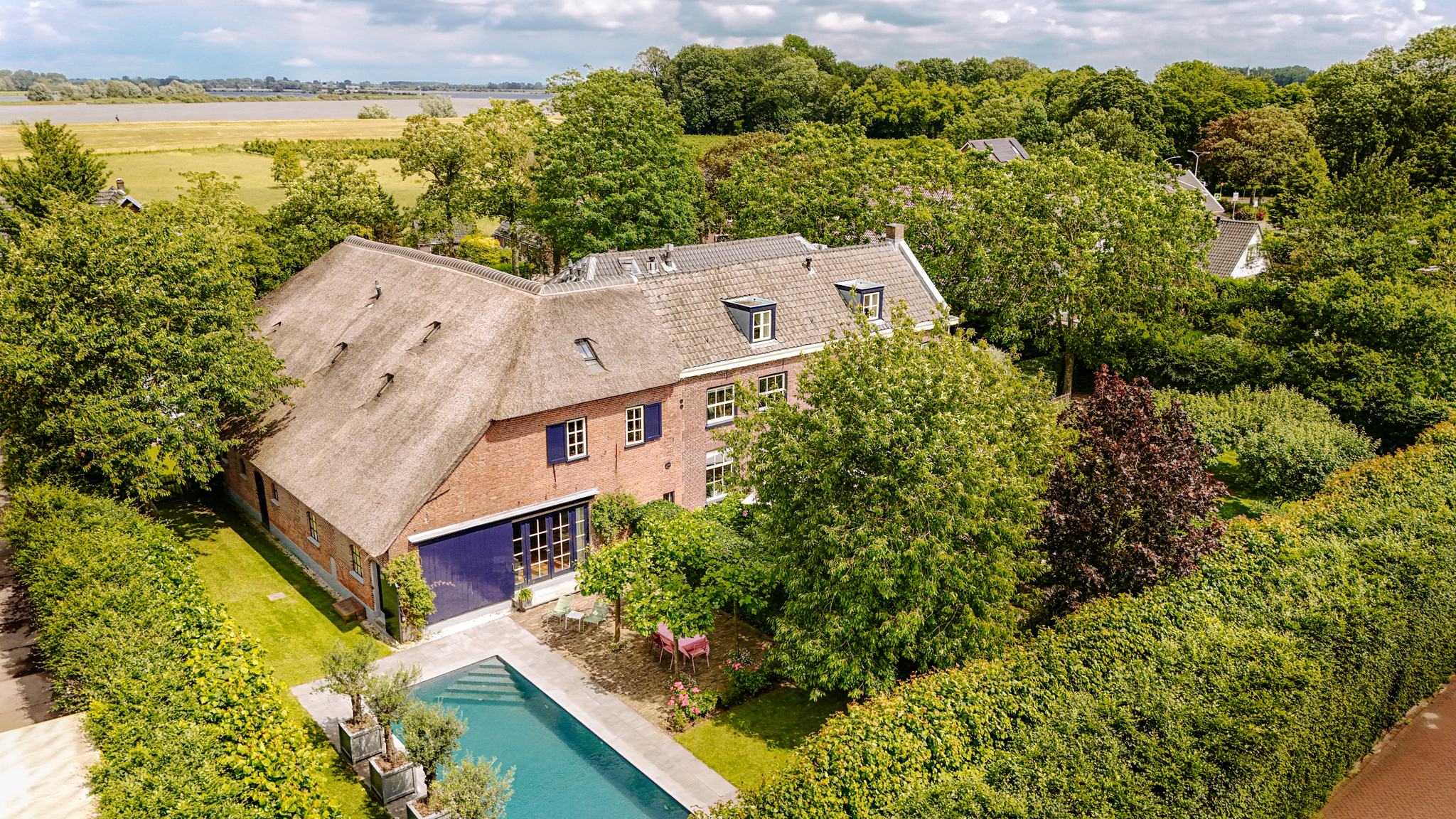 En el exterior, amplias terrazas, una piscina climatizada de diez metros rodeada de árboles frutales y bancales elevados configuran un refugio privado. Más allá de los setos, Rossum garantiza la intimidad de la vida en el pueblo, enmarcada por paisajes fluviales y a pocos minutos de la A2, con rápido acceso a Utrecht y Ámsterdam. La finca Rossum es uno de los mayores complejos agrícolas de la región y propone una fusión única de amplitud, confort y patrimonio.