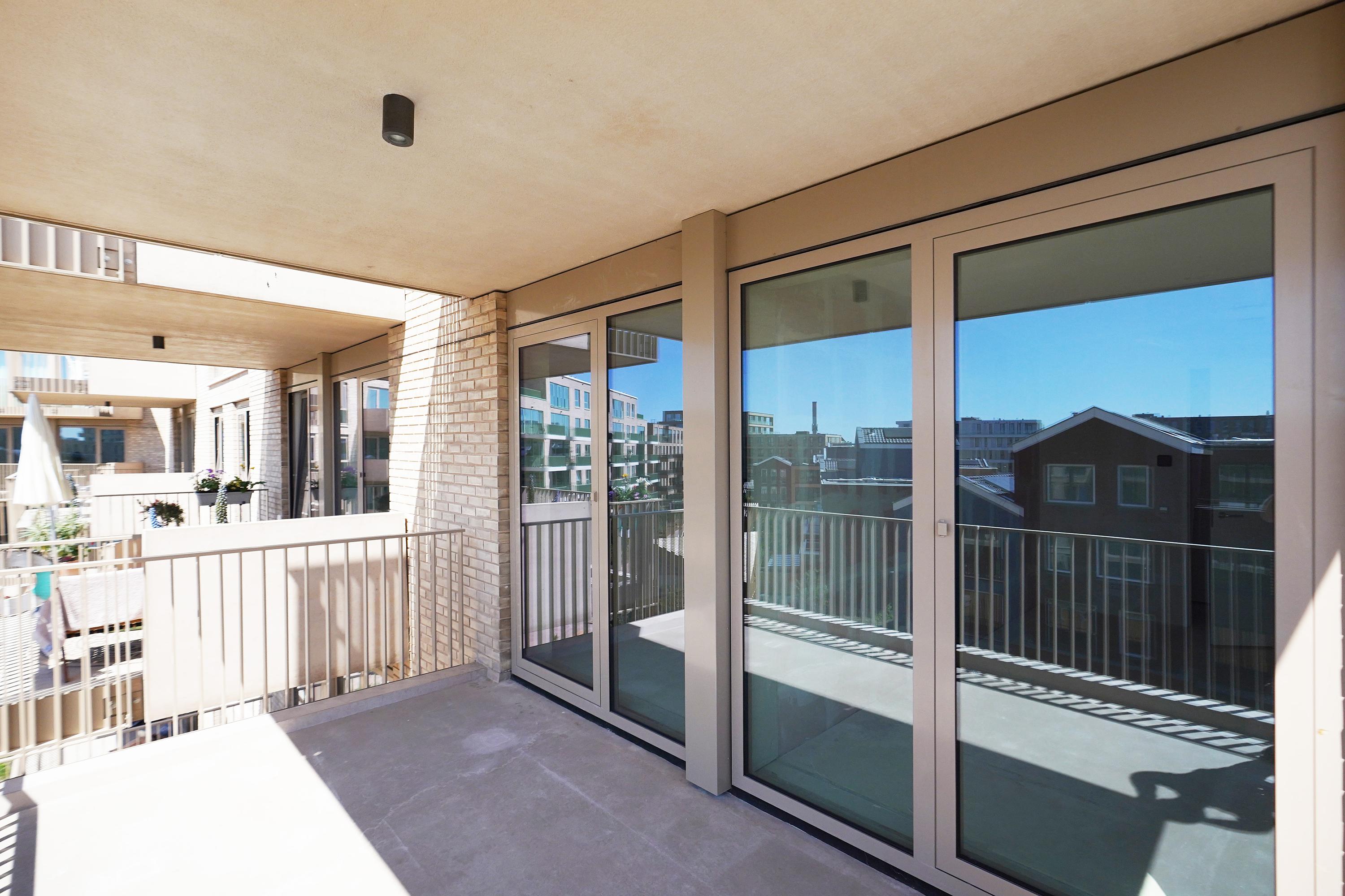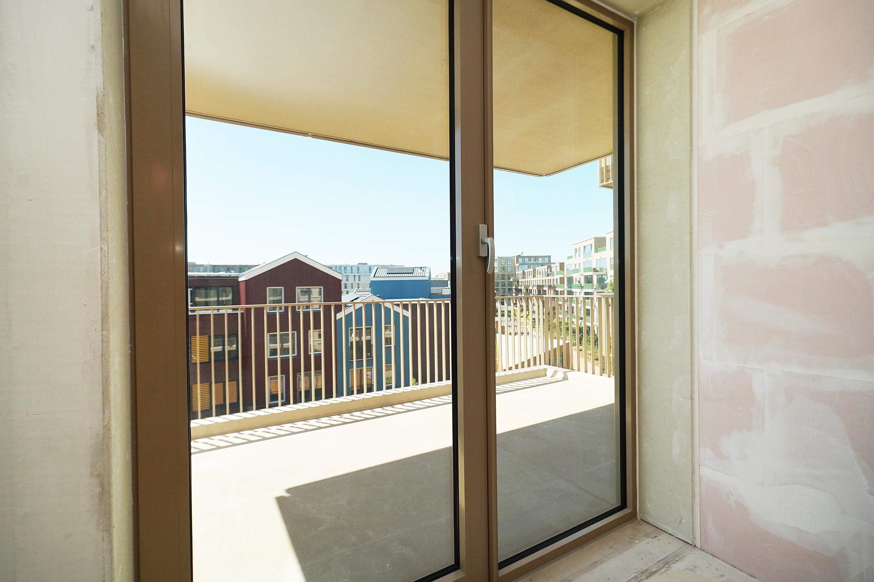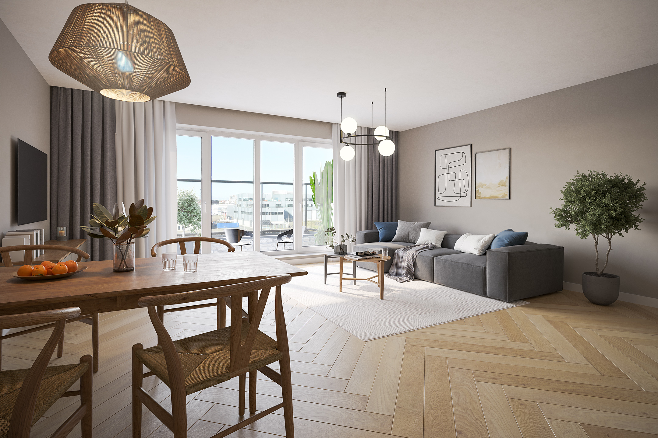 Le séjour ouvert s’articule autour d’une cuisine NEXT-125 avec plan de travail en composite et électroménager intégré, comprenant un robinet Quooker, une plaque à induction avec ventilation intégrée et un four combiné. Un système de chauffage et de rafraîchissement par le sol s’étend dans tout l’appartement, atteignant l’efficacité du label énergétique A+++. Toutes les pièces, à l’exception de l’espace technique, baignent dans le confort. À l’arrière, le balcon exposé plein sud offre des moments de calme avec vue sur une cour commune, accessible depuis les deux chambres.