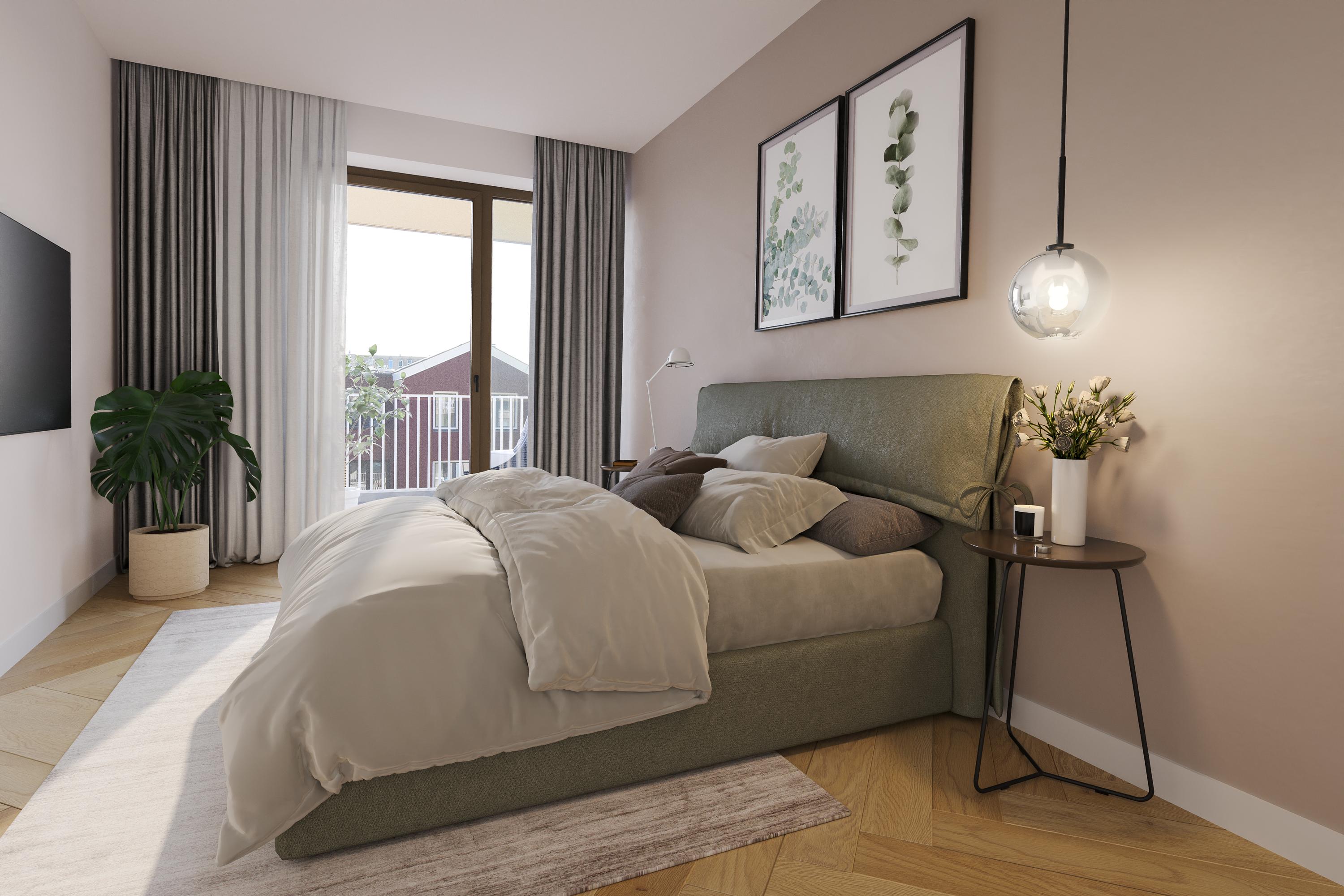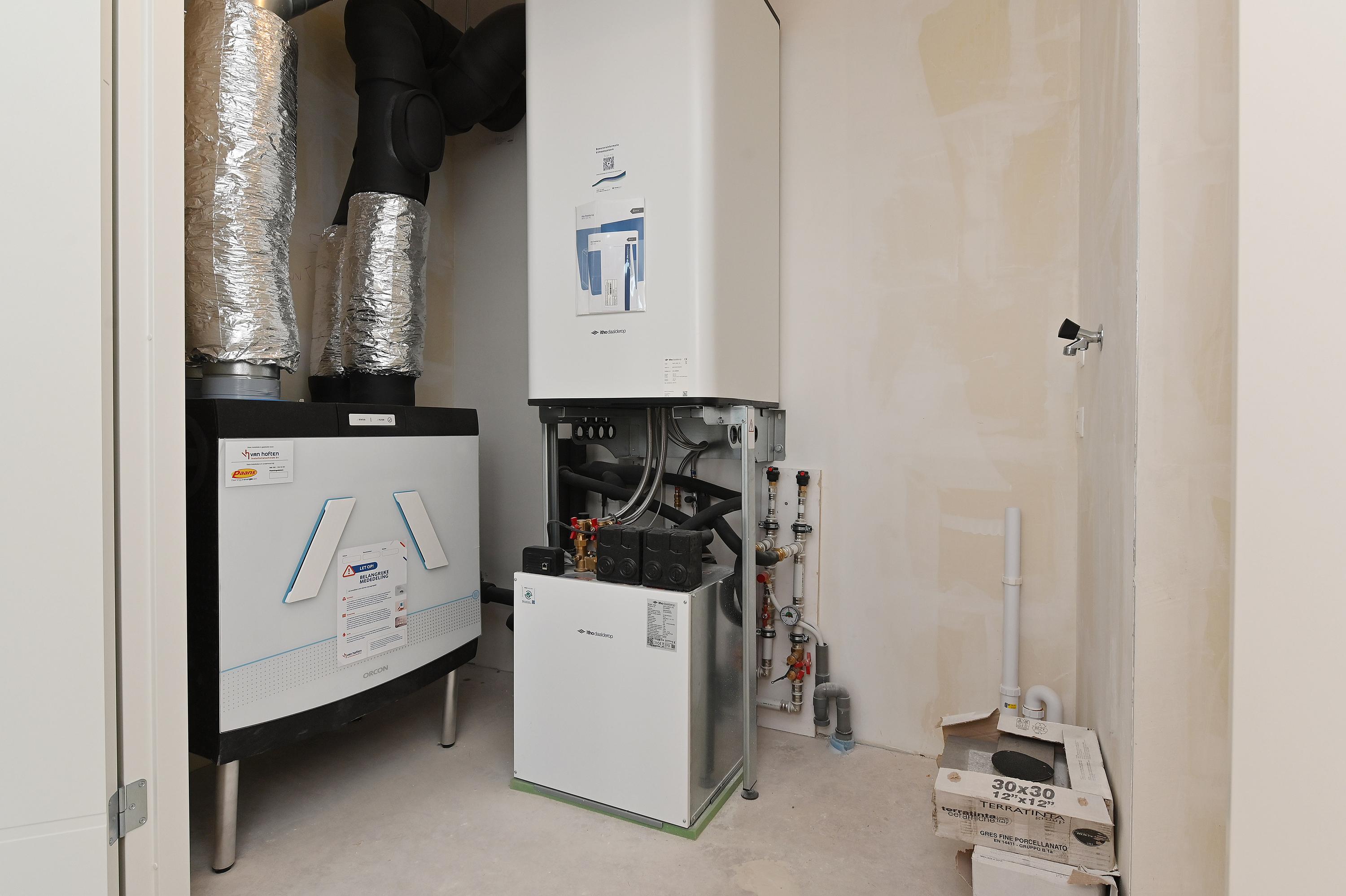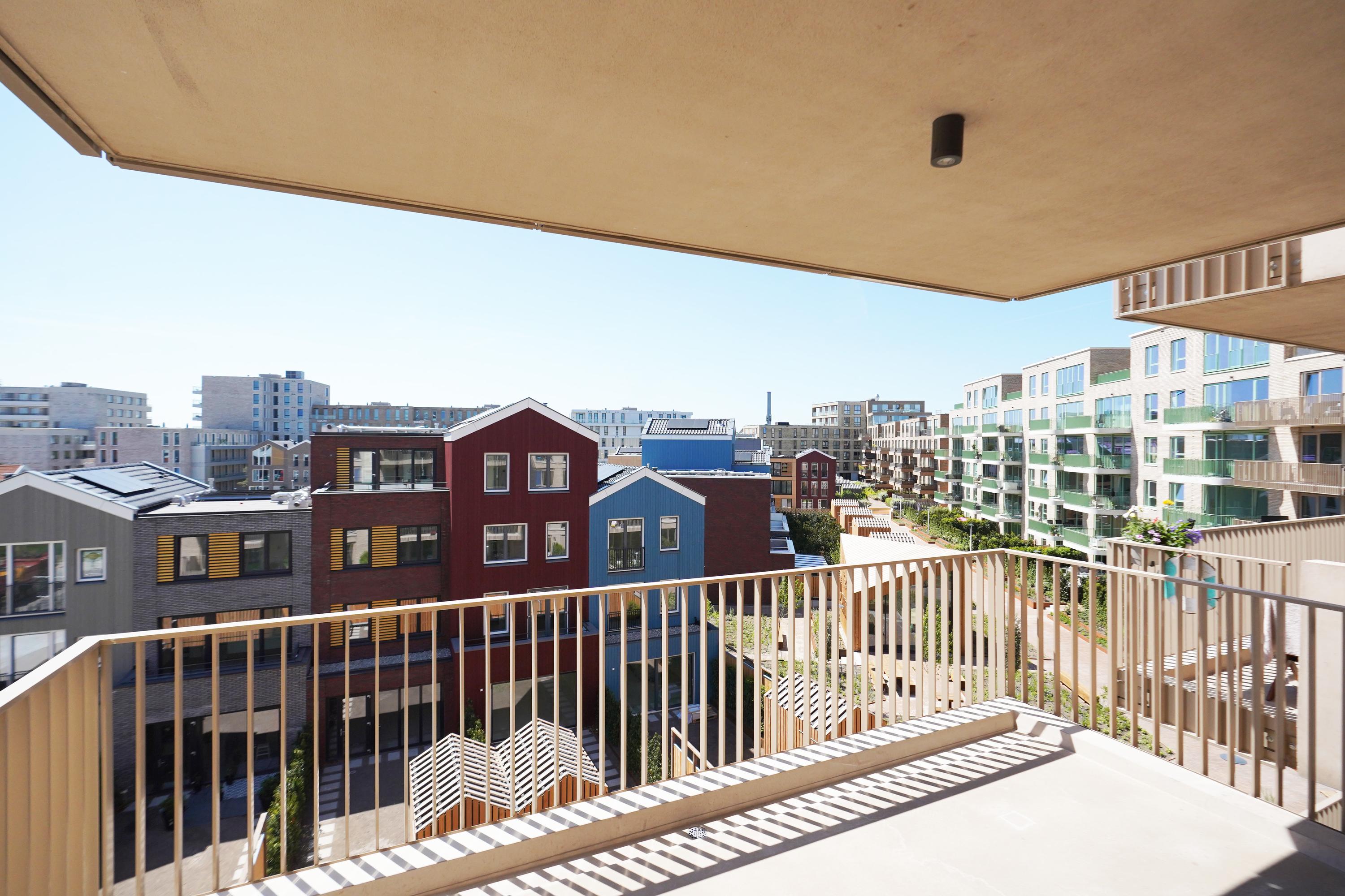 Le séjour ouvert s’articule autour d’une cuisine NEXT-125 avec plan de travail en composite et électroménager intégré, comprenant un robinet Quooker, une plaque à induction avec ventilation intégrée et un four combiné. Un système de chauffage et de rafraîchissement par le sol s’étend dans tout l’appartement, atteignant l’efficacité du label énergétique A+++. Toutes les pièces, à l’exception de l’espace technique, baignent dans le confort. À l’arrière, le balcon exposé plein sud offre des moments de calme avec vue sur une cour commune, accessible depuis les deux chambres.