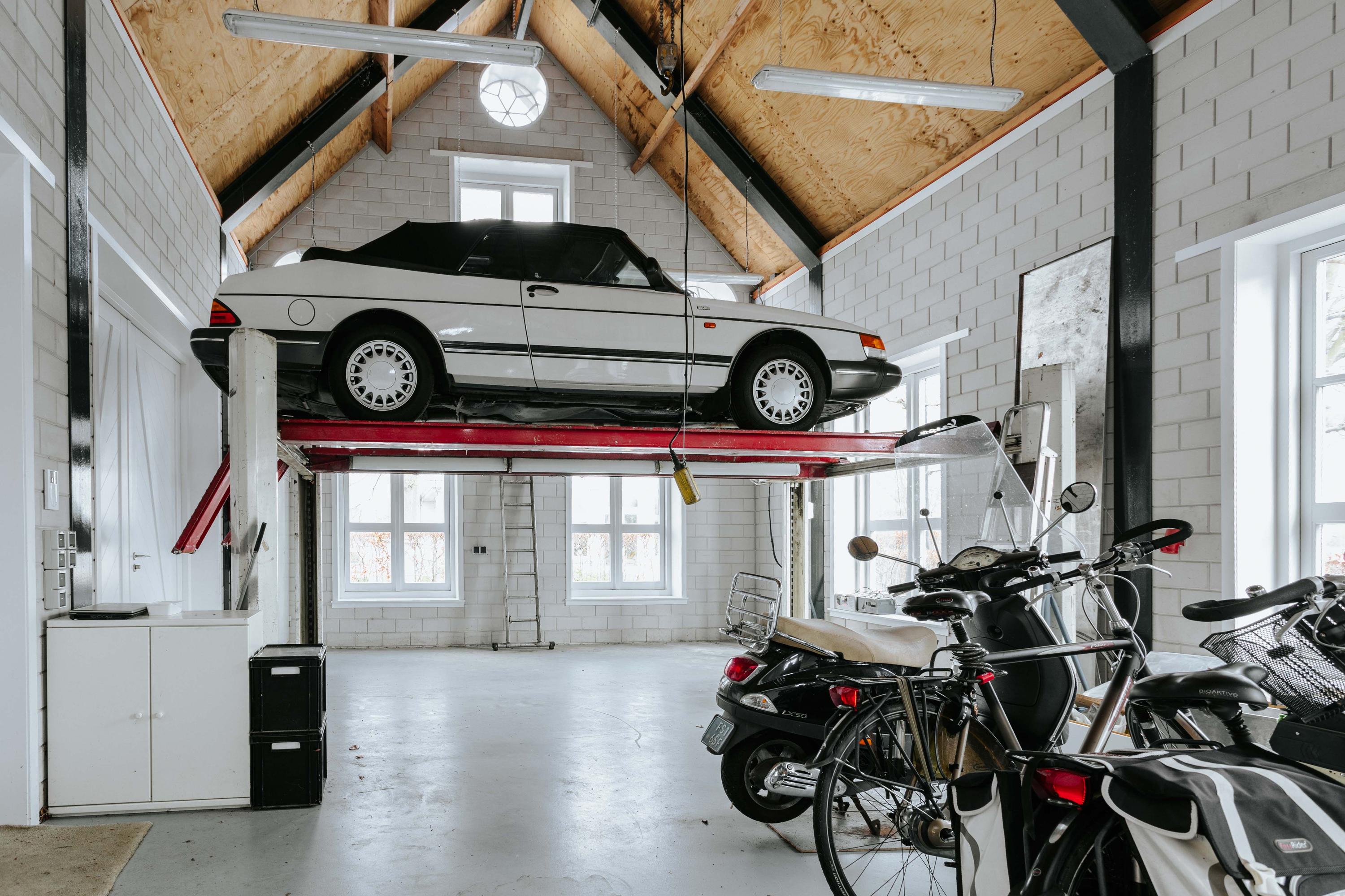 Un garage indépendant peut accueillir six véhicules avec chauffage au sol et espace de travail ; il est également modulable selon les besoins futurs. Les aménagements économes en énergie, dont une pompe à chaleur et une isolation renforcée, rythment la durabilité de la propriété.