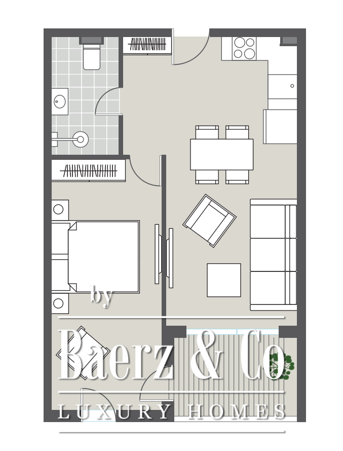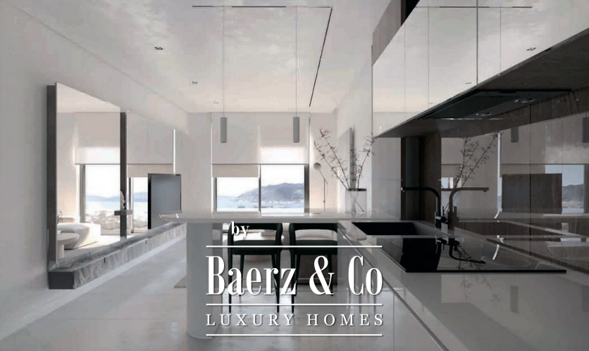 Situé au premier étage, l’appartement propose un séjour lumineux avec cuisine ouverte et coin repas, une chambre, une salle de bain et une terrasse. La conception clé en main offre des intérieurs sur-mesure signés ANSER & Partners, aménagés avec du mobilier Old Hara, complétés par des appareils électroménagers intégrés et des systèmes domotiques. Chaque détail, des équipements Villeroy & Boch à la climatisation Samsung WindFree, a été pensé pour un confort discret et une technologie intuitive.