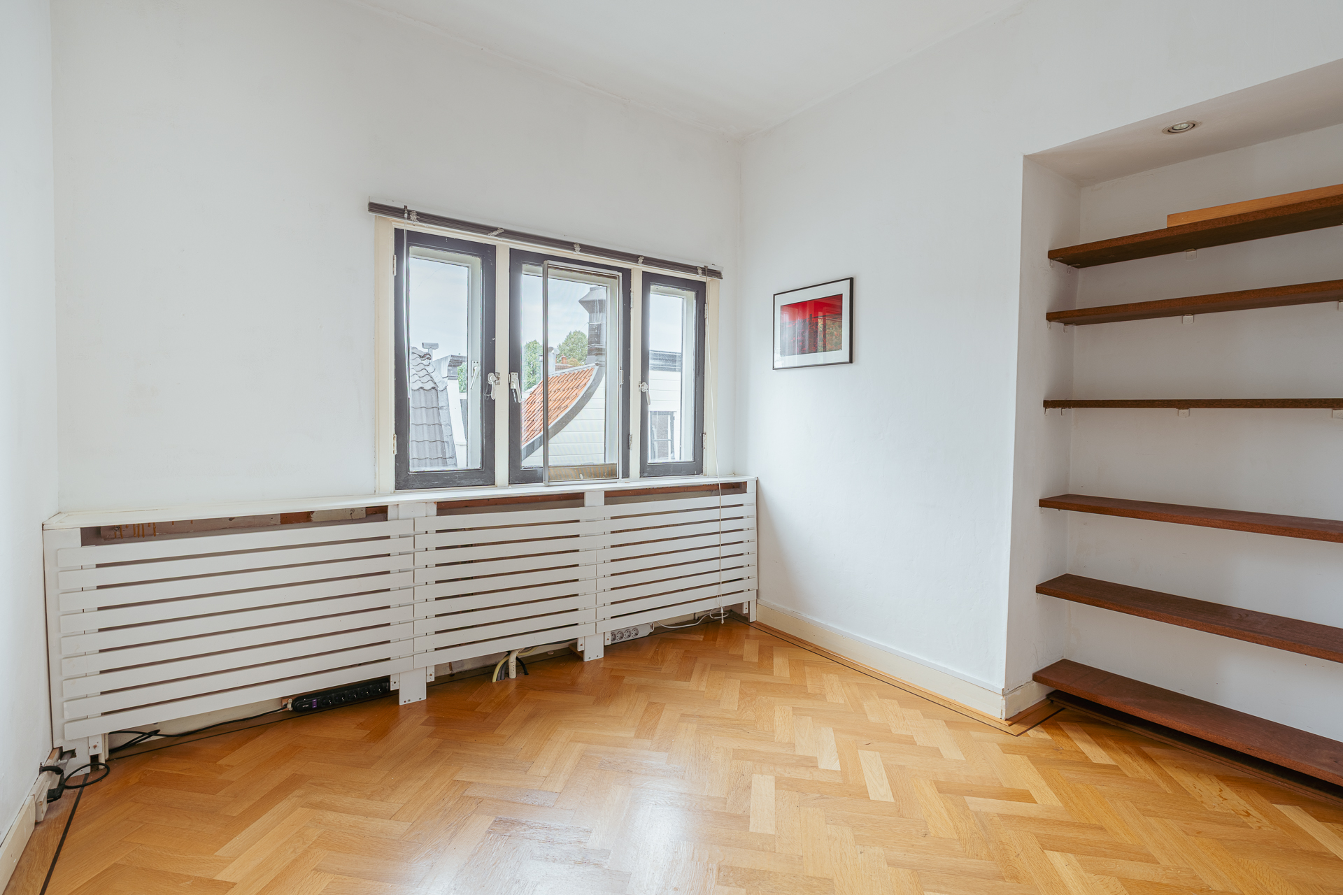 Via de entree aan de autoluwe straatzijde betreedt u de woning in de hal, voorzien van een garderoberuimte en separaat toilet met fontein. Vanuit de hal bereikt u de kamer aan de voorzijde van de woning, die dankzij de hoge ramen veel lichtinval heeft en ideaal kan dienen als kantoor of praktijkruimte. Deze ruimte beschikt tevens over een eigen (tweede) entree.