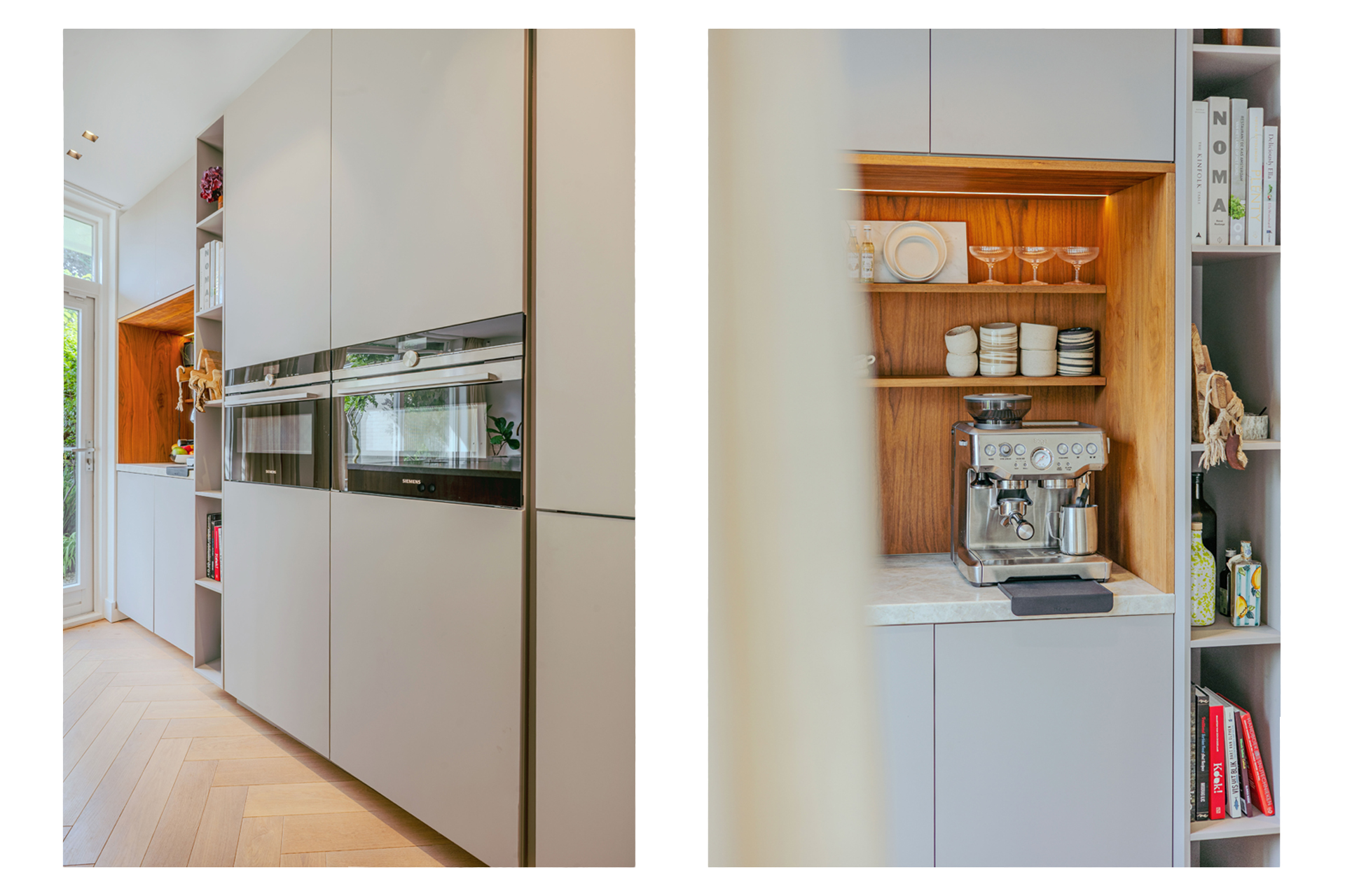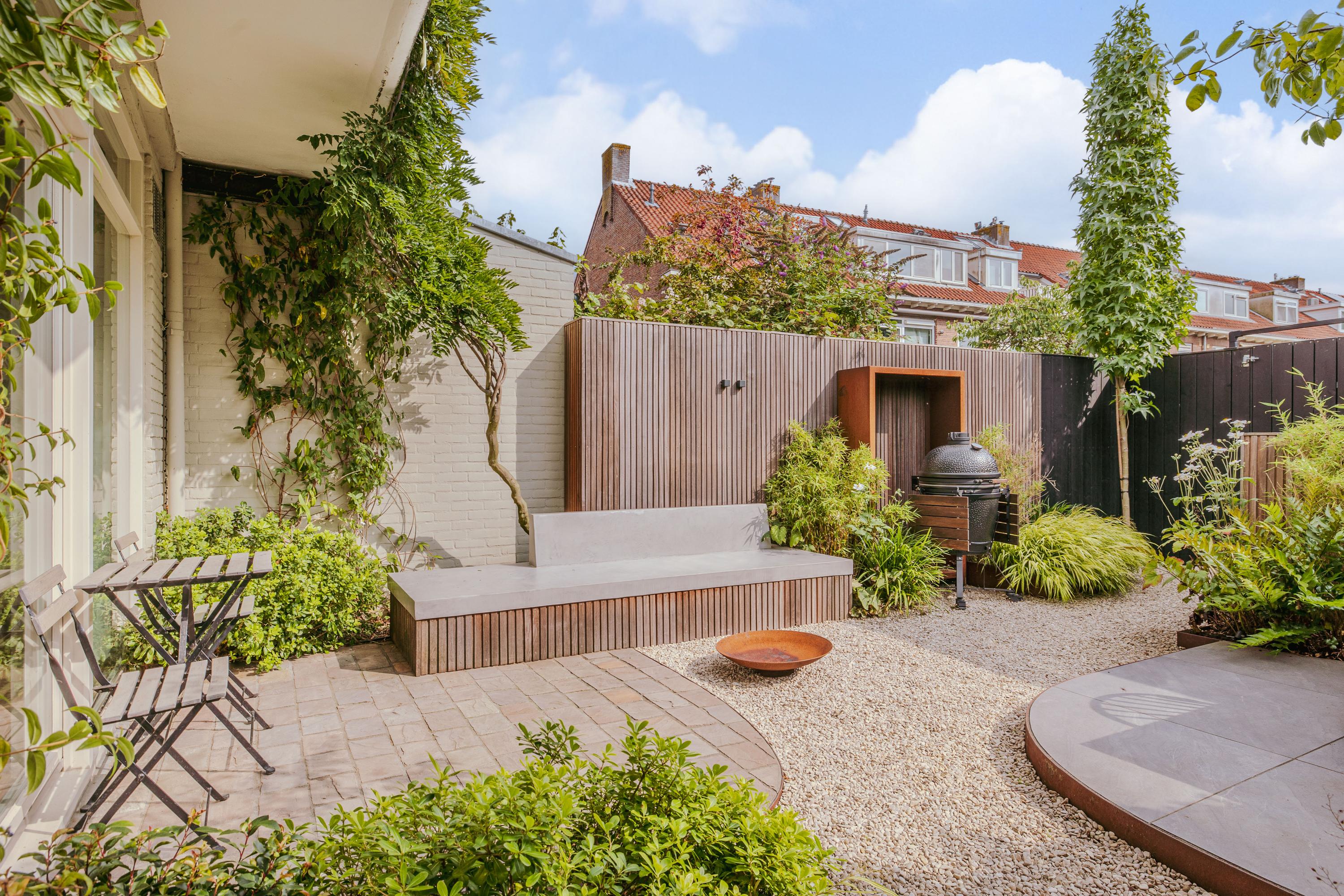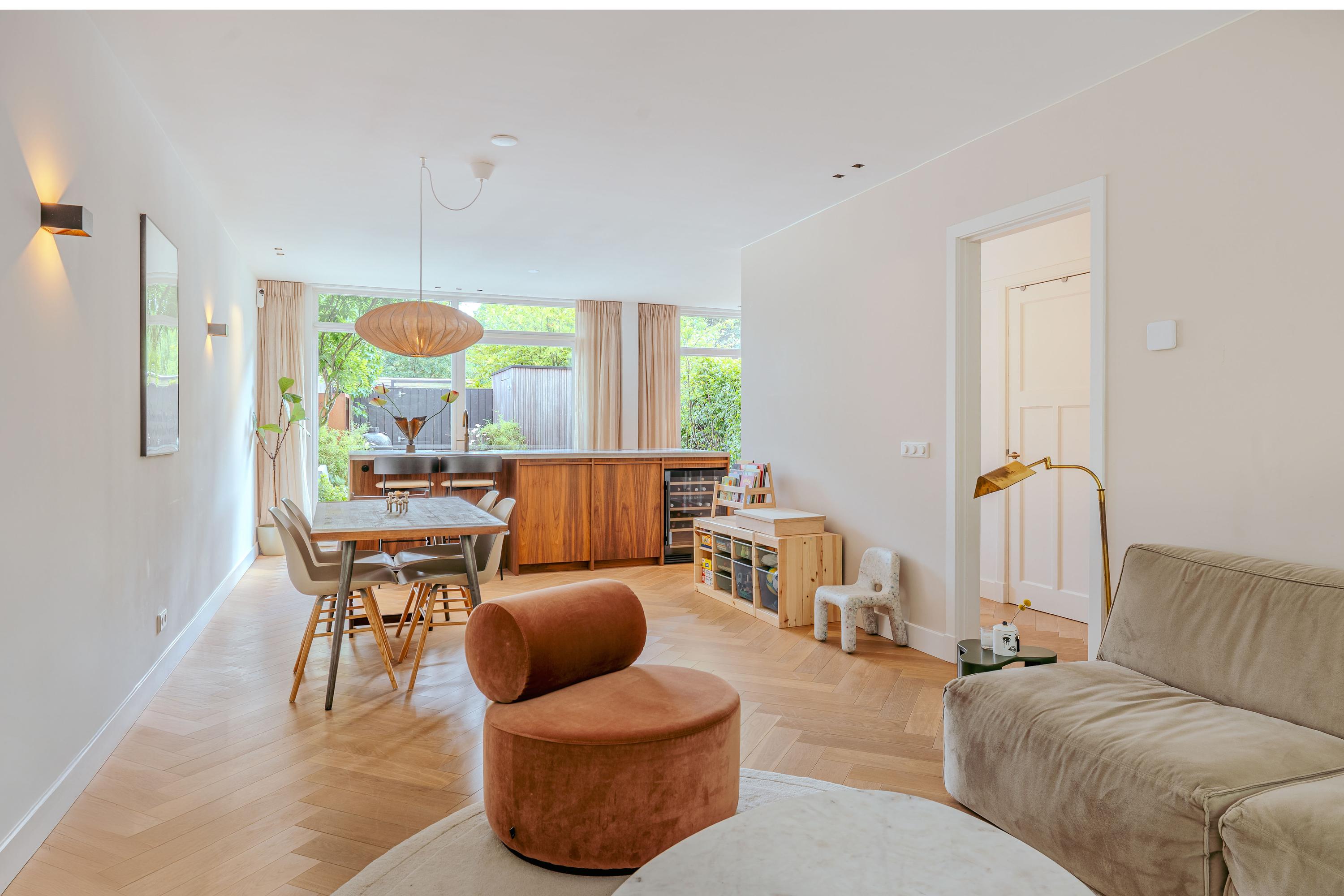 Middels de verzorgde voortuin bereikt u de entree van de woning. De hal beschikt over een praktische trapkast en een apart toilet met fontein. Vanuit hier heeft u toegang tot de lichte woonkamer en de royale leefkeuken aan de achterzijde. De woning is in 2021 volledig gerenoveerd en voorzien van een eikenhouten visgraatvloer met vloerverwarming. De luxe keuken is uitgevoerd met een centraal kookeiland en hoogwaardige inbouwapparatuur, waaronder een Bora inductiekookplaat met afzuiging, Quooker, spoelbak, klimaatkast, twee combi-ovens(waarvan een met stoomfunctie), koelkast, vriezer en vaatwasser. Het natuurstenen werkblad van Taj Mahal kwartsiet geeft de keuken een hoogwaardige uitstraling. Dankzij de grote raampartijen en de glazen deur naar de tuin profiteert deze verdieping van veel daglicht. De achtertuin (41m² op het zuiden) is in 2022 ontworpen en aangelegd door een professionele tuinarchitect, voorzien van verlichting en irrigatie, en beschikt over een vrijstaande berging (ca. 6 m²) met elektra.