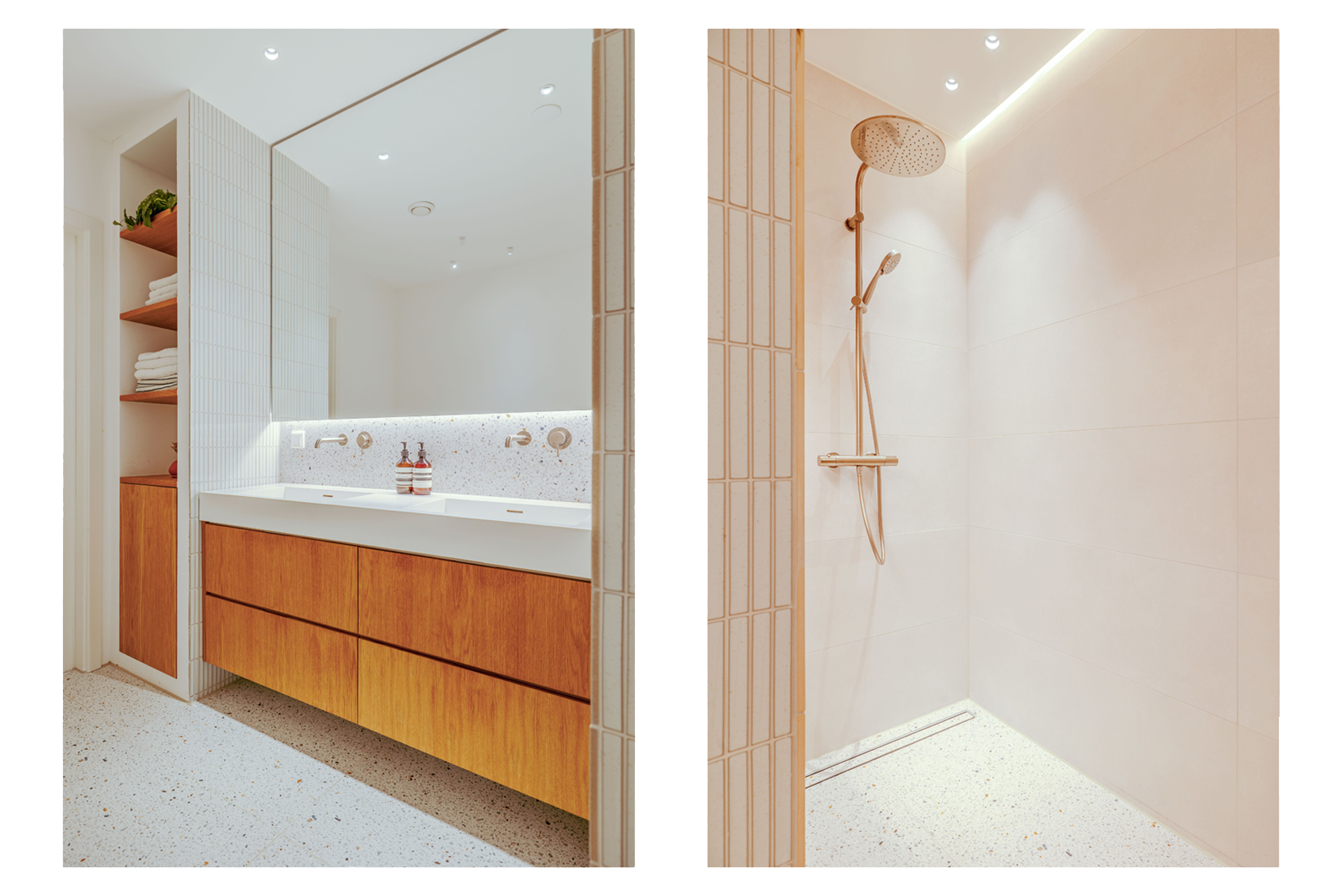 De overloop geeft toegang tot drie slaapkamers, een ruime badkamer en een separaat toilet. De master bedroom ligt aan de voorzijde en biedt voldoende ruimte voor een groot bed en kastenwand. Direct ernaast bevindt zich een extra kamer die eenvoudig als inloopkast kan worden ingericht. Aan de achterzijde liggen nog twee slaapkamers, waarvan één met toegang tot het balkon en één voorzien van een elektrisch rolluik op zonne-energie. De moderne badkamer is uitgerust met een ligbad, dubbele wastafel met meubel, vloerverwarming en een verwarmde spiegel.