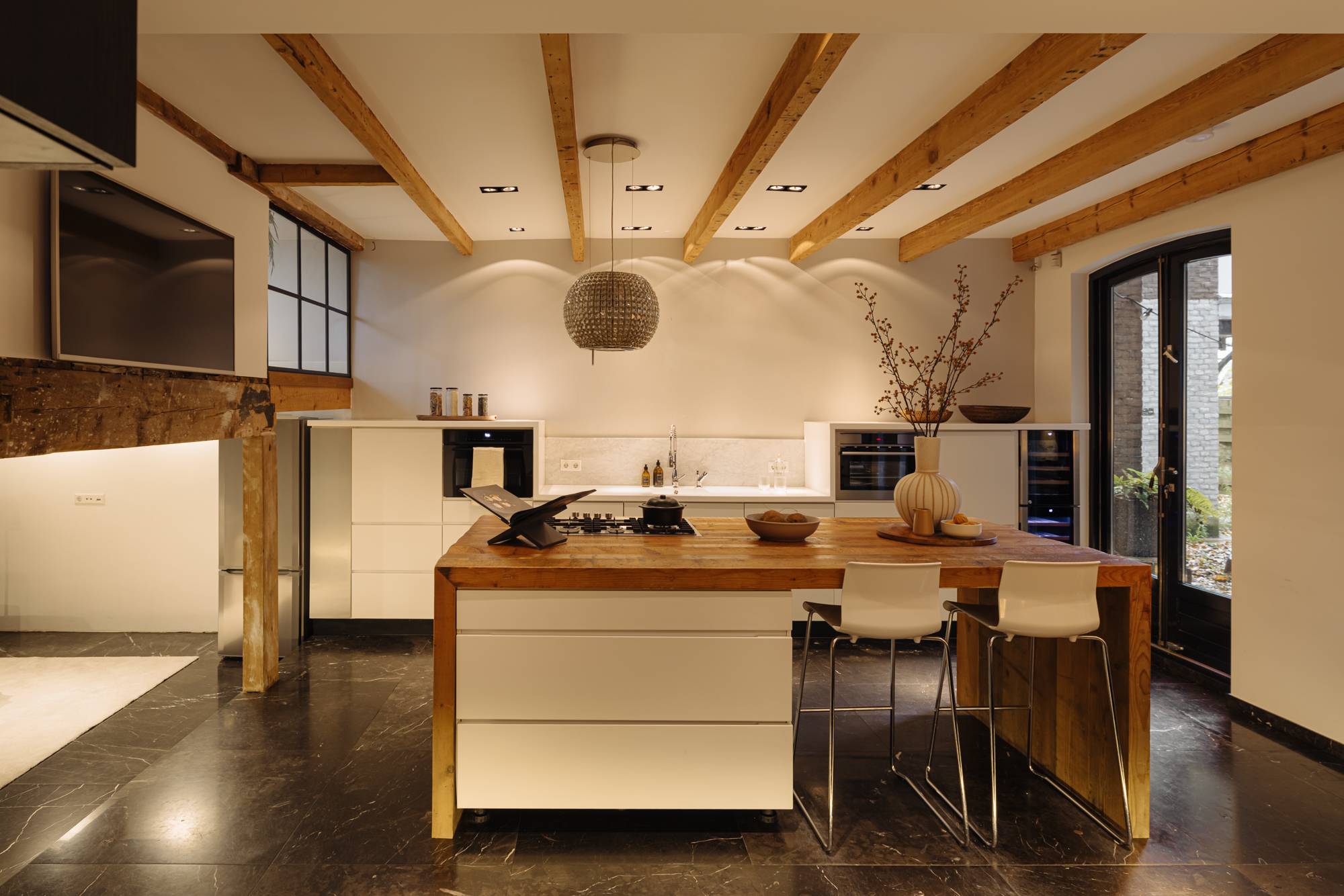 In het eetgedeelte is volop ruimte voor een grote eettafel. De zichtbare houten balken geven deze verdieping zijn warme, authentieke uitstraling. Via openslaande deuren bereikt u de patio een heerlijke plek voor een rustig ontbijt of een kop koffie in de ochtendzon.
