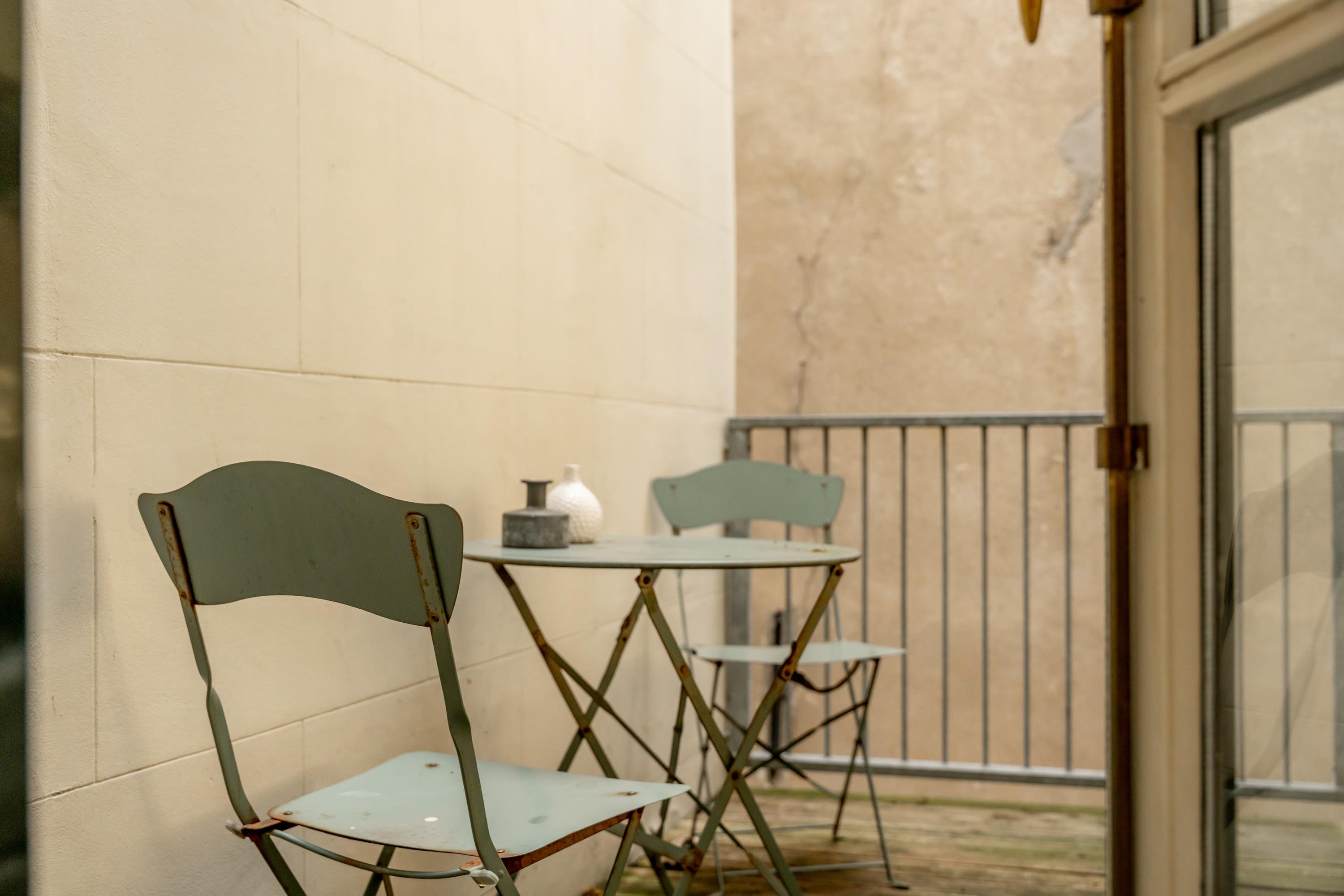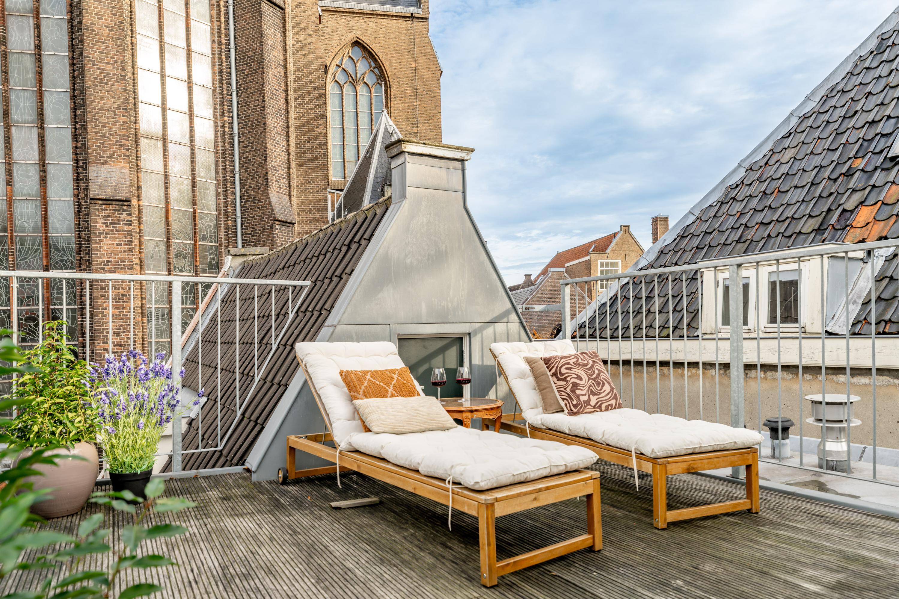 Een ruime slaapkamer aan de voorzijde, een karaktervolle vide als extra kamer, en dan het hoogtepunt: het dakterras. Intiem, beschut, en met uitzicht op de historische daken en de kerk — een zeldzame luxe in het centrum.