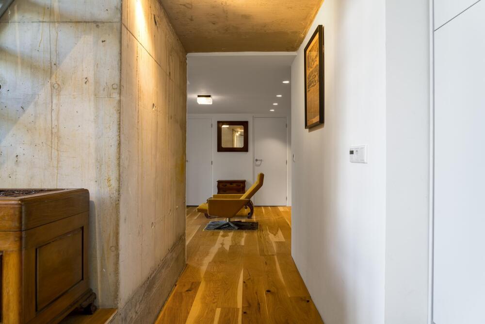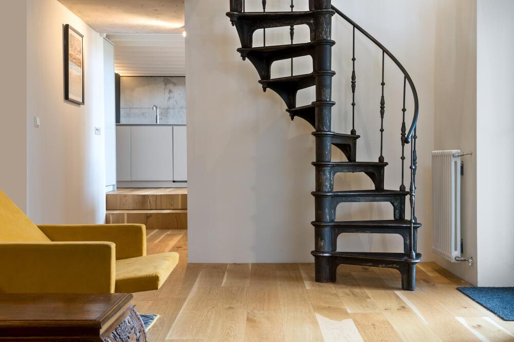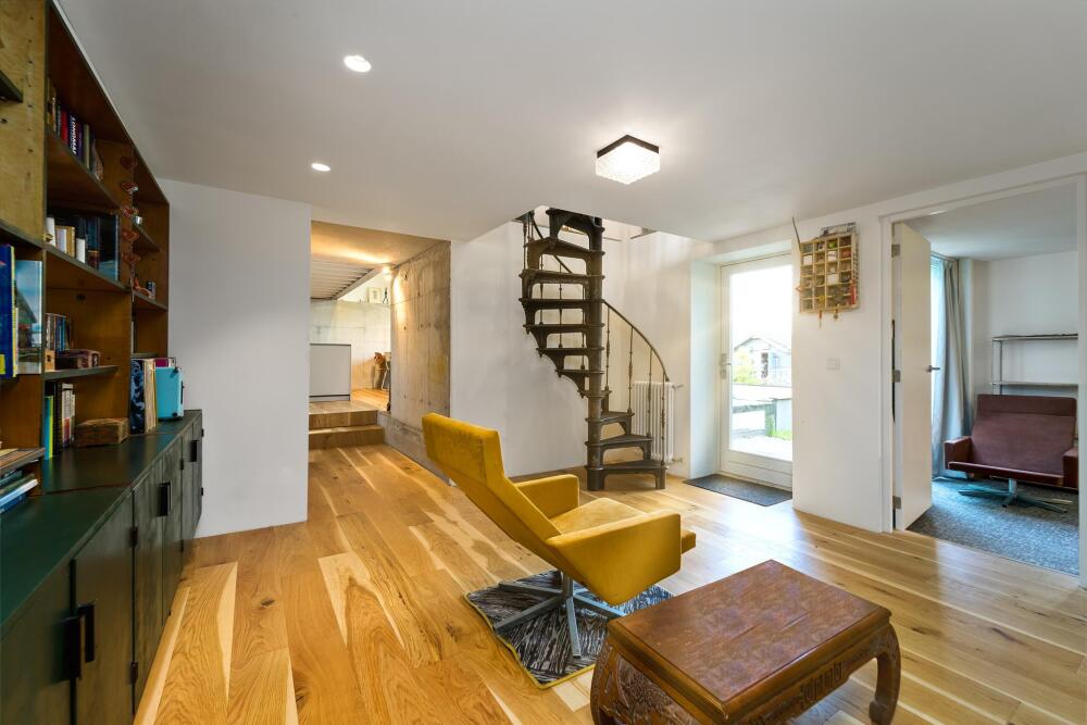 De woning is van binnen al net zo gaaf. Oude en moderne materialen zijn gebruikt bij de nieuwbouw/verbouwing. Stoere houten constructie balken, ruw beton, eiken vloerdelen, klassieke ledenradiatoren en de stalen wenteltrap zijn daar een aantal voorbeelden van.