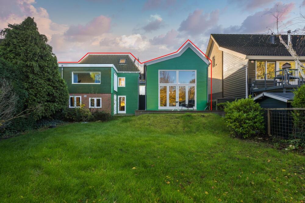 Op het rustige deel van de Oostzanerdijk staat dit huis op een breed kavel. Het huis is een gaaf 'fusion' ontwerp van twee architectonische stijlen. Zo is er een frisgroen Zaans (nieuwbouw) huisje, dat vrijstaat. Het staat naast het originele (vernieuwbouwde) vrijstaande stenen dijkhuis. Althans, dat oogt zo 'op' de dijk. Vanuit de tuin zie je dat het 1 ruime vrijstaande woning betreft. Op dit niveau zijn de woningen met elkaar verbonden, over bijna de hele breedte van de kavel.
