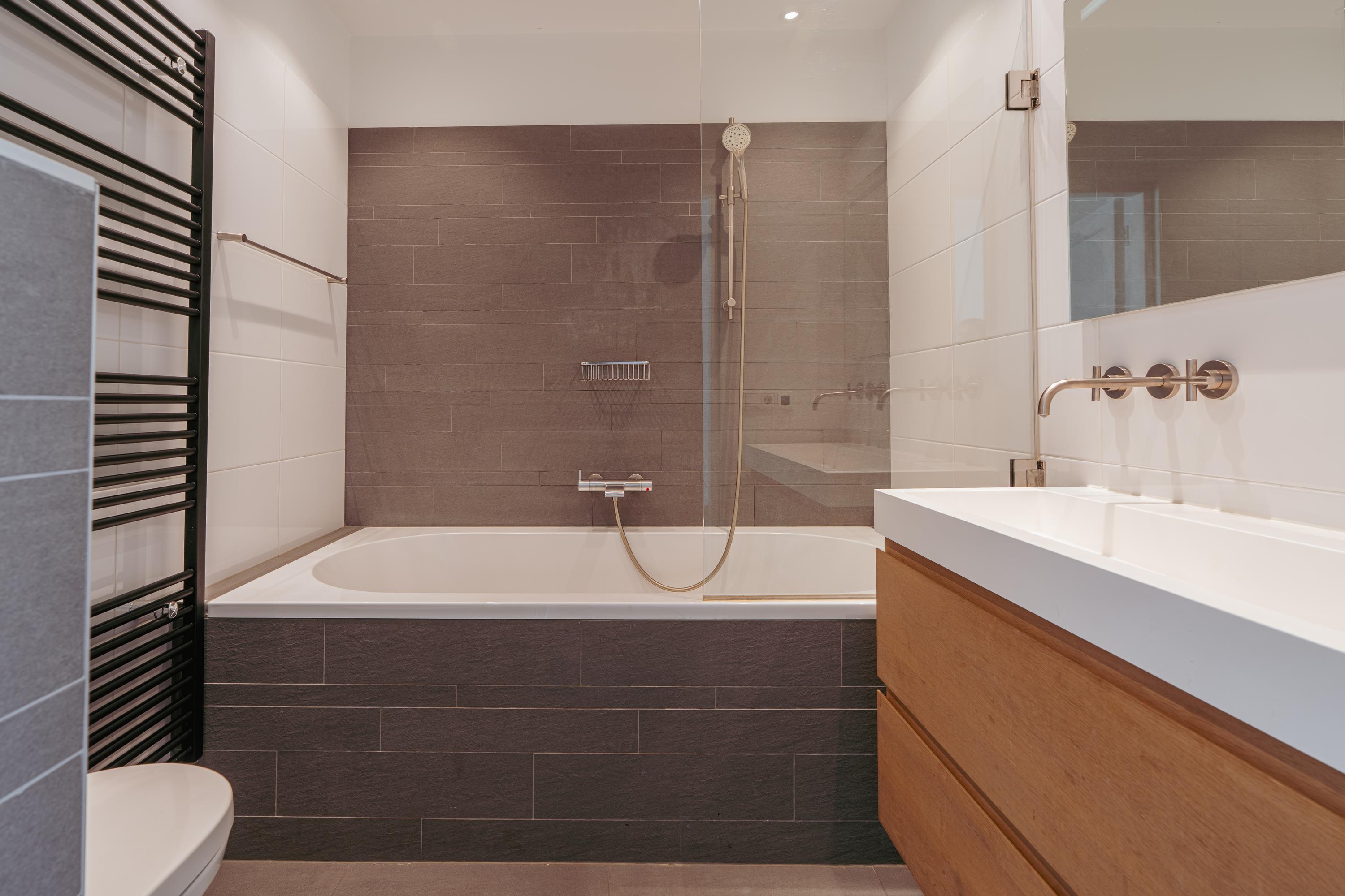 Aan de achterzijde ligt de royale master bedroom met toegang tot het balkon en een eigen badkamer met ligbad, wastafel en toilet. De tweede ruime slaapkamer bevindt zich eveneens aan de achterzijde en heeft tevens toegang tot het balkon. Aan de voorzijde ligt de derde slaapkamer, perfect als werk- of logeerkamer. In de slaapkamers zijn fraaie glas-in-looddetails aanwezig, die bijdragen aan de authentieke sfeer van de woning. De tweede badkamer, voorzien van een inloopdouche en wastafel, is bereikbaar via de hal.