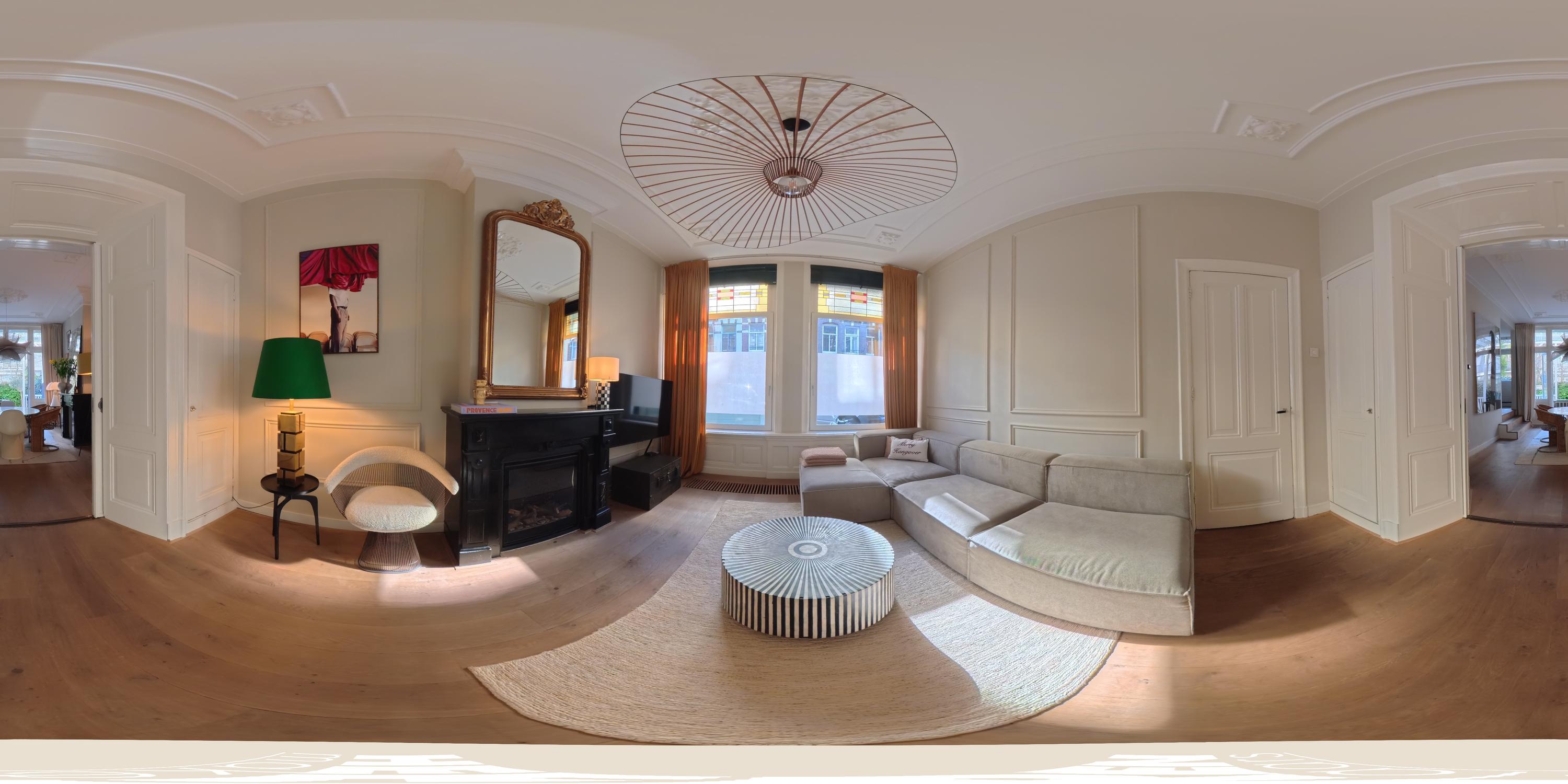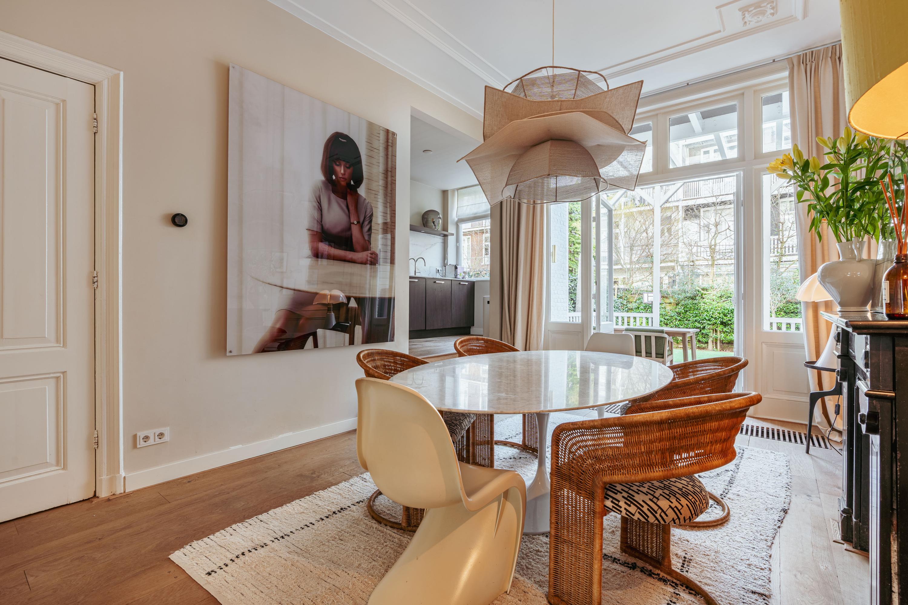 Aan de voorzijde ligt de woonkamer, voorzien van fraaie inbouwkasten. De grote raampartijen met glas-in-lood zorgen voor een prachtige lichtinval en versterken de authentieke sfeer. De originele open haard vormt een stijlvol middelpunt van de ruimte. Aangrenzend bevindt zich, afsluitbaar middels schuifdeuren, de eetkamer. Ook hier vindt u een karakteristieke schouw en ingebouwde kasten. Dankzij de openslaande deuren is er volop daglicht en ontstaat er in de zomer een mooie verbinding tussen binnen en buiten. Beide kamers zijn ruim opgezet en bieden de mogelijkheid om deze naar wens open of juist separaat te gebruiken.