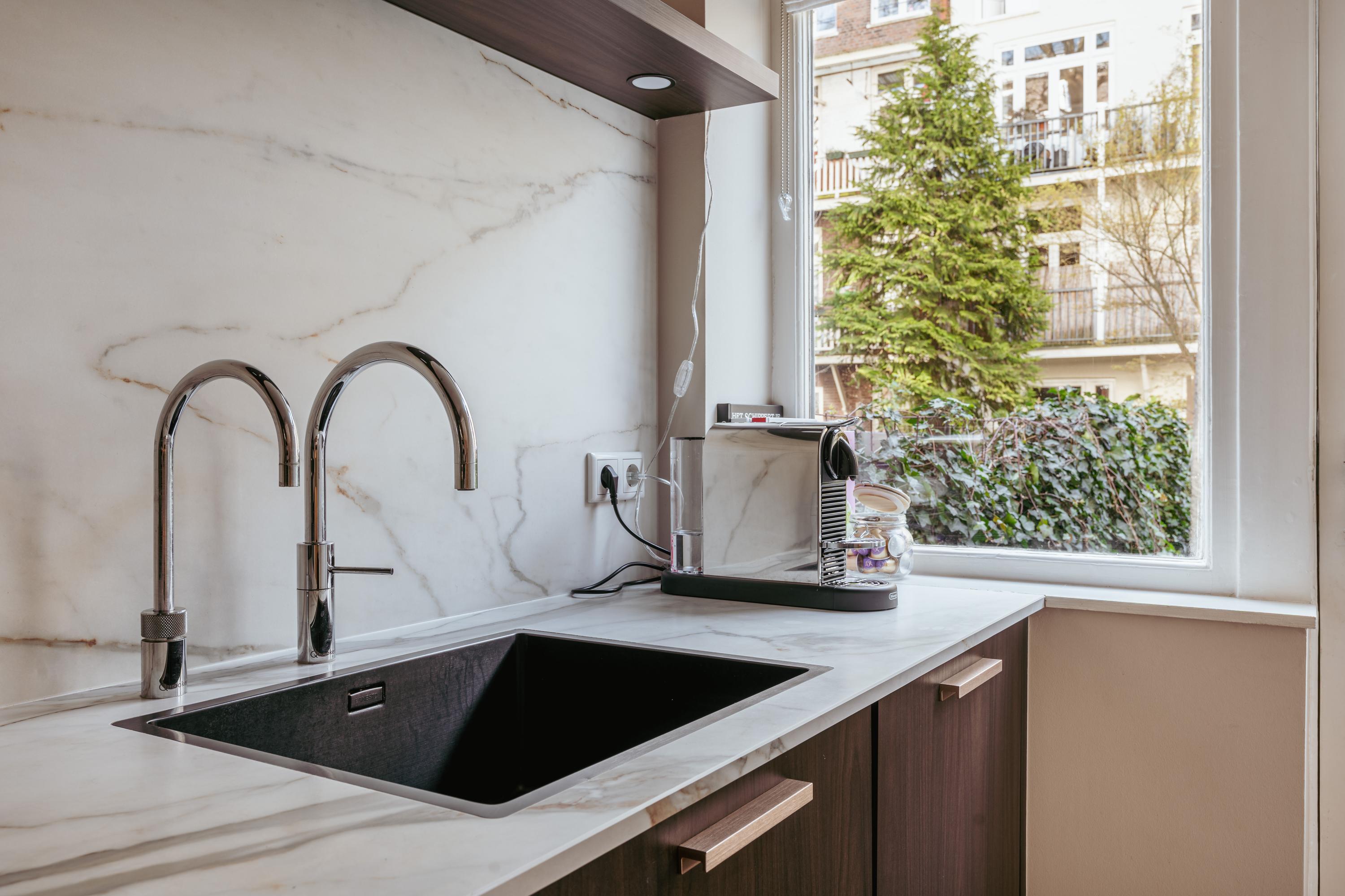 De open keuken grenst aan de eetkamer en ligt iets verhoogd, wat een speels en ruimtelijk effect geeft. De keuken is uitgevoerd in donker eikenhout en voorzien van plafondhoge ingebouwde kasten en inbouwapparatuur, waaronder een dubbele oven, koelkast, vriezer, vaatwasser, inductiekookplaat met geïntegreerde afzuiging en een Quooker.