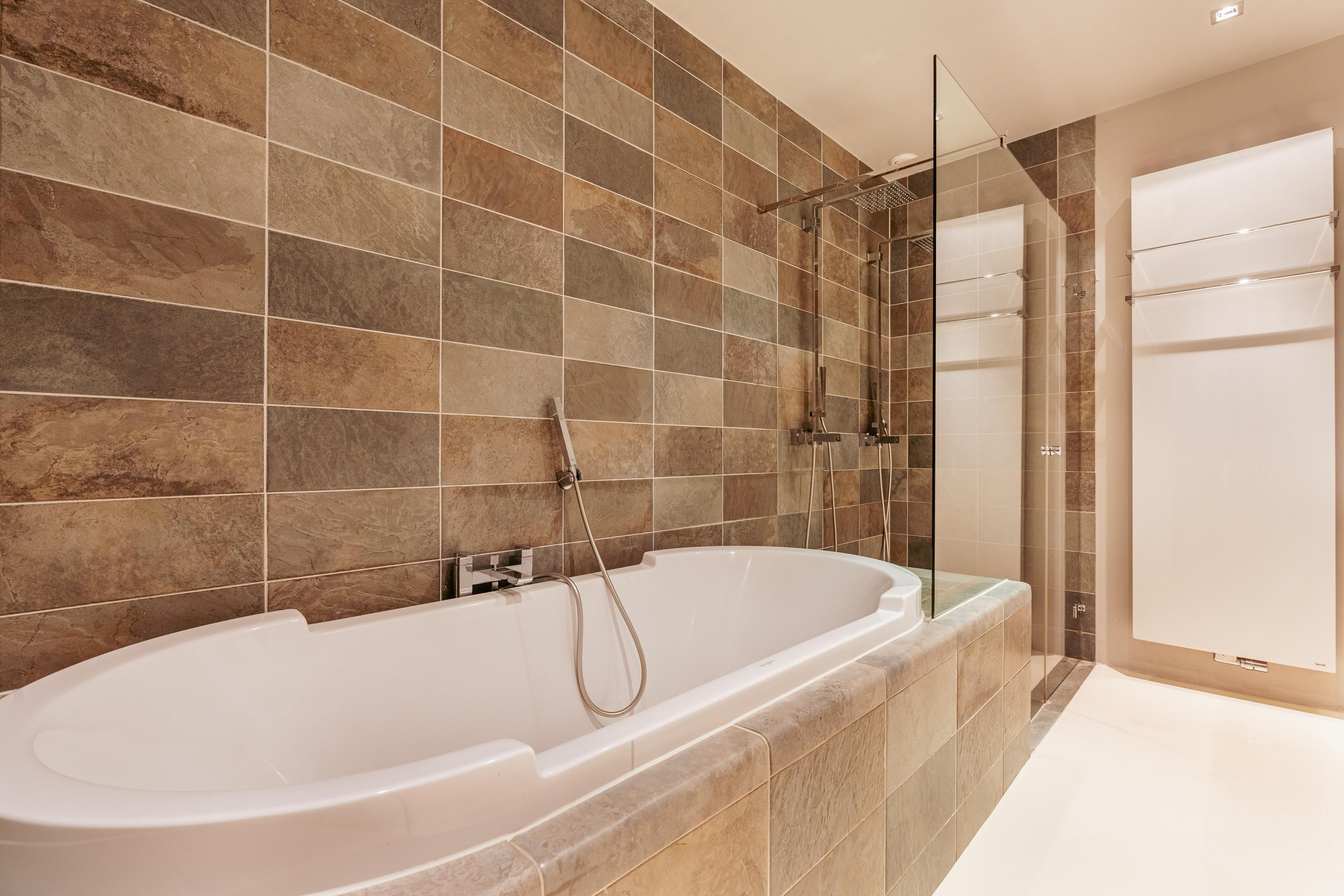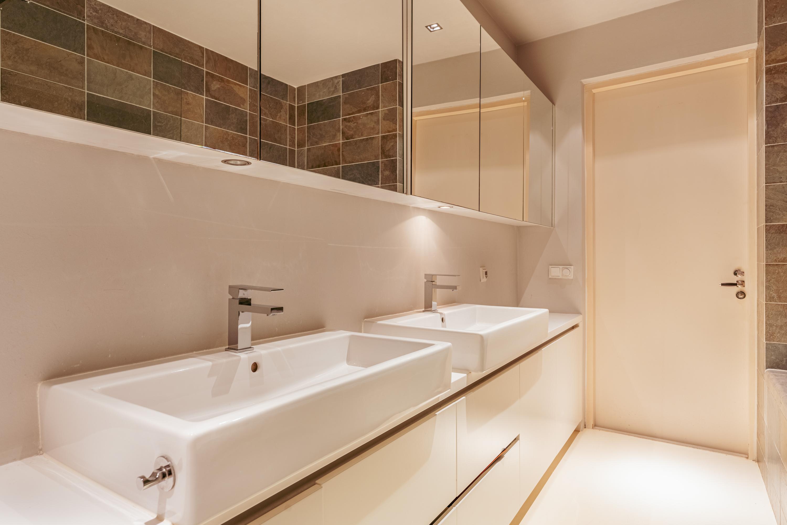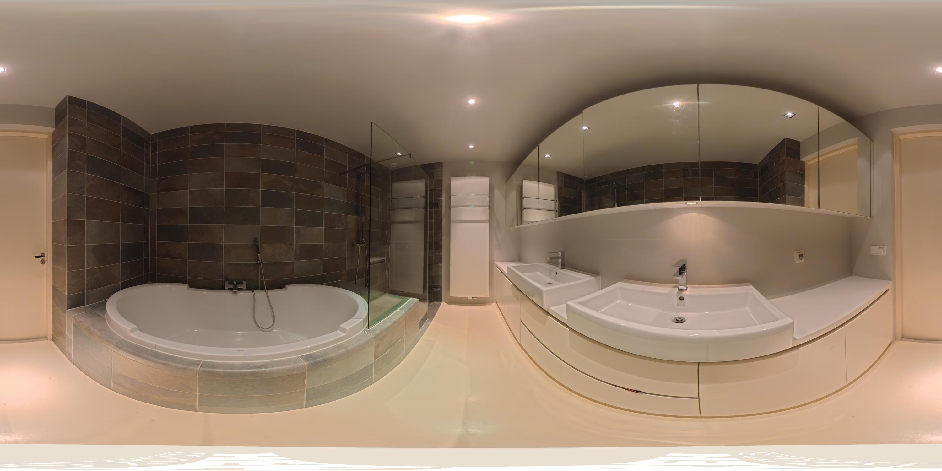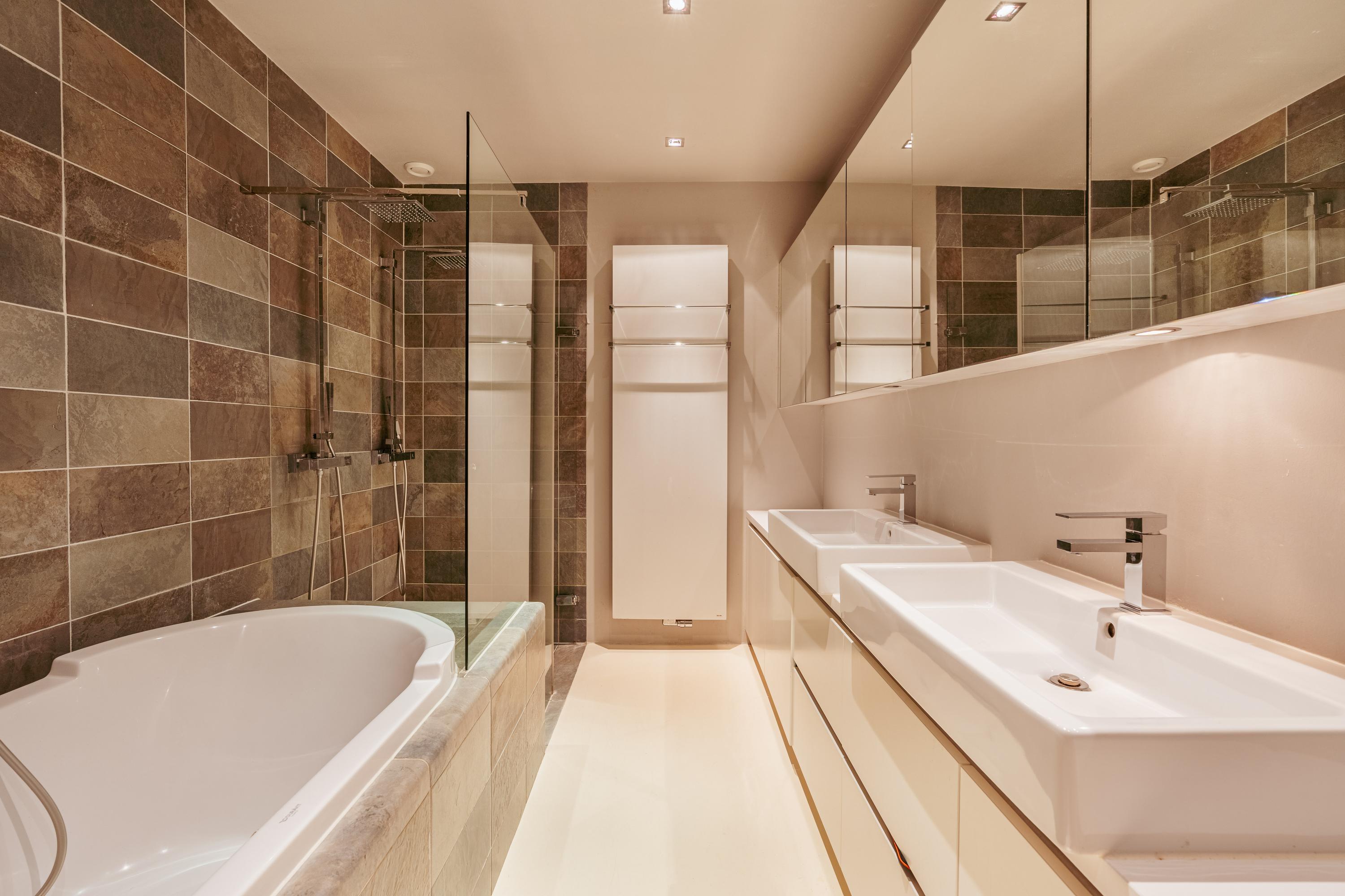 De badkamer is ruim en luxe uitgevoerd en beschikt over een ligbad, een dubbele inloopdouche en een dubbele wastafel met meubel.