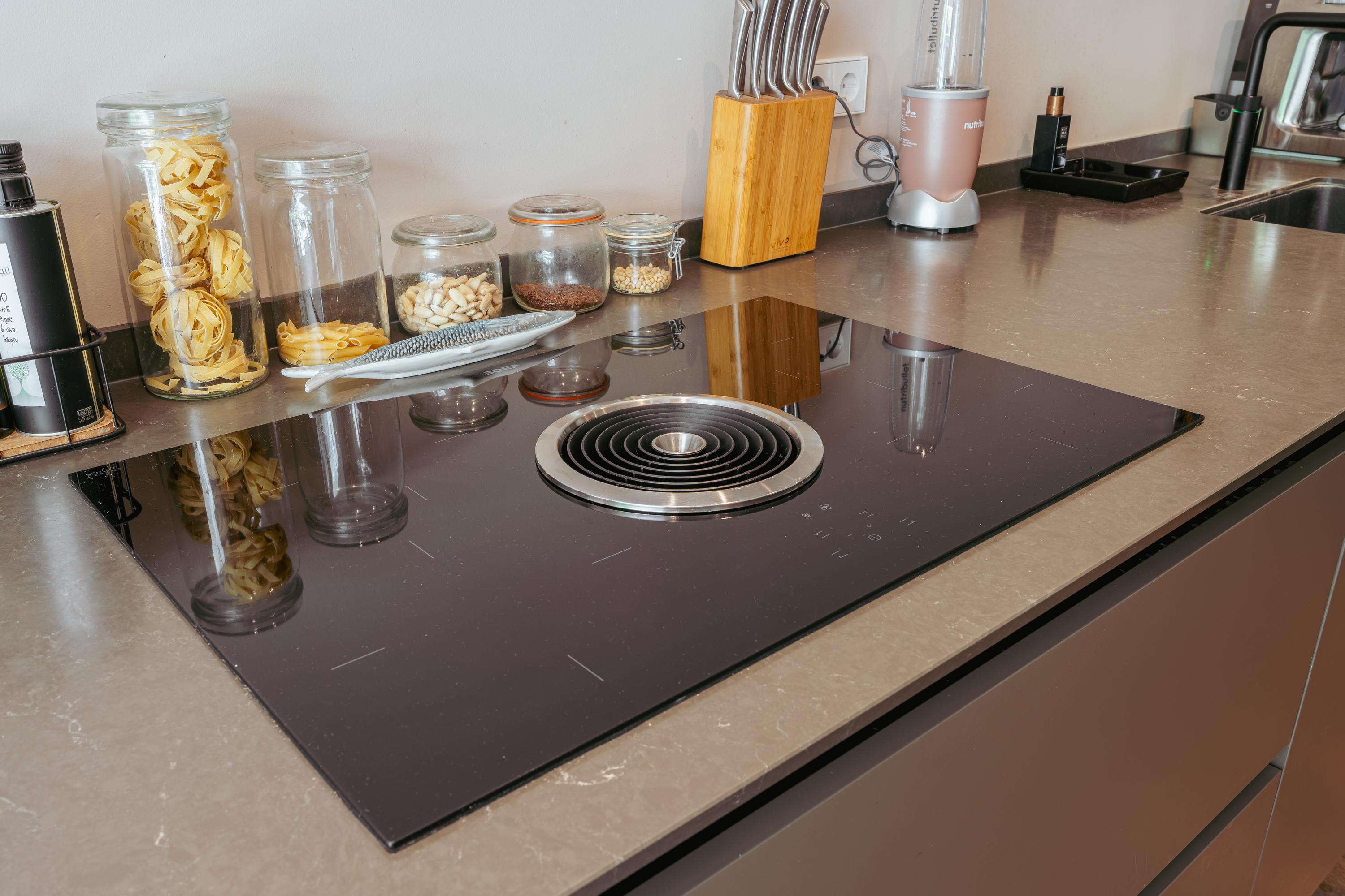 Aan de voorzijde bevindt zich de royale woonkamer, waar eenvoudig een comfortabele zithoek kan worden ingericht. Centraal in de woning treft u de open keuken met een stijlvol kookeiland en een gezellig bargedeelte. De keuken is uitgerust met hoogwaardige inbouwapparatuur, waaronder een 4-pits inductiekookplaat met geïntegreerde afzuiging, een vaatwasser, een koel-/vriescombinatie, een combi-oven en een Quooker. Een paar treden lager komt u in de recent gerealiseerde uitbouw met dakramen, die veel natuurlijk licht binnenlaten. Hier is momenteel een sfeervolle eetruimte ingericht, met daarnaast een extra zithoek rondom een moderne gashaard. Via plafondhoge glazen schuifdeuren bereikt u de fraai aangelegde tuin van circa 32 m², gelegen op het oosten. Daarnaast beschikt u over een praktische berging in de tuin.