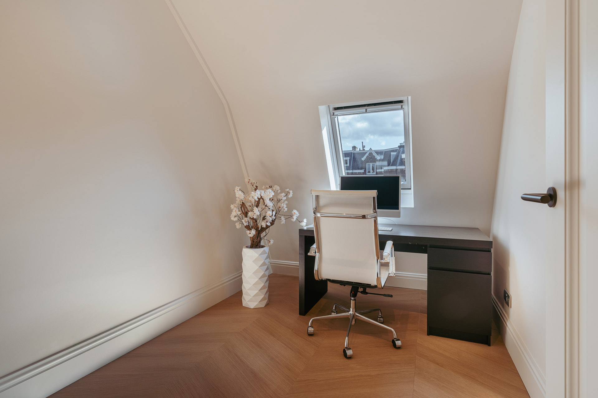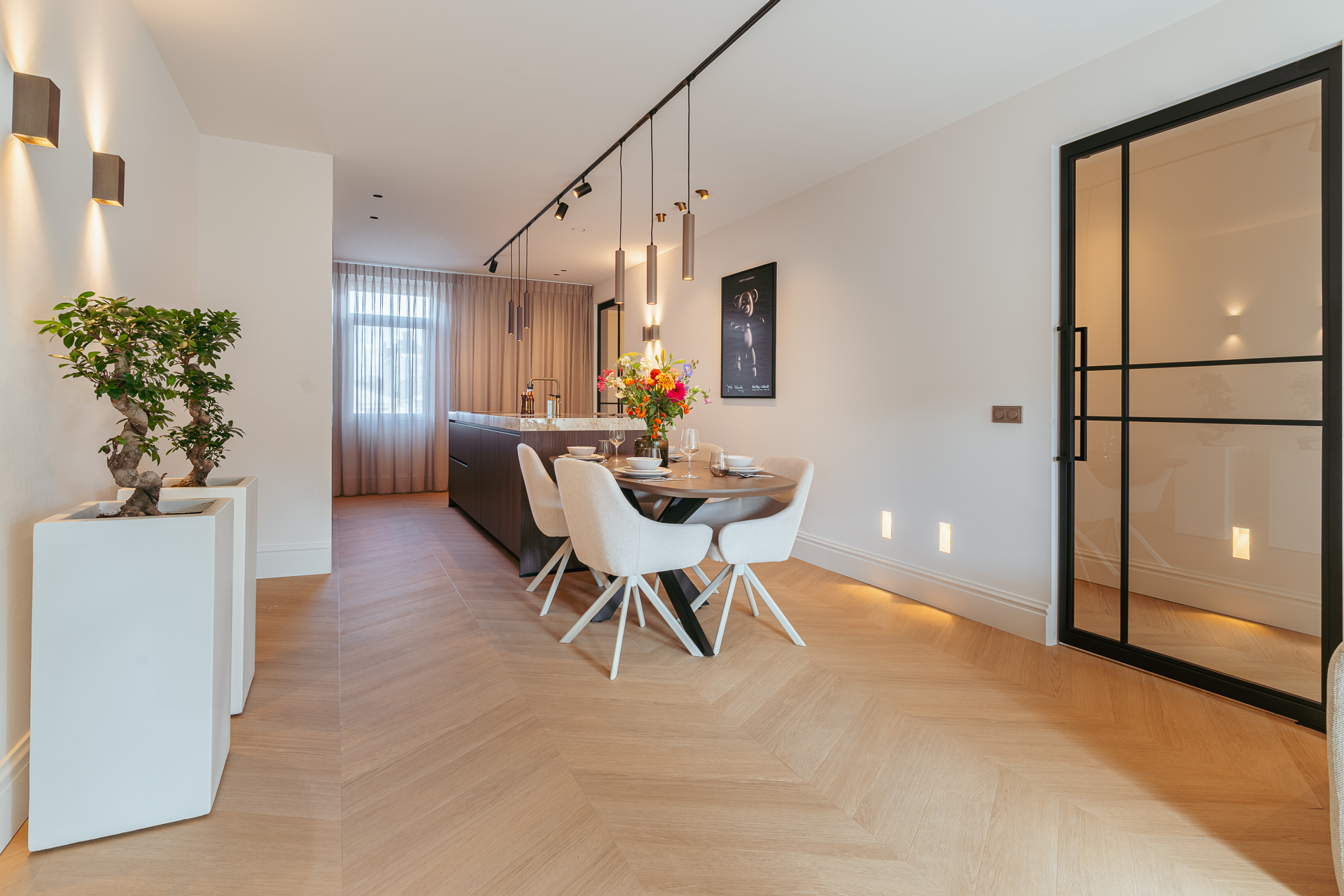 Via het gemeenschappelijke trappenhuis bereikt u de entree van de woning op de derde verdieping. Vanuit uw eigen entree leidt een nette, gerenoveerde trapopgang naar het appartement op de vierde verdieping. Bij binnenkomst valt direct de warme en stijlvolle sfeer op, mede dankzij de zorgvuldig gekozen materialen, sfeervolle verlichting en de prachtige afwerking. Het appartement is hoogwaardig en luxe gerenoveerd, waarbij veel aandacht is besteed aan details. De moderne zwarte stalen deuren in combinatie met klassieke details geven het geheel een eigentijdse uitstraling, iets wat u door het hele appartement terugziet.