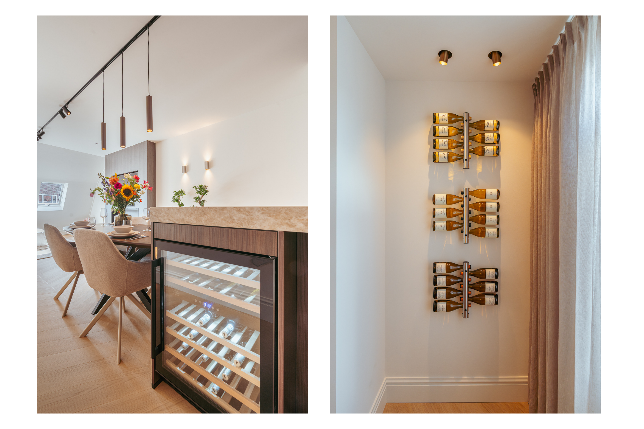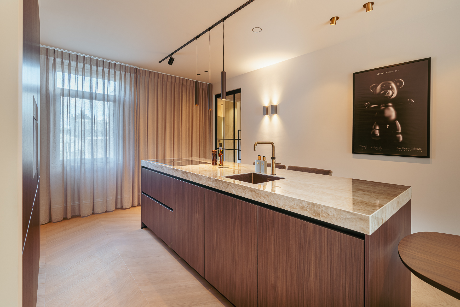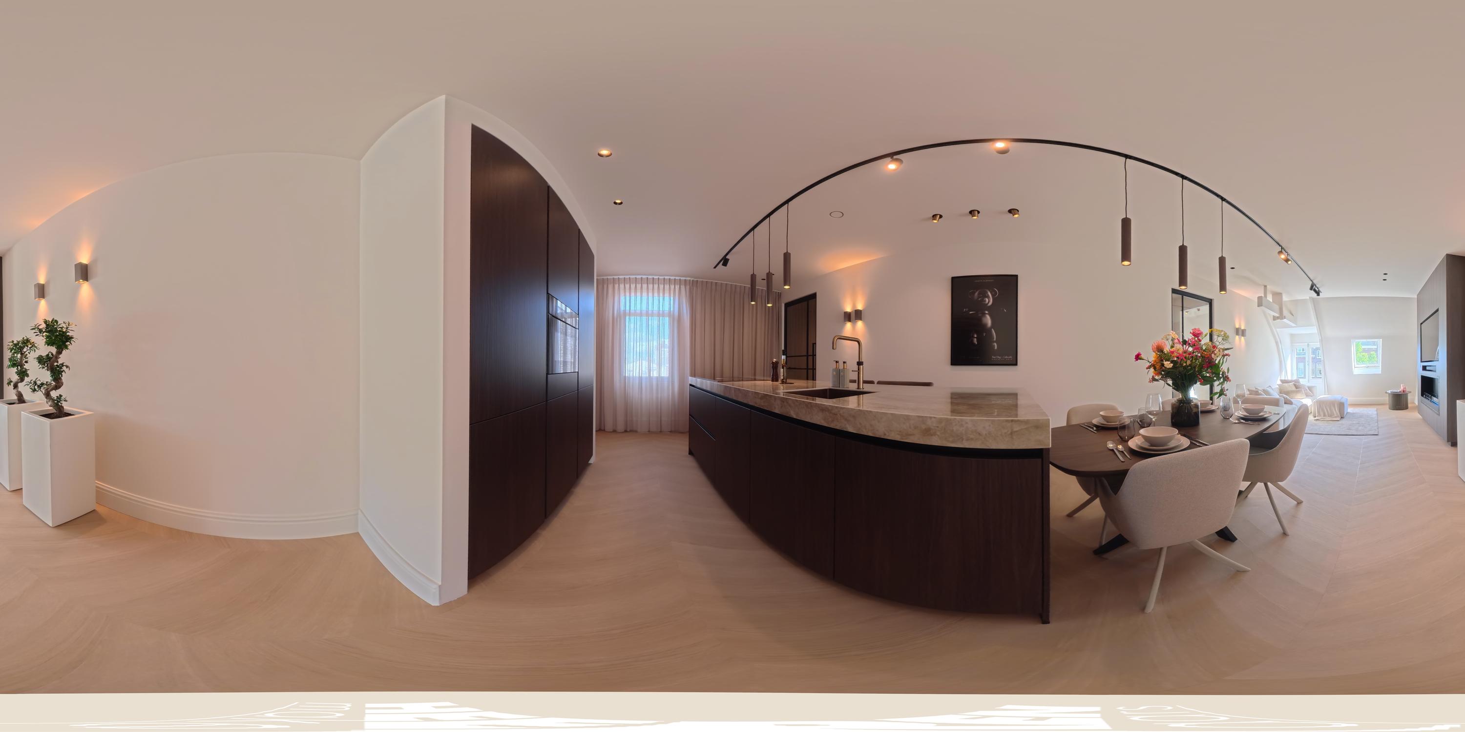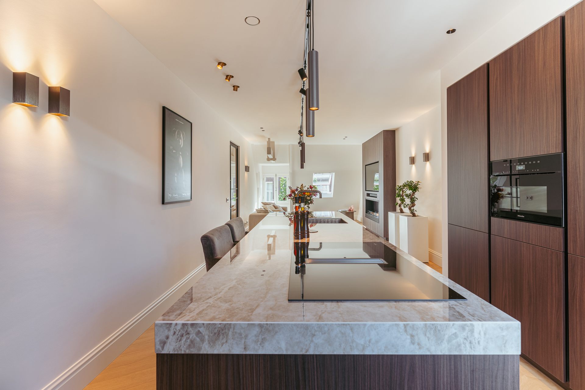 U komt op de bovenste etage binnen via de geïntegreerde schuifdeur in een prachtige, ruime, lange hal die toegang biedt tot alle vertrekken. Het hart van de woning wordt gevormd door de woon- eetkeuken, die zich uitstrekt over de volledige lengte van het appartement. Dankzij ramen aan beide zijden geniet de ruimte van veel natuurlijk licht. Aan de voorzijde bevindt zich de zithoek met een sfeervolle bio-ethanol haard, stijlvol geïntegreerd in een ingebouwde kast met tv. Aan de achterzijde ligt de moderne open keuken met kookeiland. De keuken is voorzien van een Dekton werkblad en bevat daarnaast alle denkbare luxe inbouwapparatuur, waaronder een wijnkoeler, Quooker, vaatwasser, koelkast/vriezer, Miele combi-oven en een Miele inductie kookplaat met geïntegreerd afzuigsysteem. Het bargedeelte maakt de keuken bovendien tot een gezellige plek om samen te koken of een glas wijn te drinken met familie en vrienden.
