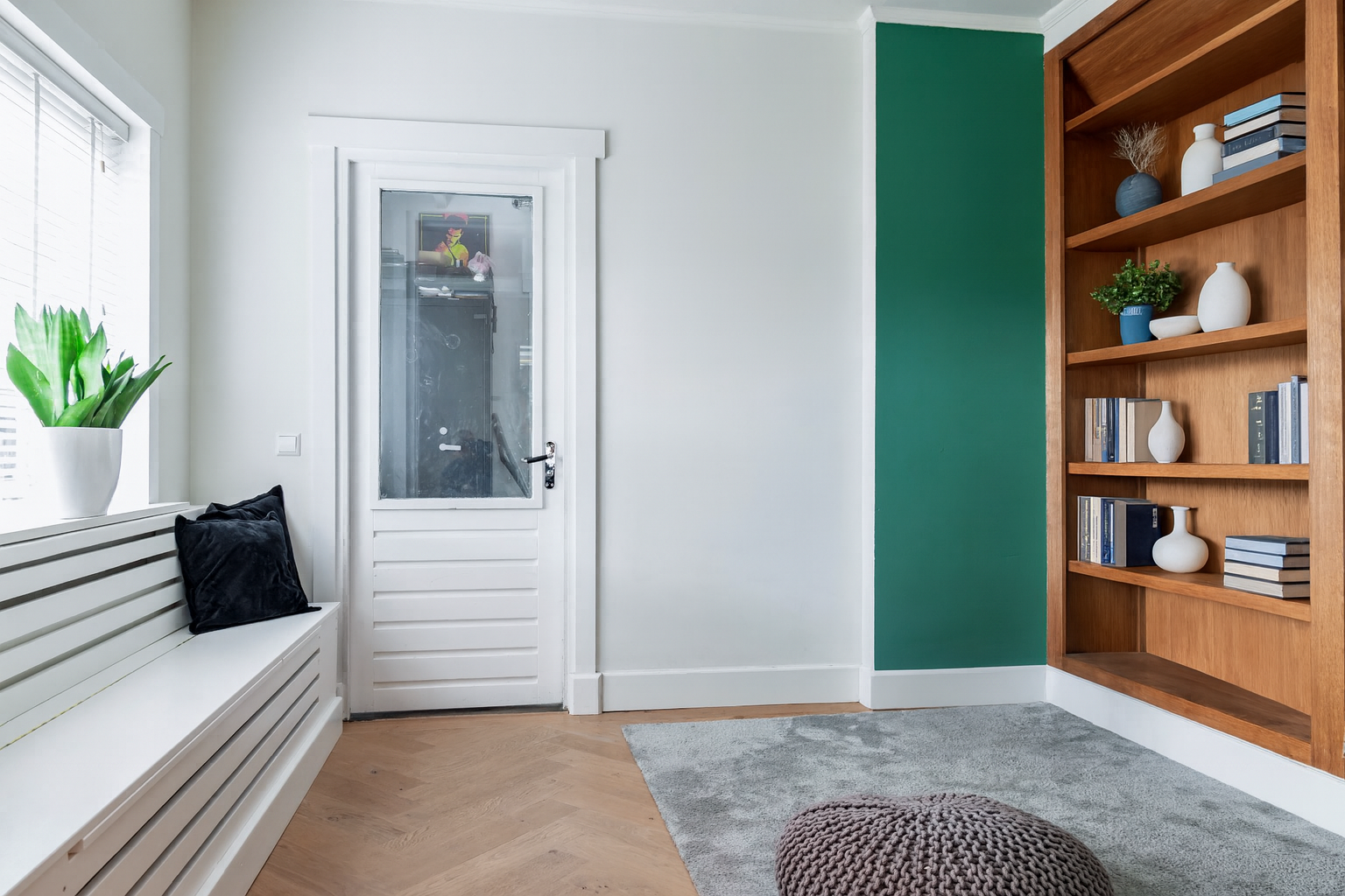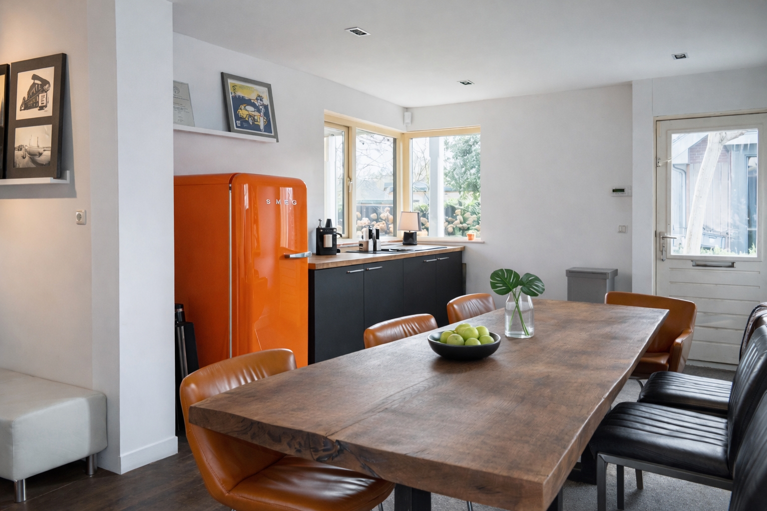 Entree met originele granitovloer, trapopgang, toilet en toegang tot de ruime kelder. De woonkamer met erker en houthaard biedt een fijne, royale leefruimte met volop mogelijkheden voor een comfortabele loungehoek. De luxe woonkeuken vormt het hart van de woning: ruim, licht en stijlvol afgewerkt, met kookeiland en hoogwaardige inbouwapparatuur. Vanuit de keuken is er een prettige verbinding met de entree en met de achtergelegen bijkeuken, inclusief een separate wasruimte.