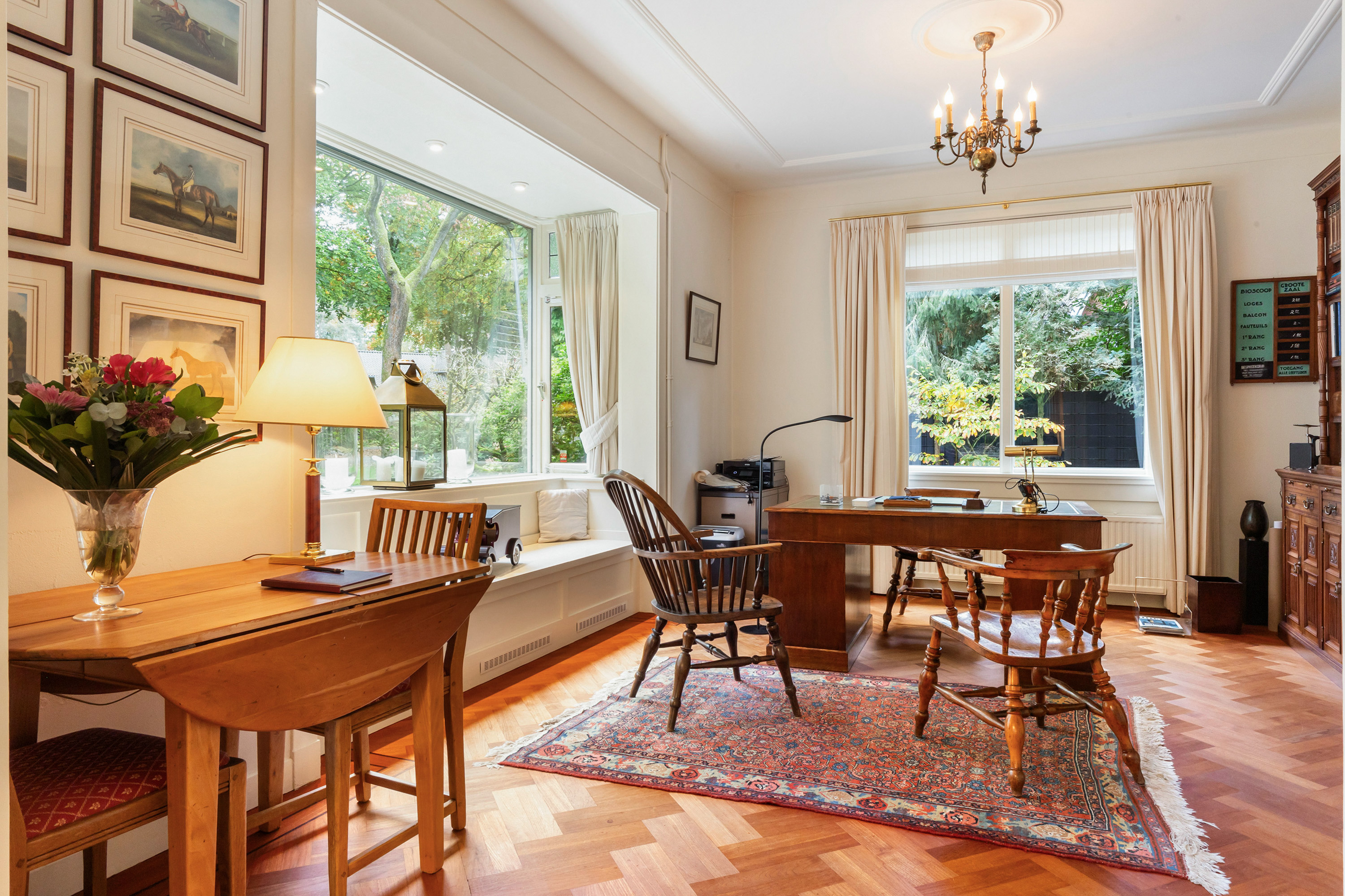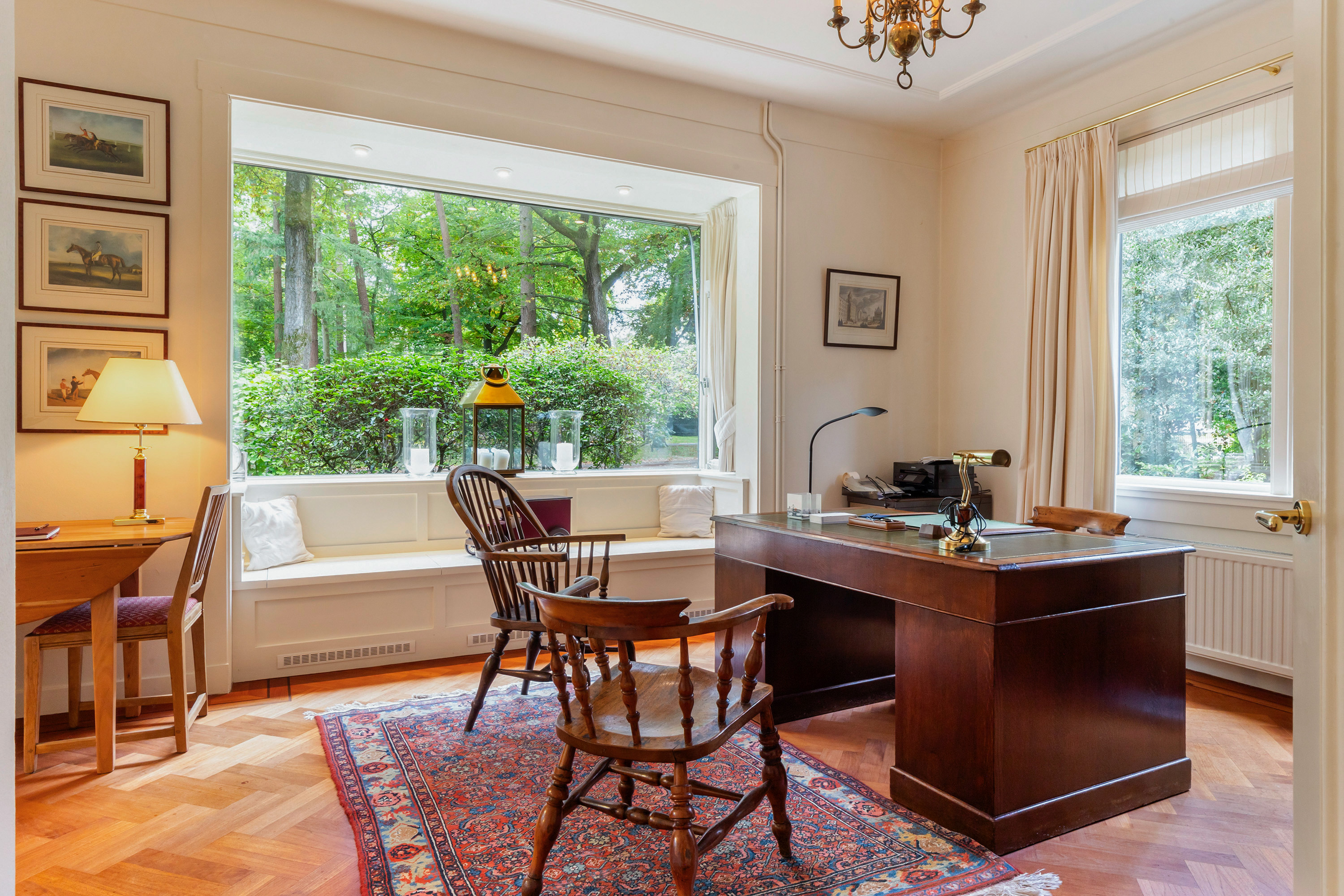 De werkkamer aan de voorzijde van de woning heeft een visgraatparketvloer met dubbele rand en bies, en biedt uitzicht op de voortuin en royale oprit. In de erker is een stijlvol maatwerkbank geïntegreerd met convectorverwarming, terwijl de zonwering aan de voorzijde het comfort vergroot. De ramen geven deze kamer een warme, klassieke uitstraling.