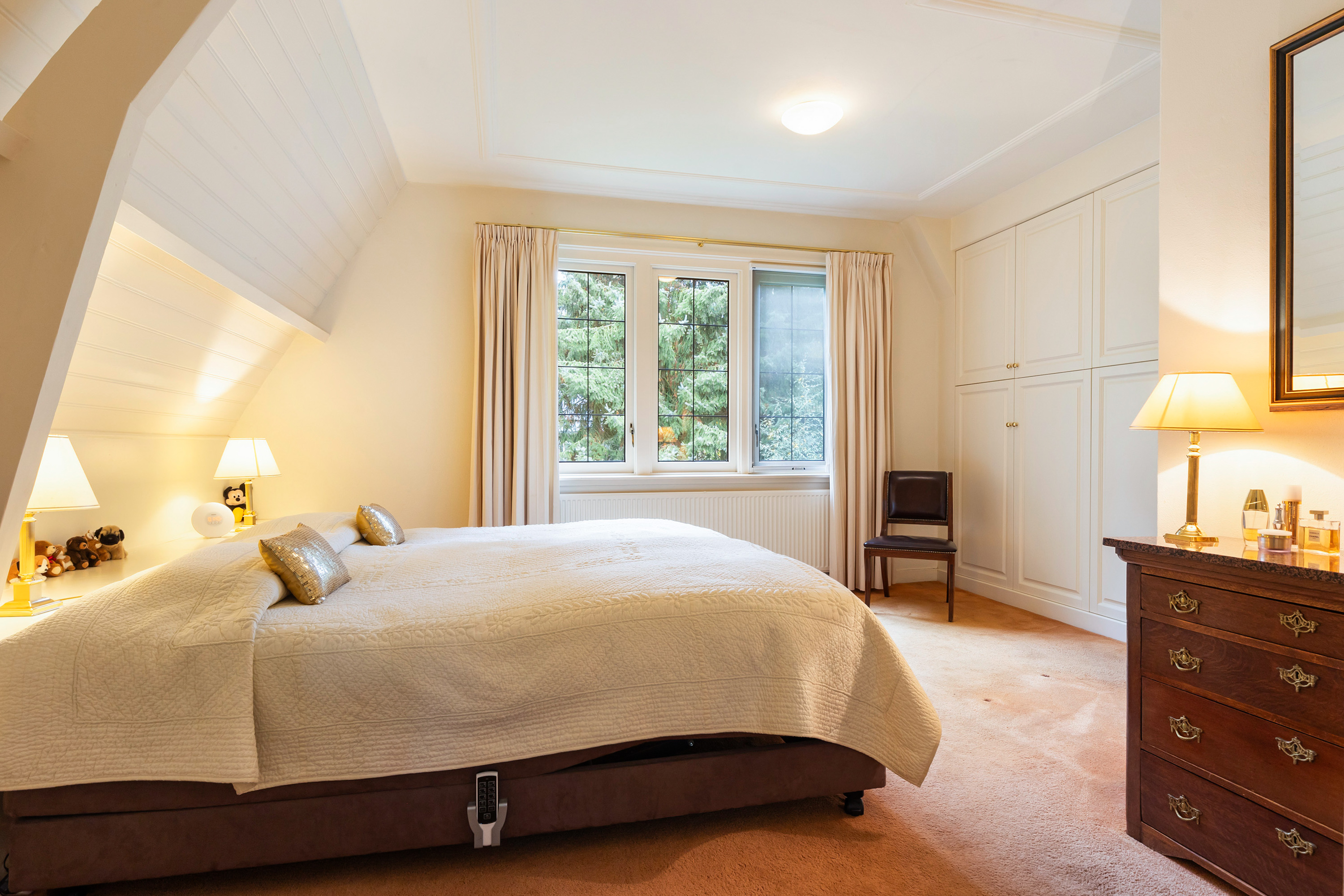 De hoofdslaapkamer ligt aan de zijkant van de woning en is royaal van formaat. Hier is een luxe inbouwkast geplaatst met acht deuren, voorzien van hang- en legruimte en lades. Achter het bed is extra bergruimte op maat aangebracht, wat de kamer zowel praktisch als stijlvol maakt.