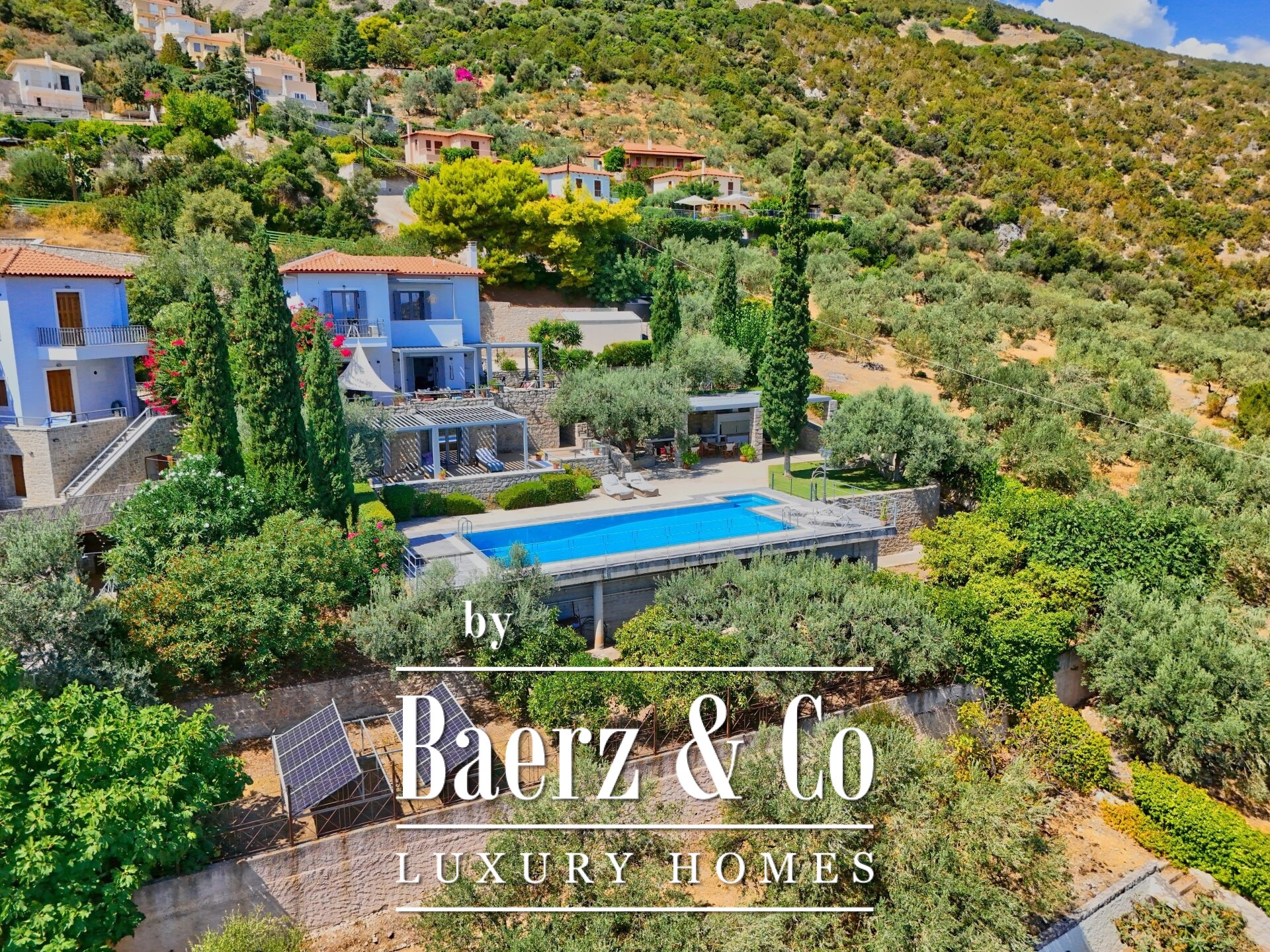 De aangelegde tuin is omheind met natuurstenen muren en beschikt over een zwembad van 70 m² met weids uitzicht, cipressen, olijfbomen en zorgvuldig ontworpen buitenruimtes. Extra voorzieningen zijn onder meer een stenen kapel, overdekte parkeergelegenheid voor drie auto’s en energiezuinige vernieuwingen zoals nieuwe aluminium kozijnen, dubbele beglazing, een zonneboilersysteem, een modern alarmsysteem en vloerverwarming. Drie grote watertanks dragen bij aan duurzaamheid en comfort.