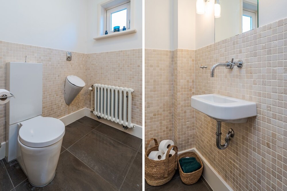 De tweede badkamer is voorzien van een vloertegels, deels betegelde wanden, een inloopdouche, een ligbad en 3 wastafels die geplaatst zijn op kinderhoogte. Op de overloop bevindt zich een separate toiletruimte.