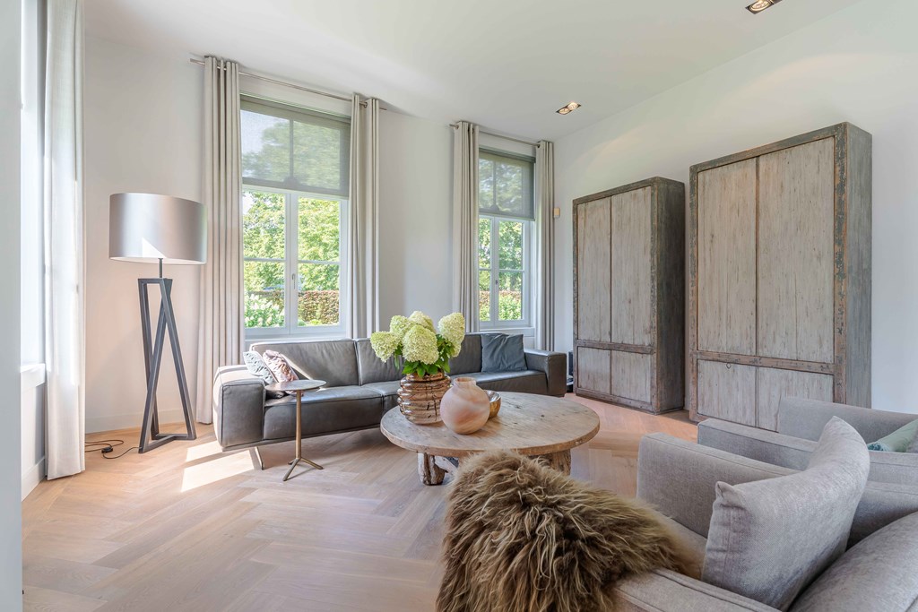 De zitkamer is voorzien van een parketvloer, een ingebouwde gashaard, inbouwverlichting en een tuindeur. Door de grote raampartijen aan zowel de voor, zij-als achterzijde is er veel natuurlijke lichtinval en heeft u een heerlijk uitzicht op de tuin.
