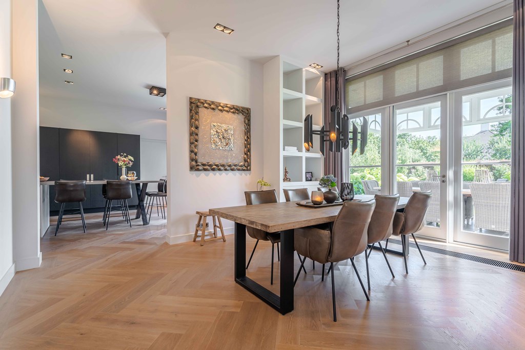 De eetkamer is gesitueerd in het midden en is voorzien van een parketvloer en een tuindeur voor direct toegang tot de veranda. Hierdoor is, zeker met mooi weer, de veranda een schakel tussen het binnen-en buitenleven.