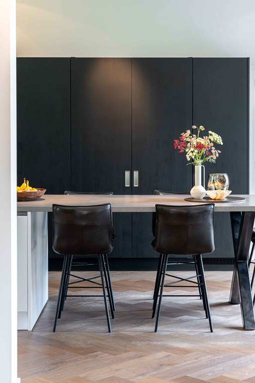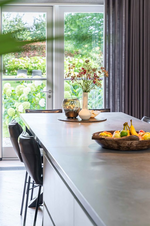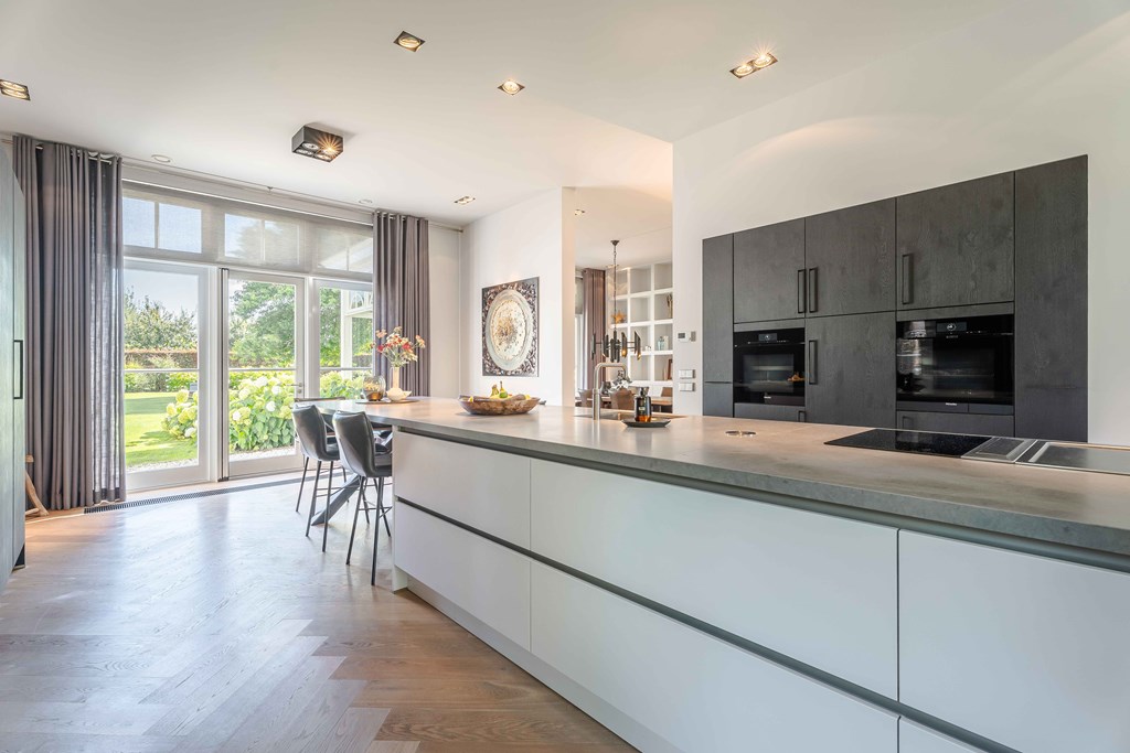 Het kloppende hart van deze woning is uiteraard de prachtige leefkeuken. Vanwege het open karakter van deze ruimte is dit de plek waar u als gezin samen kunt komen. Het grote eiland in het midden is een plek om zowel te koken als te zitten.