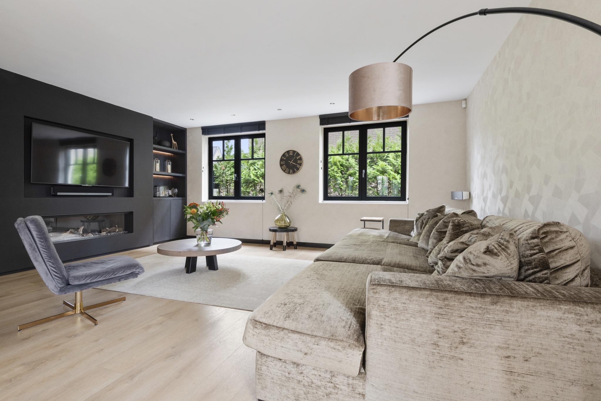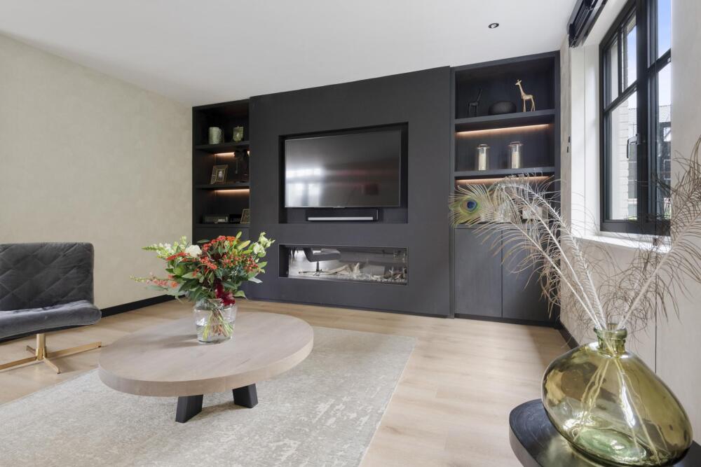 De ruime woon- en eetkamer biedt plek voor het hele gezin, met een op maat gemaakte cinewall en sfeervolle HR-gashaard voor extra warmte en gezelligheid.