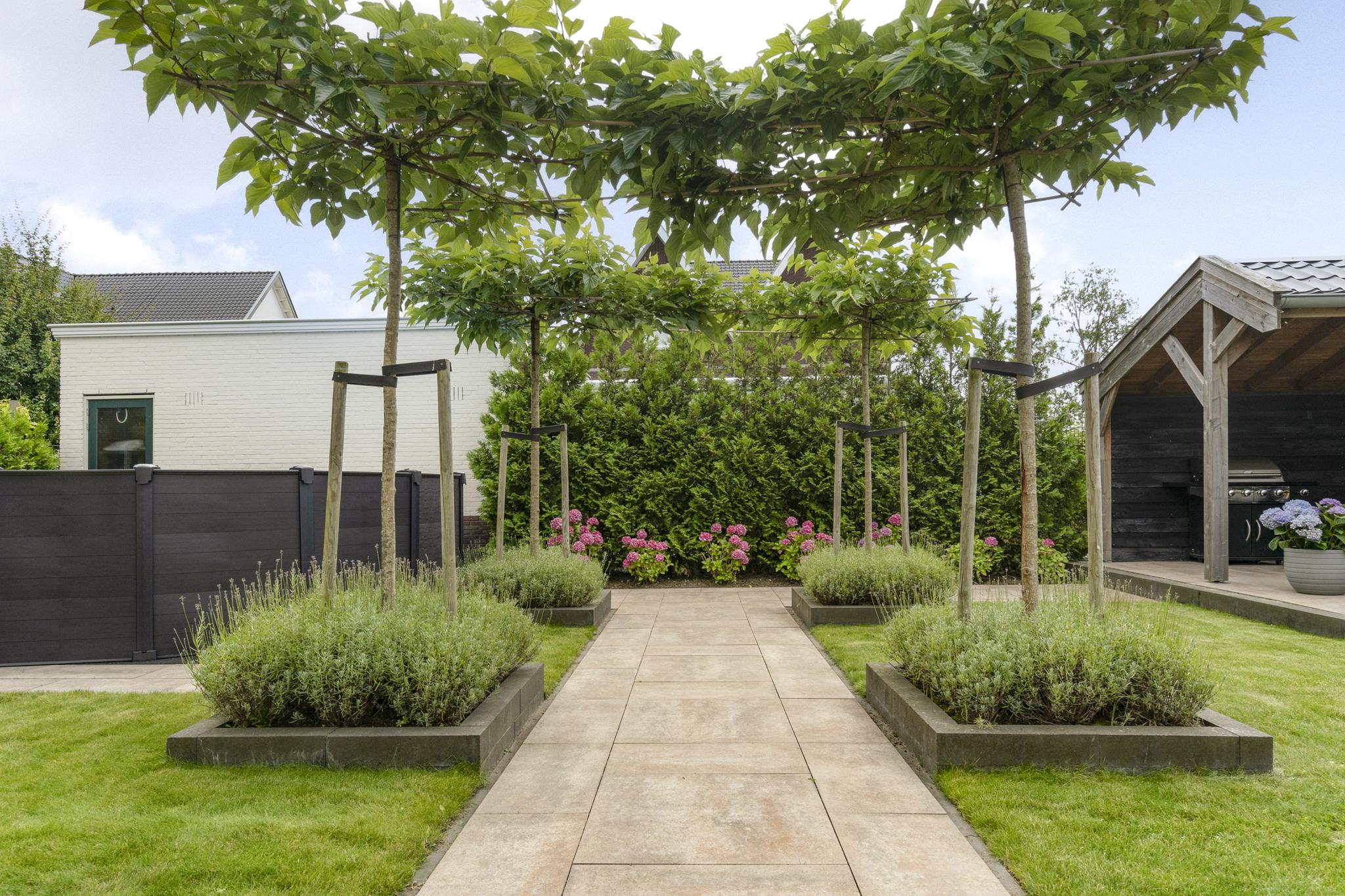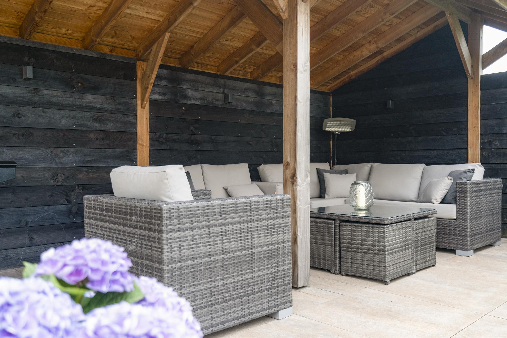 Via meerdere openslaande deuren vanuit de woonkamer heeft u toegang tot de tuin. De fraai aangelegde achtertuin is ingericht met meerder loungeplekjes, een overkapping met heater en toegang tot de garage.