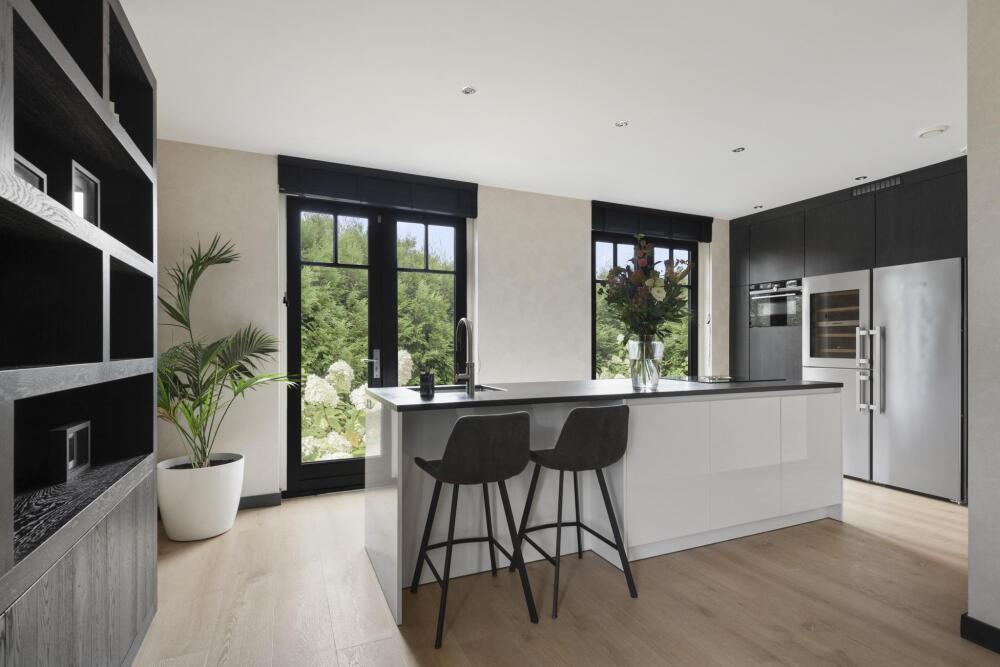 De luxe keuken met kookeiland is uitgerust met hoogwaardige inbouwapparatuur, waaronder een Miele stoomoven, wijnklimaatkoeling, Siemens combi oven, inbouwkoffiemachine, Bora inductiekookplaat met geïntegreerde afzuiging, Siemens vaatwasmachine en een koel- vriescombinatie.