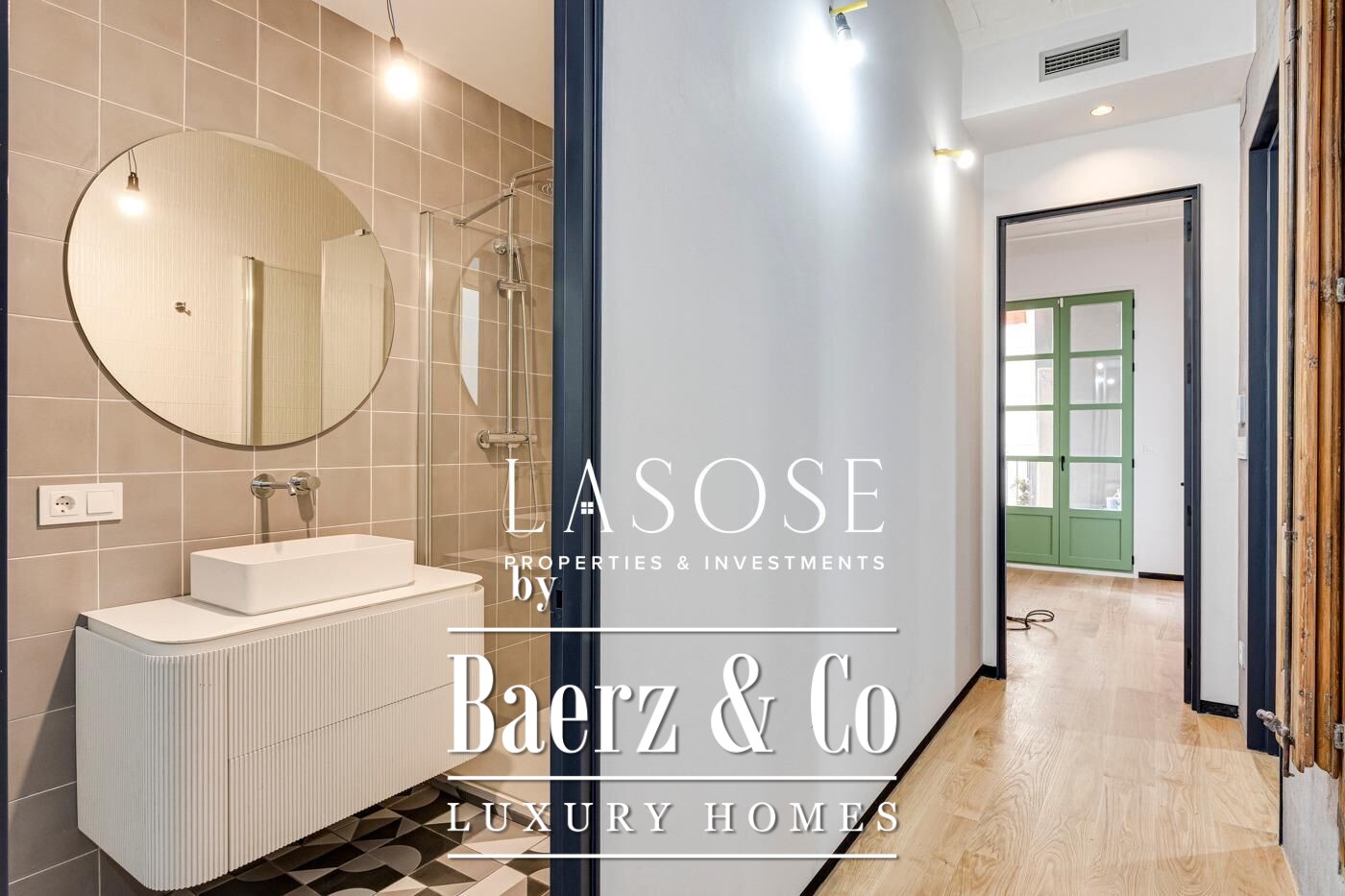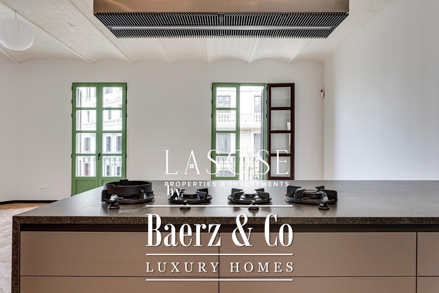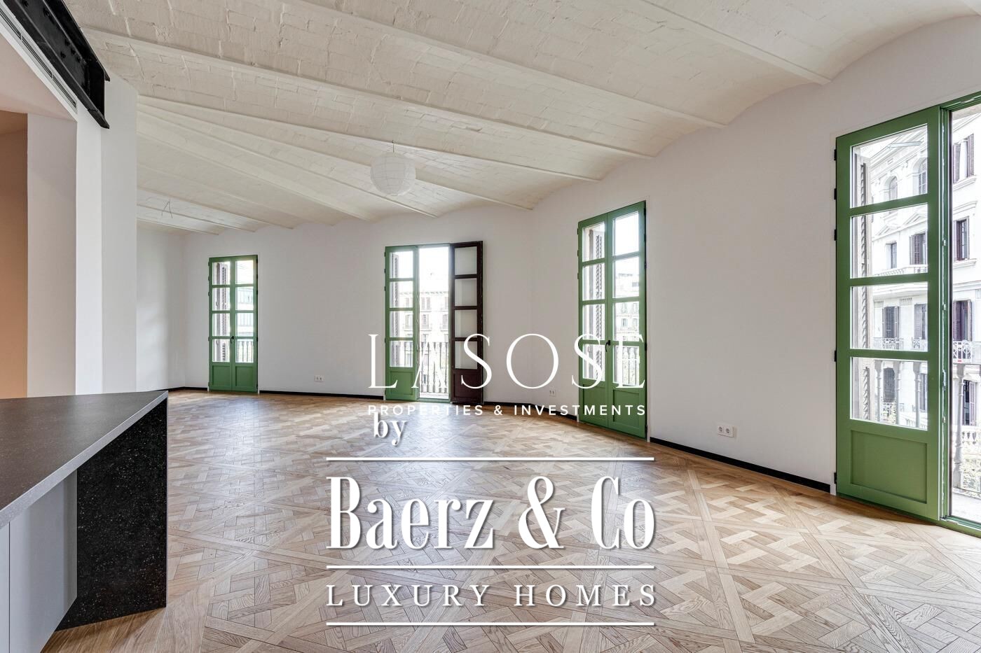 Flat Barcelona vangt de tijdloze essentie van stadswonen in een statig pand; 182 m² verfijnde leefruimte is zorgvuldig verdeeld in onderscheidende dag- en nachtzones. De hoofdruimte opent naar vijf balkons op het noordwesten, waardoor iedere kamer zacht wordt gevuld met natuurlijk licht en het levendige ritme van de stad onmiskenbaar voelbaar is. Vrije uitzichten en een vloeiende verbinding tussen woon- en eetgedeelte zorgen voor een royaal gevoel, perfect voor contemplatie of sfeervolle bijeenkomsten.