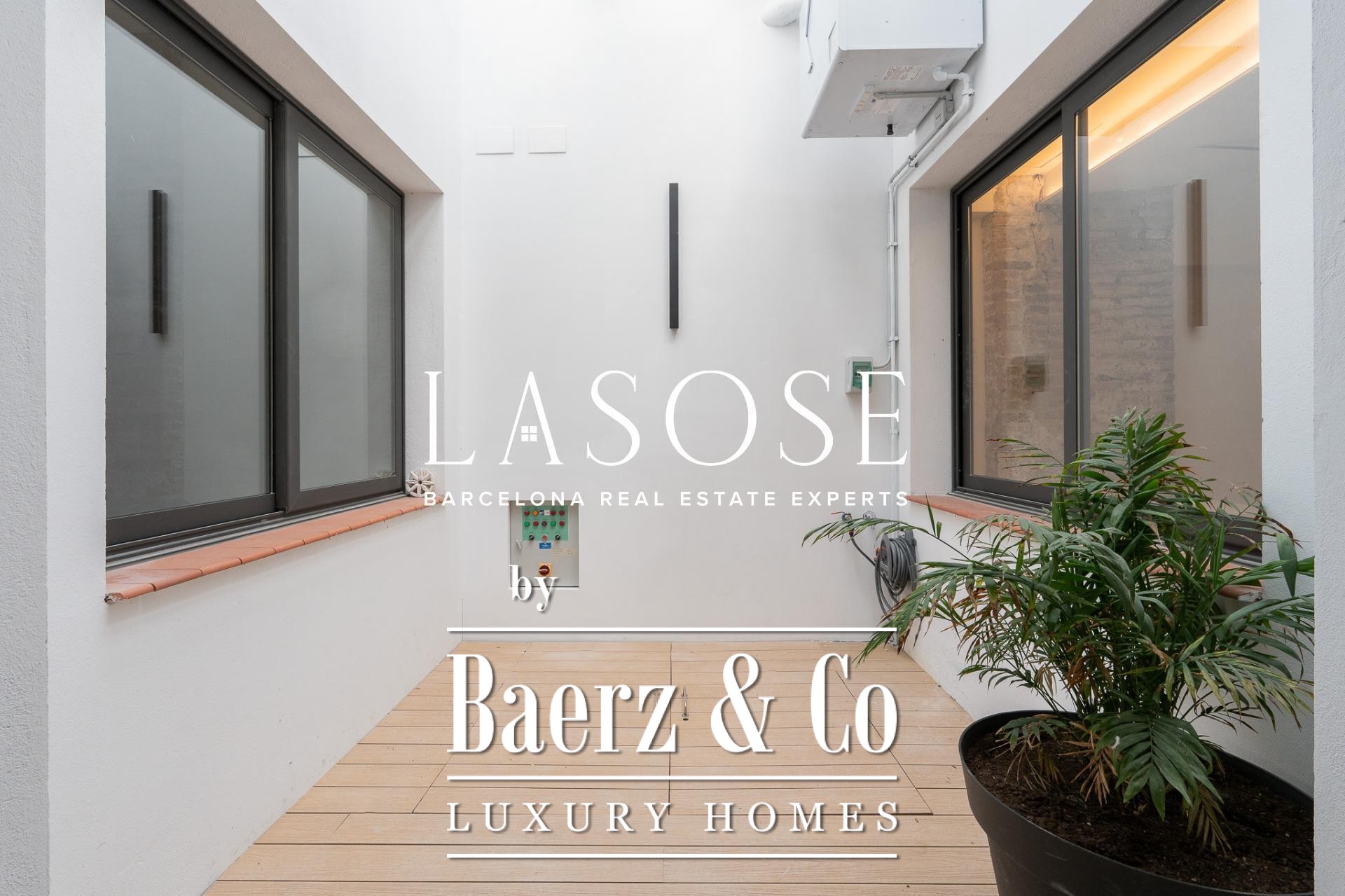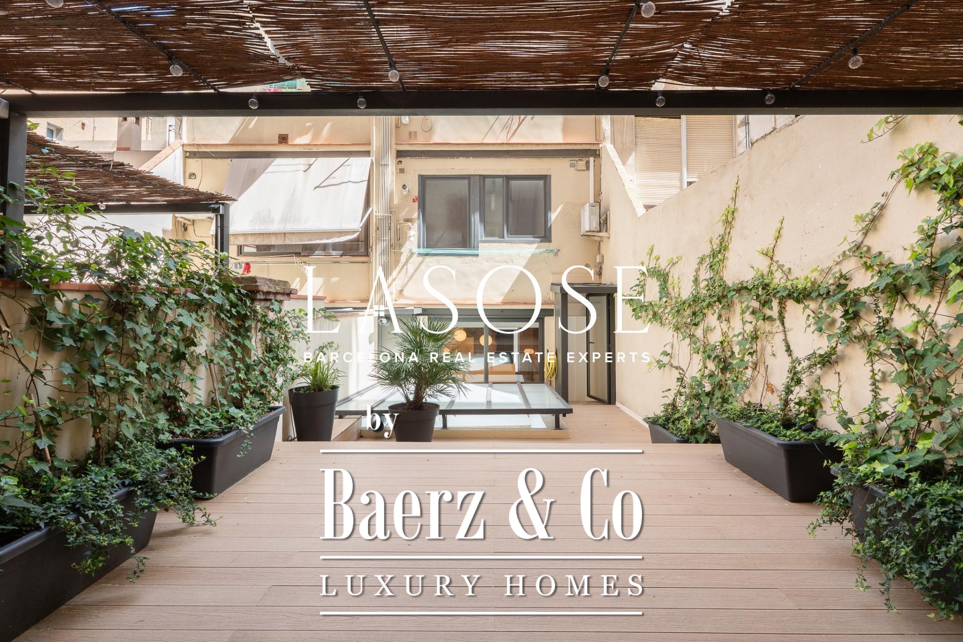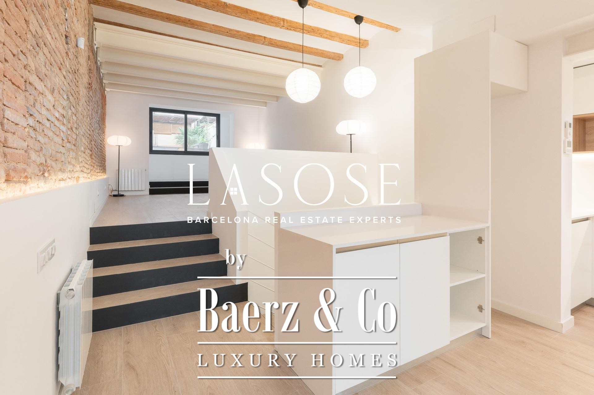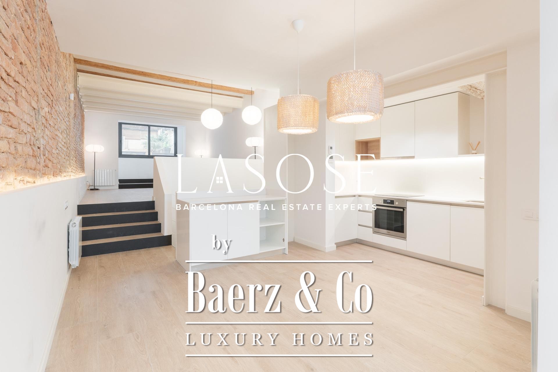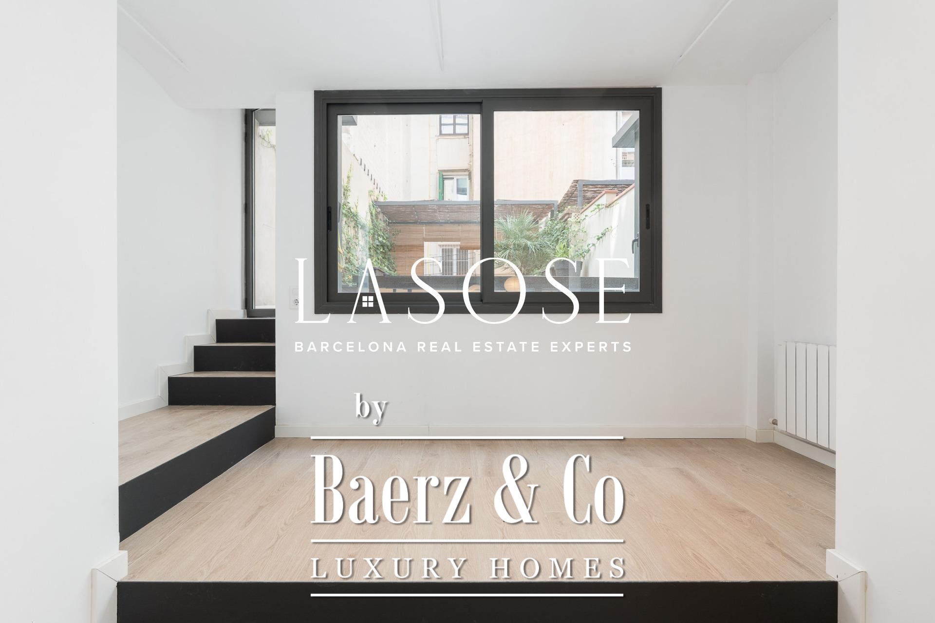 LASOSE presents an exclusive apartment in the charming neighborhood of Gràcia, located in a quiet passage, between Paseo de Sant Joan and Travessera de Gràcia. It is an inverted duplex, renovated brand new, with an area of 151 m² built and direct and independent access from the street, which gives it exceptional privacy.. . On the main floor, of 79 m², there is an open space with different levels that organize the day area. This ambience has a spacious living room, a fully equipped designer kitchen with dining space and a guest toilet.. . From the living room there is access to a charming private terrace of 45 m2, ideal for enjoying quiet moments outdoors.. . The lower floor, of 90 m², houses the sleeping area with three bedrooms, two bathrooms and a practical laundry area. The master suite stands out for its spaciousness and for having its own patio, creating an oasis of calm within the house. In addition, a versatile loft can be used as a study, dressing room or additional sleeping area. A bright central courtyard with skylights bathes this floor with natural light, providing a warm and welcoming atmosphere.. . This property has been refurbished with top quality materials, respecting and enhancing