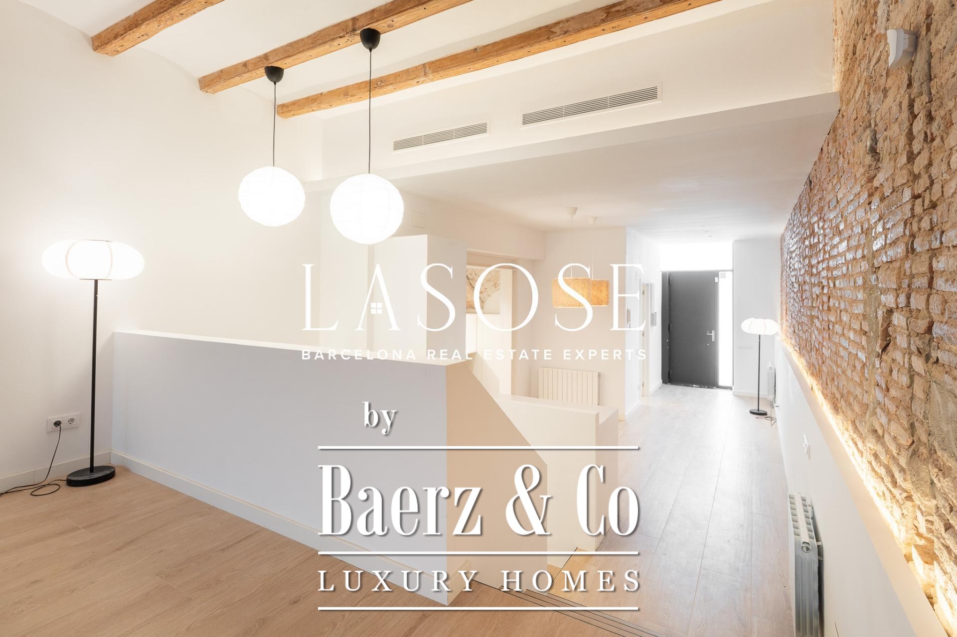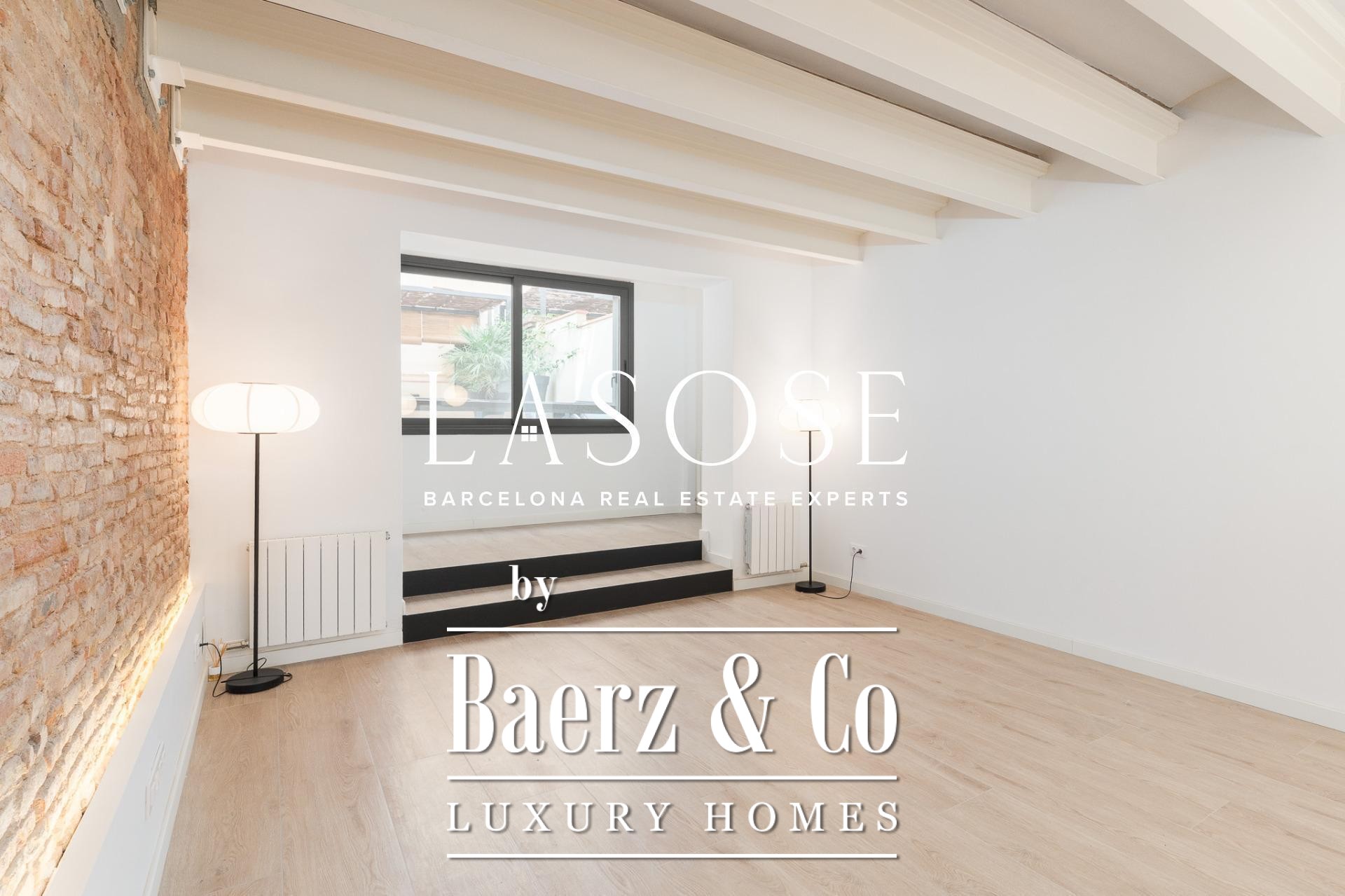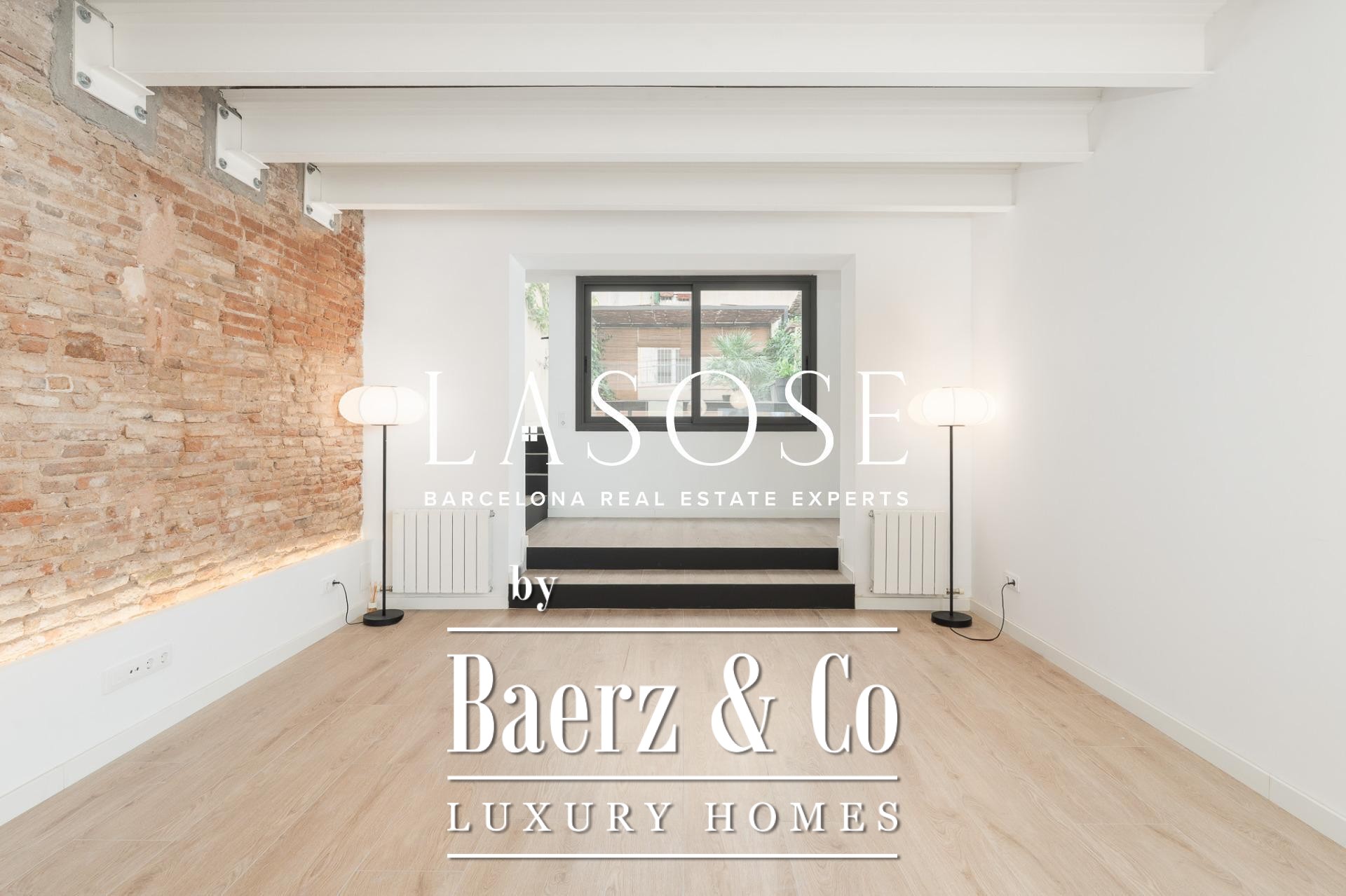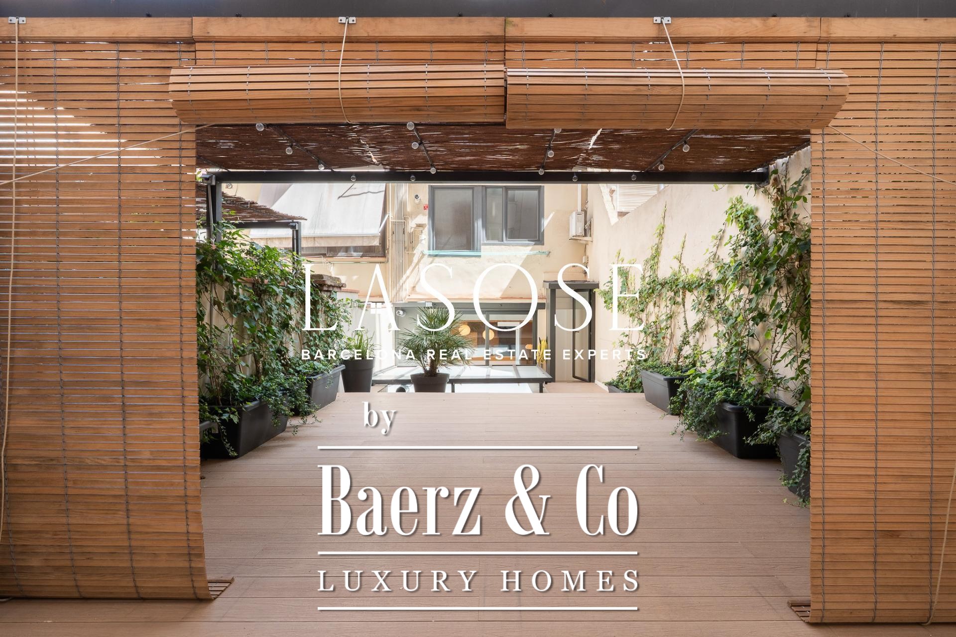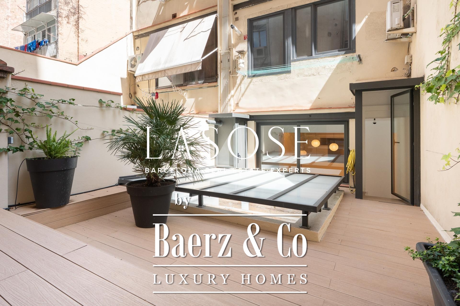 LASOSE presents an exclusive apartment in the charming neighborhood of Gràcia, located in a quiet passage, between Paseo de Sant Joan and Travessera de Gràcia. It is an inverted duplex, renovated brand new, with an area of 151 m² built and direct and independent access from the street, which gives it exceptional privacy.. . On the main floor, of 79 m², there is an open space with different levels that organize the day area. This ambience has a spacious living room, a fully equipped designer kitchen with dining space and a guest toilet.. . From the living room there is access to a charming private terrace of 45 m2, ideal for enjoying quiet moments outdoors.. . The lower floor, of 90 m², houses the sleeping area with three bedrooms, two bathrooms and a practical laundry area. The master suite stands out for its spaciousness and for having its own patio, creating an oasis of calm within the house. In addition, a versatile loft can be used as a study, dressing room or additional sleeping area. A bright central courtyard with skylights bathes this floor with natural light, providing a warm and welcoming atmosphere.. . This property has been refurbished with top quality materials, respecting and enhancing