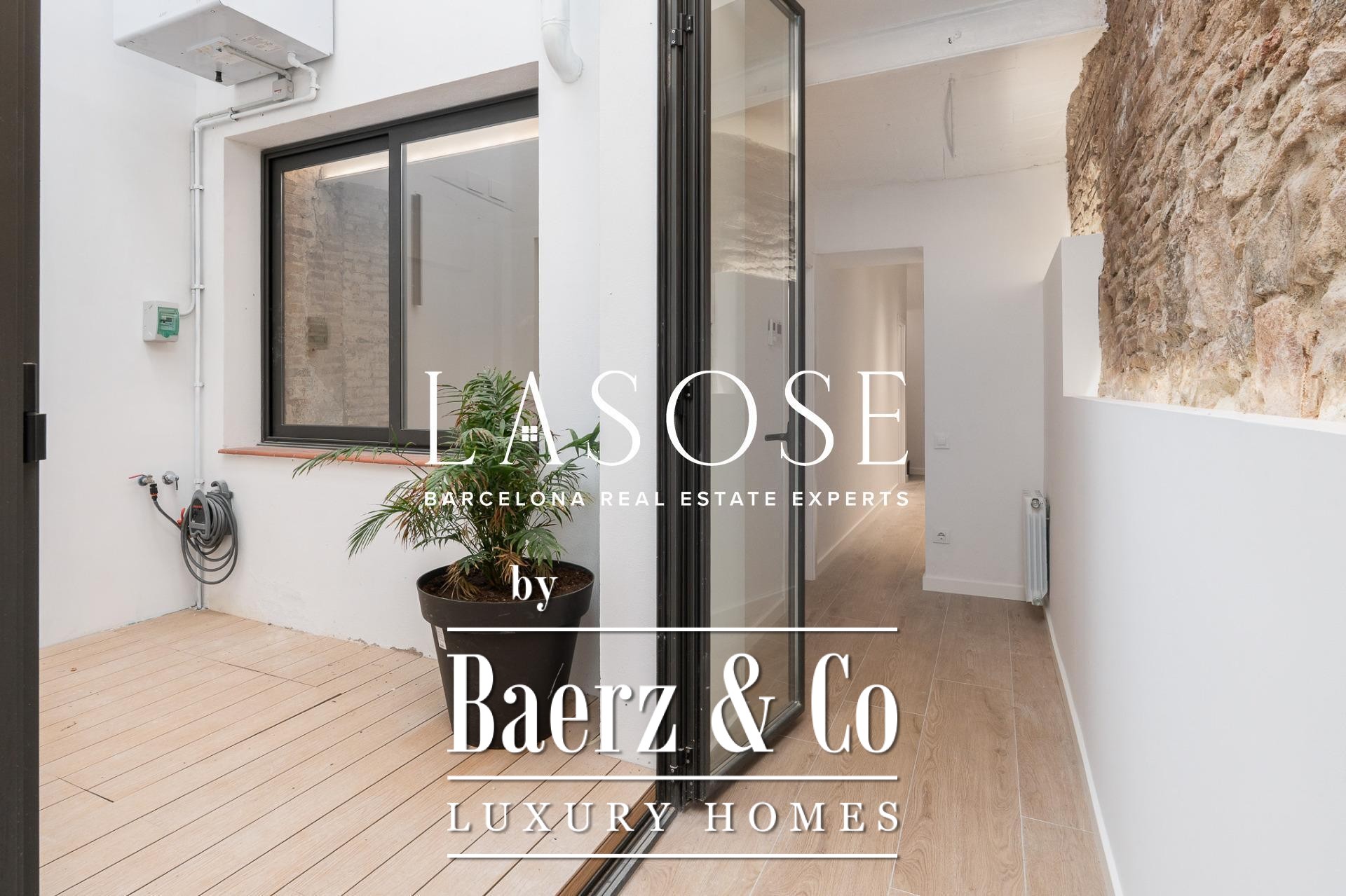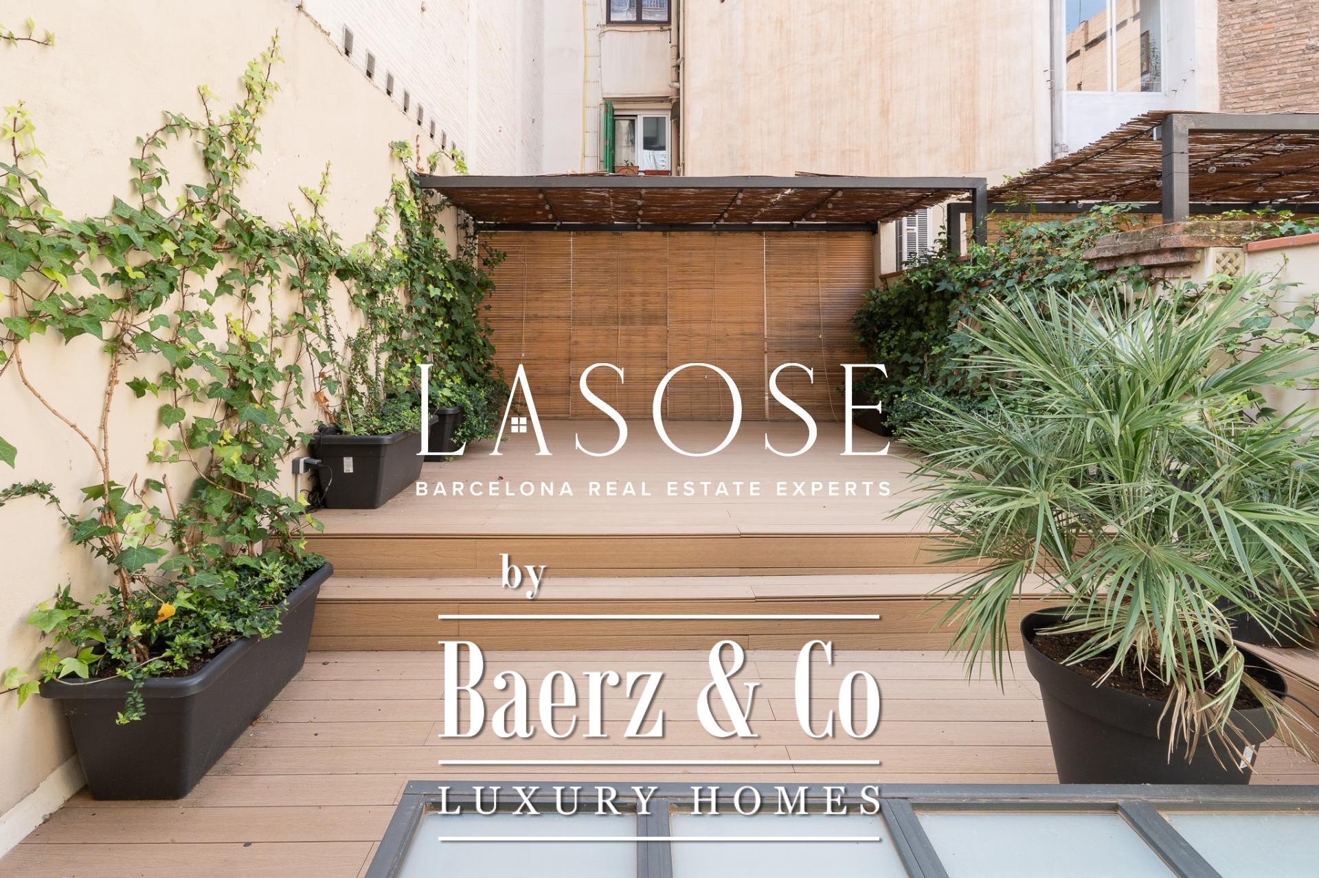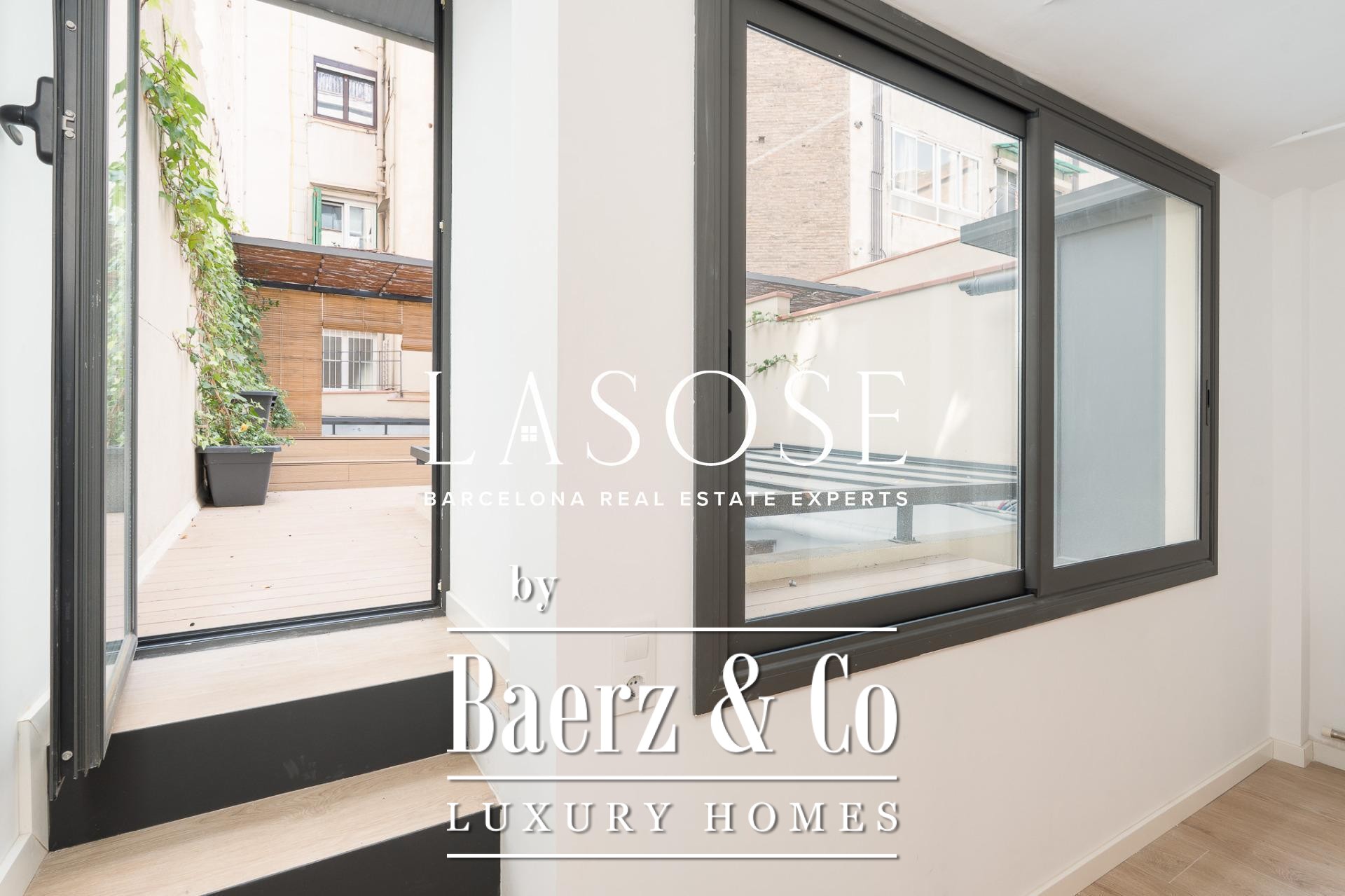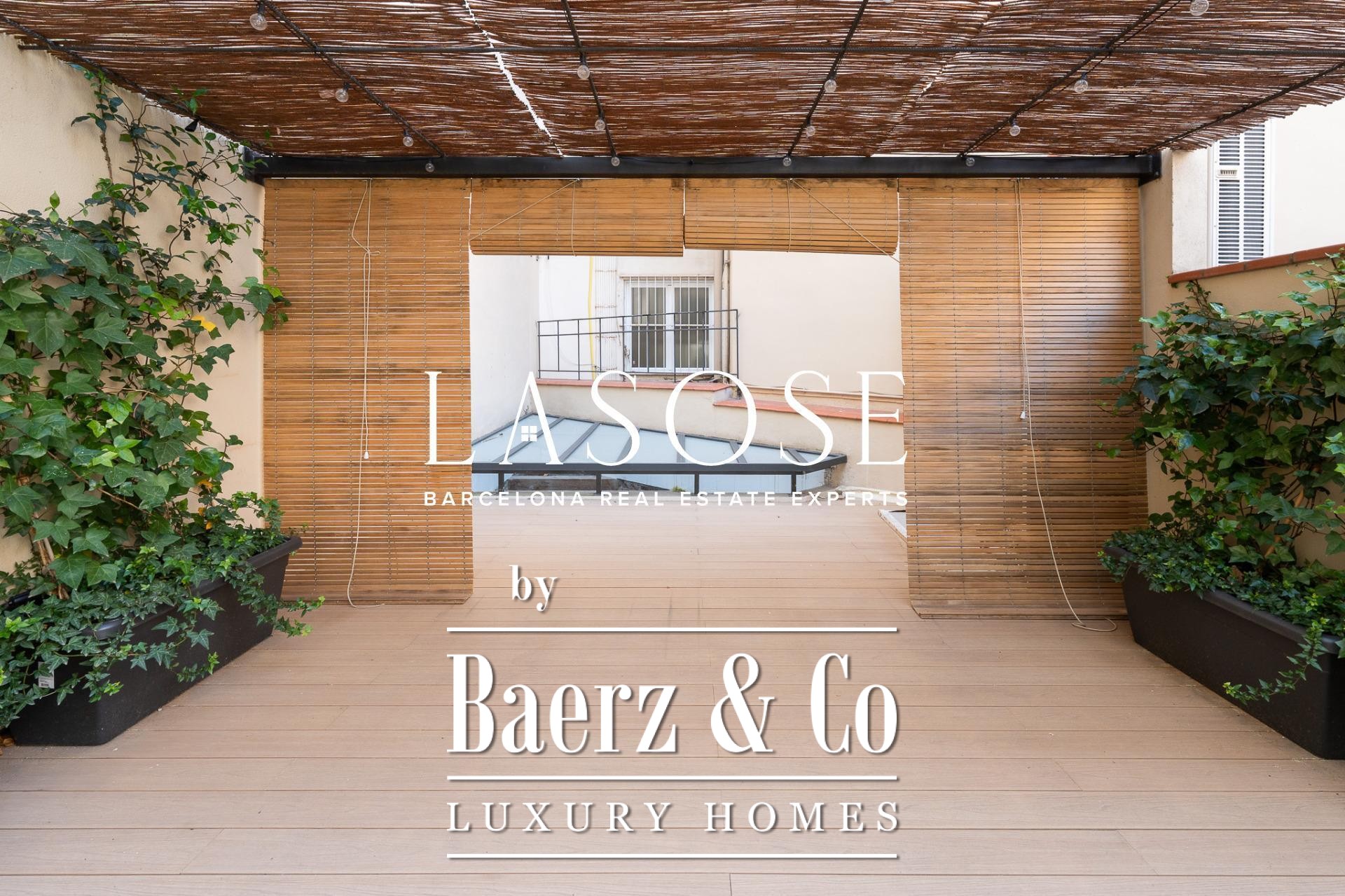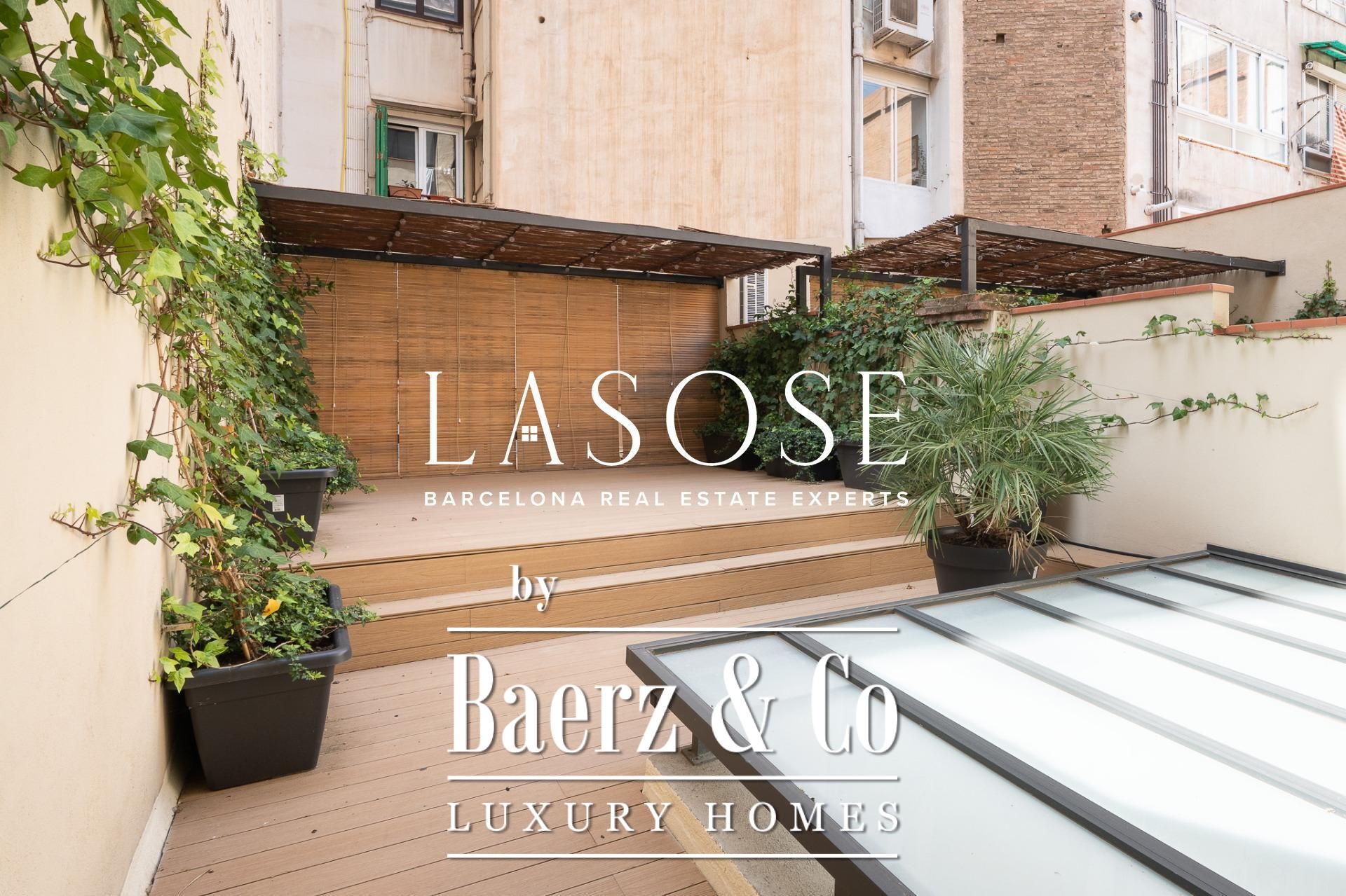 LASOSE presents an exclusive apartment in the charming neighborhood of Gràcia, located in a quiet passage, between Paseo de Sant Joan and Travessera de Gràcia. It is an inverted duplex, renovated brand new, with an area of 151 m² built and direct and independent access from the street, which gives it exceptional privacy.. . On the main floor, of 79 m², there is an open space with different levels that organize the day area. This ambience has a spacious living room, a fully equipped designer kitchen with dining space and a guest toilet.. . From the living room there is access to a charming private terrace of 45 m2, ideal for enjoying quiet moments outdoors.. . The lower floor, of 90 m², houses the sleeping area with three bedrooms, two bathrooms and a practical laundry area. The master suite stands out for its spaciousness and for having its own patio, creating an oasis of calm within the house. In addition, a versatile loft can be used as a study, dressing room or additional sleeping area. A bright central courtyard with skylights bathes this floor with natural light, providing a warm and welcoming atmosphere.. . This property has been refurbished with top quality materials, respecting and enhancing