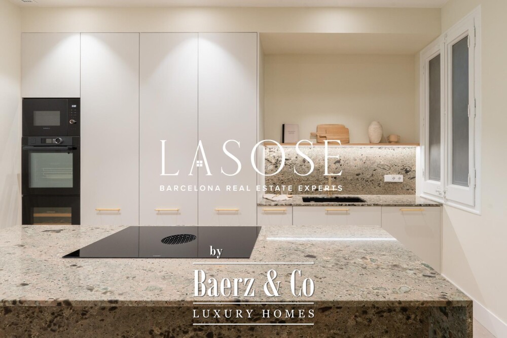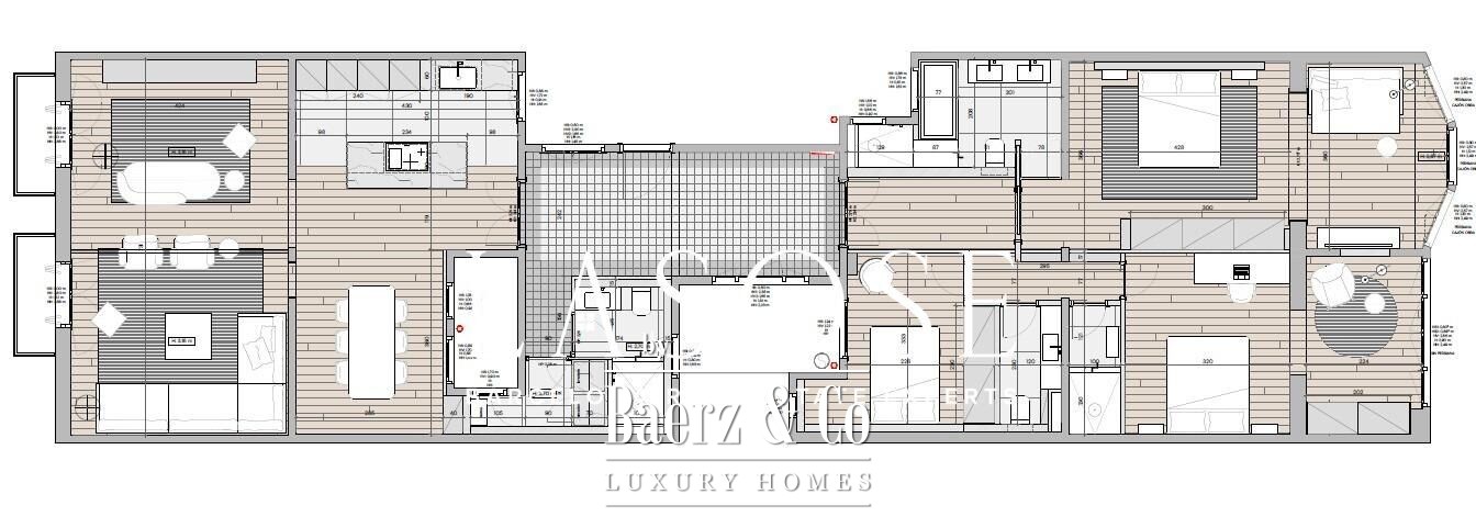 De plattegrond voorziet in vier slaapkamers en drie badkamers, waaronder drie royale suites, waarvan één met een glazen galerij die ideaal is als privévertrek of stijlvolle werkplek. De royale woon- en eetkamer, baadt in het zonlicht en staat in directe verbinding met een designkeuken, uitgerust met een Levantina marmeren werkblad, porseleinen vloeren en geïntegreerde apparatuur van De Dietrich, Bora en Liebherr, inclusief een wijnkoeler. De ruimte is flexibel; de eetkamer kan eenvoudig worden ingericht als vierde slaapkamer.