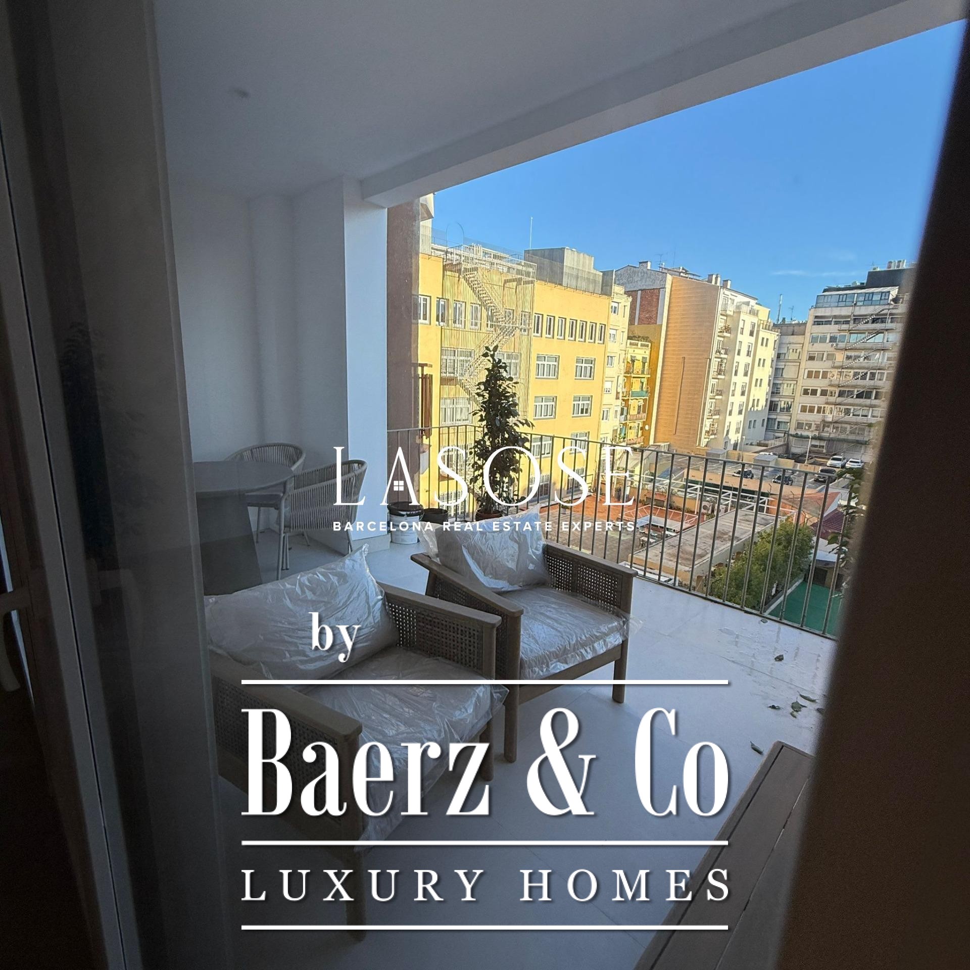 Originele hoge plafonds, sierlijke plafonddetails en traditionele dubbele houten deuren weerspiegelen het architecturale erfgoed van Barcelona, terwijl de royale multifunctionele woon-, eet- en keukenruimte baadt in natuurlijk licht en directe toegang biedt tot een privéterras van 18 m². Het terras is ingericht als lounge en eetruimte en verbindt zo het binnenleven naadloos met het befaamde buitenleven van de stad.